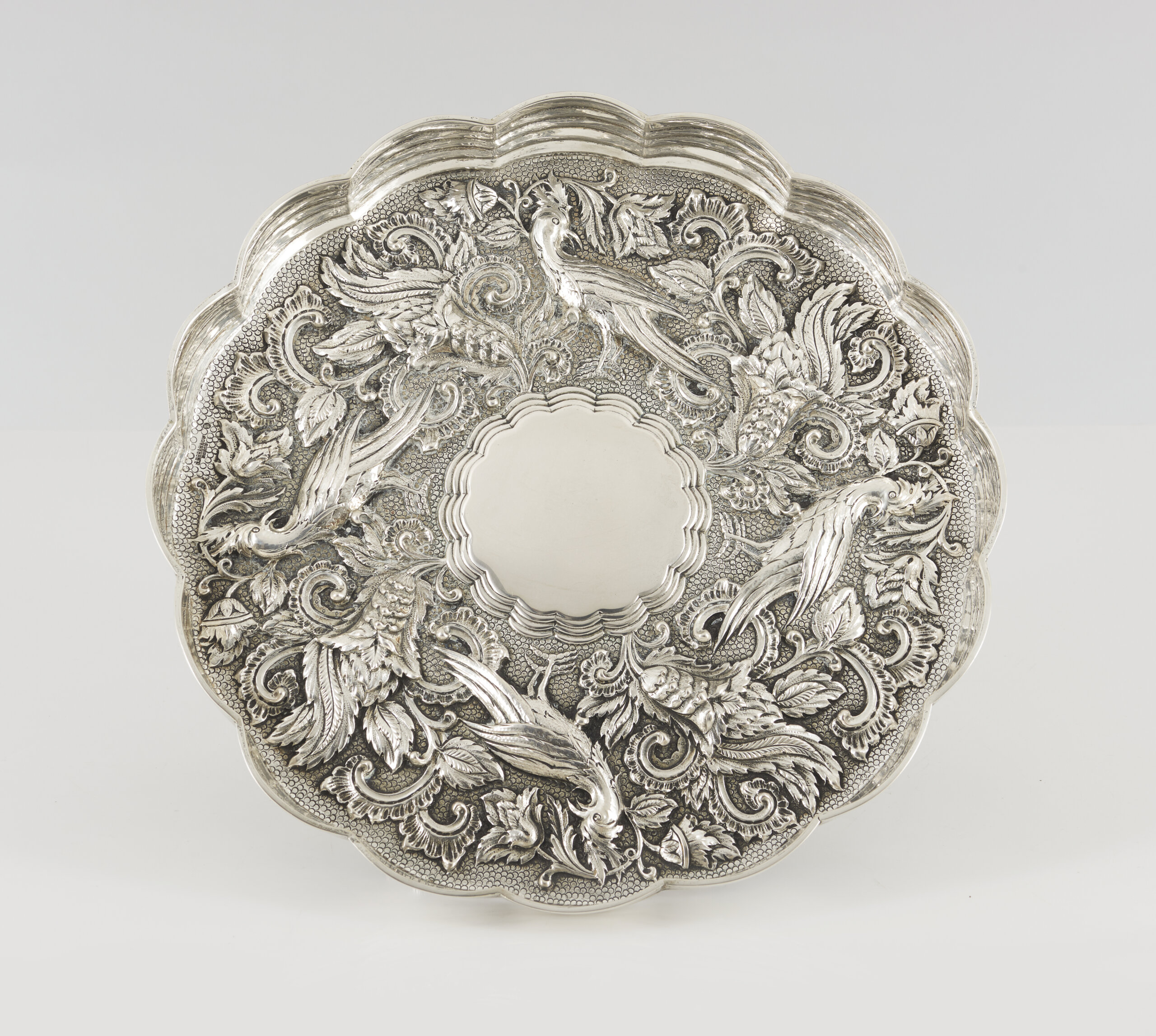 Decoração relevada representando motivos florais, concheados e pássaros