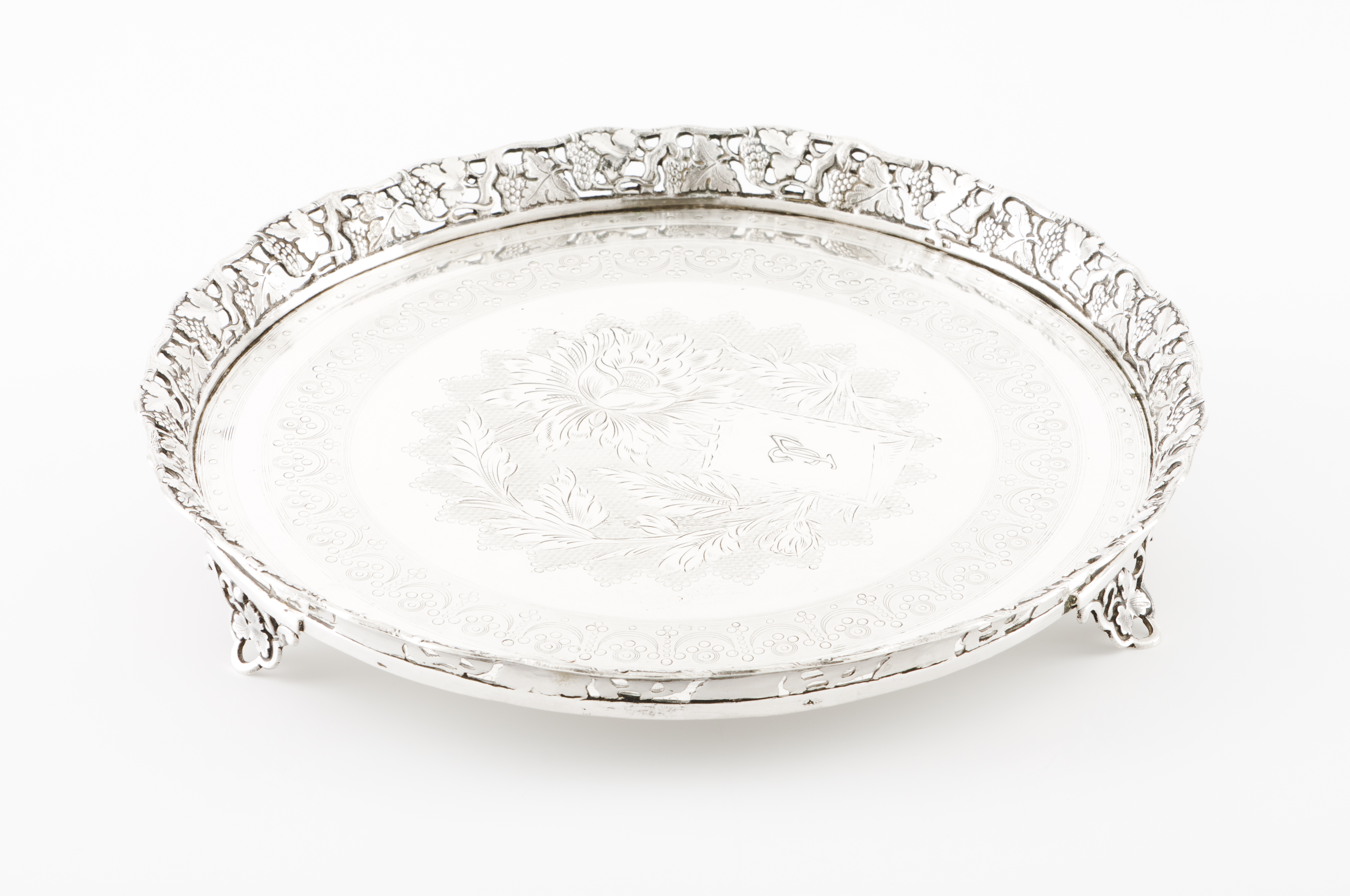 Fundo cinzelado com cercadura guilhochada e centro com motivos florais e reserva com iniciais JG