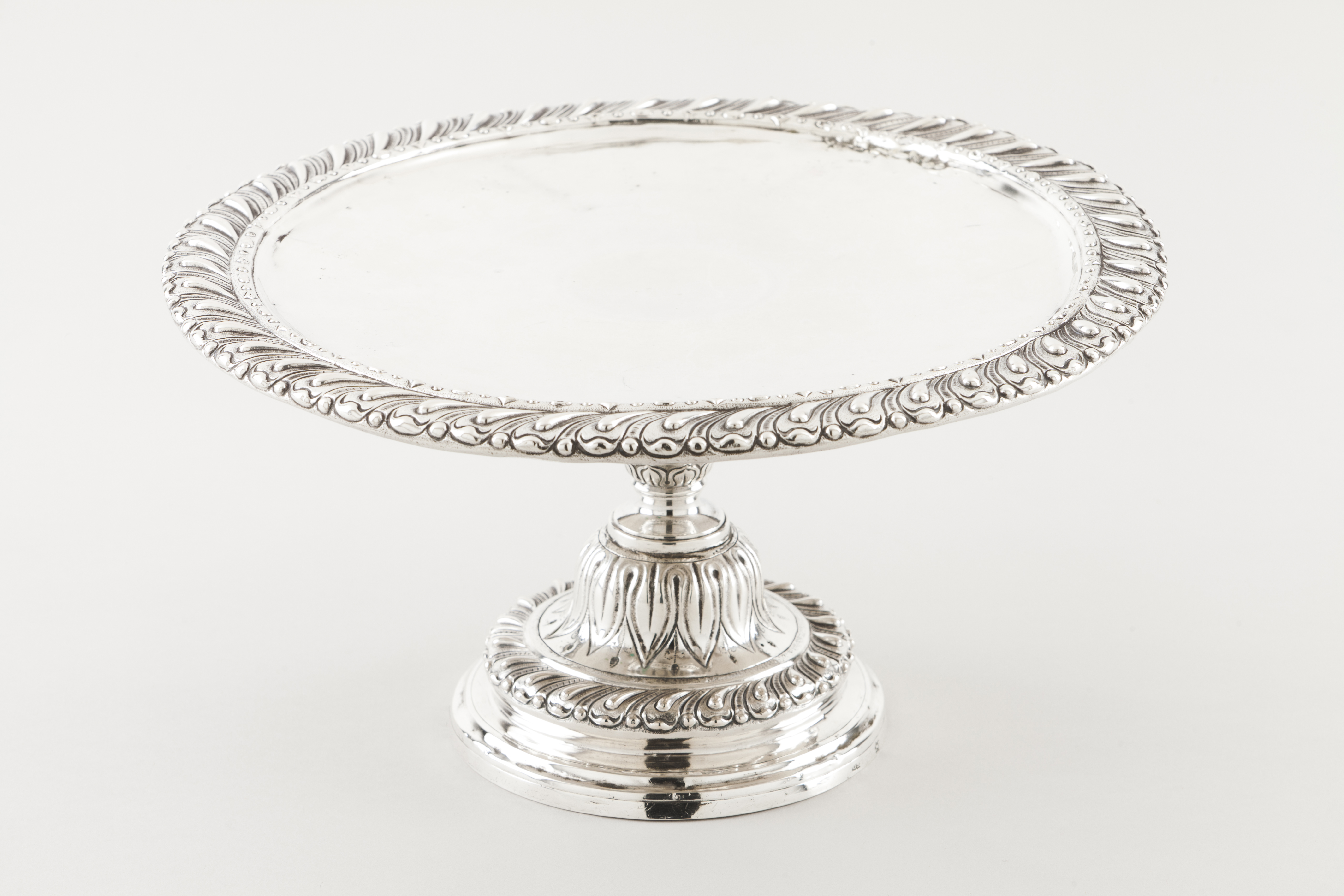 Centro liso com aba relevada e gravada com friso de godrões assente em pé torneado com nó canelado e base alteada com idêntica decoração de godrões e folhas estilizadas