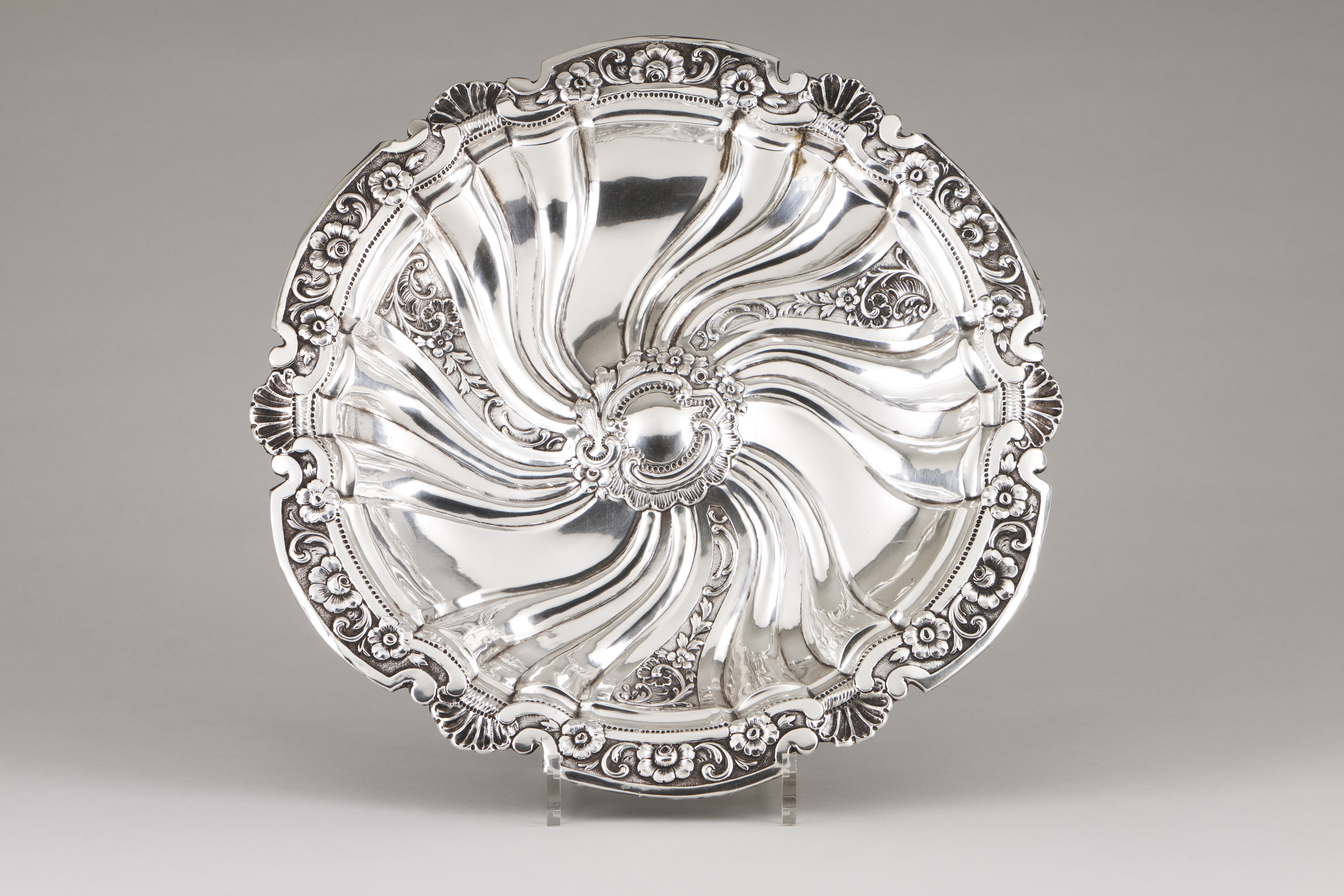 Decoração relevada, cinzelada e espiralada ao gosto rocaille com concheados e flores, centro com cartela