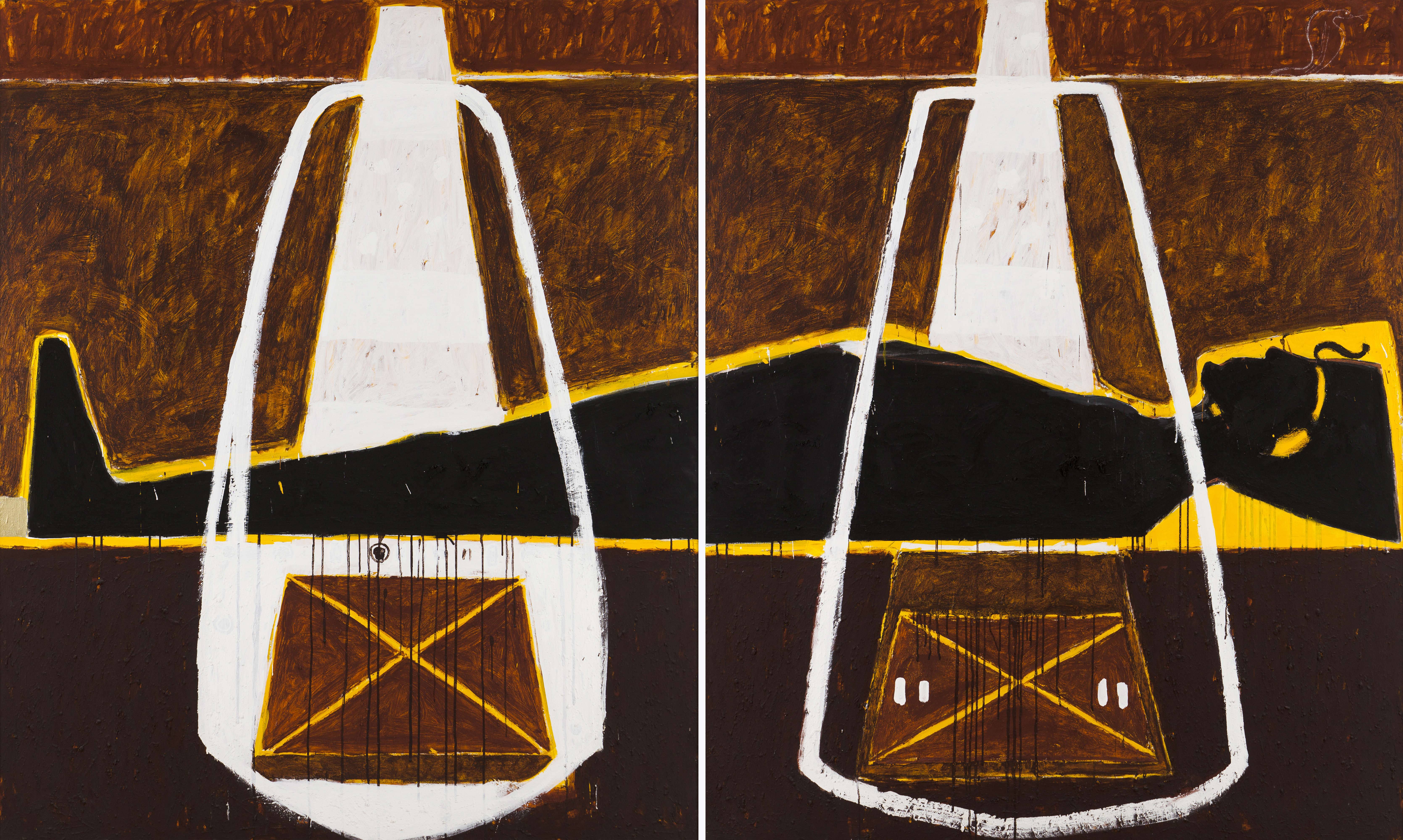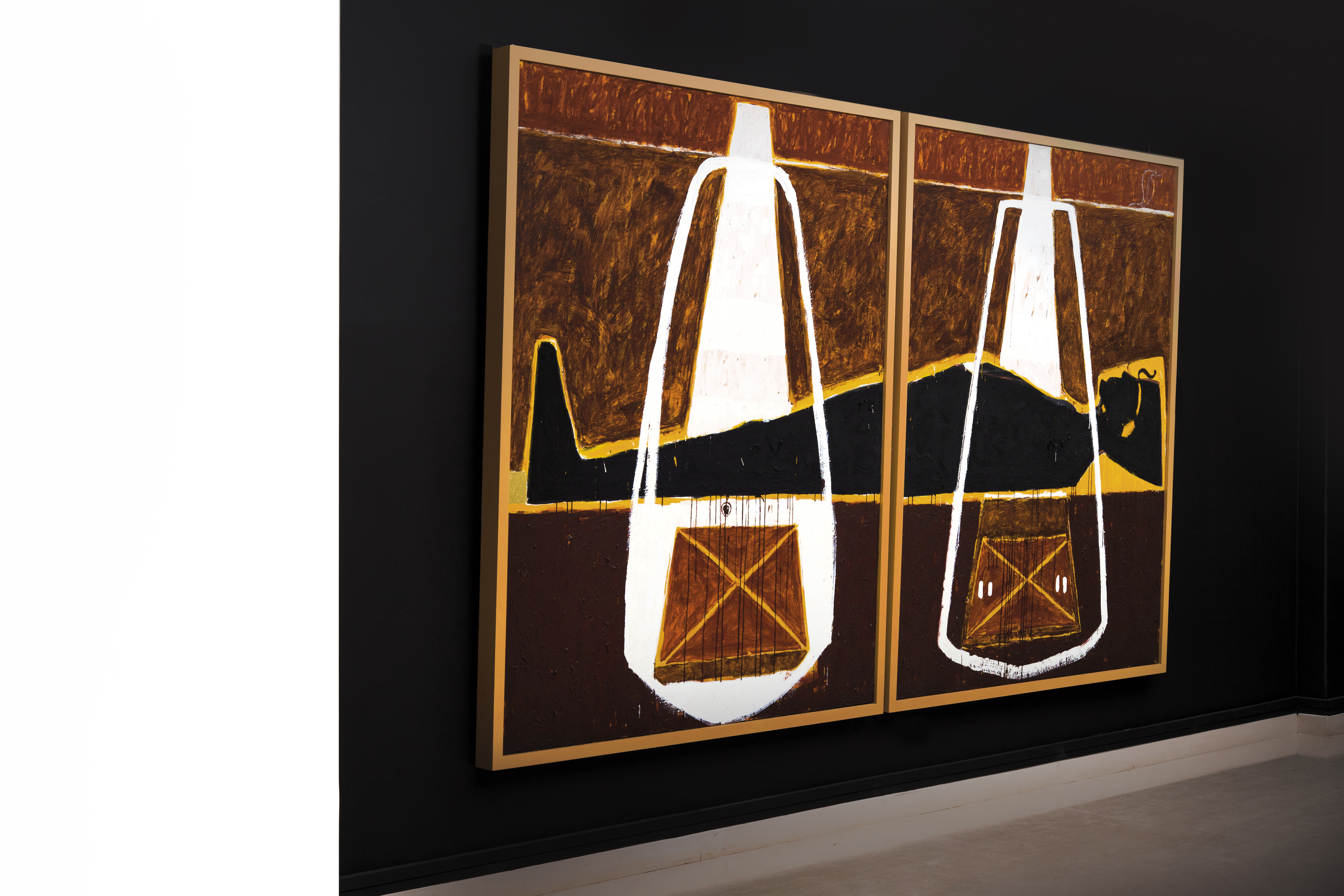 Dans ce grand diptyque, le défunt est un pharaon, homme déjà divinisé de son vivant et prêt à accom- plir son voyage dans un glorieux au-delà. Un cerne jaune indique l’aura sacrée qui entoure ce corps et suggère l’or d’un somptueux sarcophage. Les strates d’ocres terreuses du fond maçonné dans la partie supérieure du tableau fixent la silhouette dans la sérénité d’un ici-bas qui confère par contraste encore davantage de légèreté à son âme sur le point d’accéder à l’immortalité. Deux grandes structures blanches déploient leurs bras vers les deux coffrets sacrés placés sous la silhouette et ouvrent des ver- ticales lumineuses vers le haut du tableau, tandis que des coulées noires enracinent le personnage vers le bas. De la terre à la terre, pour le corps, et vers le cosmos pour l’esprit.