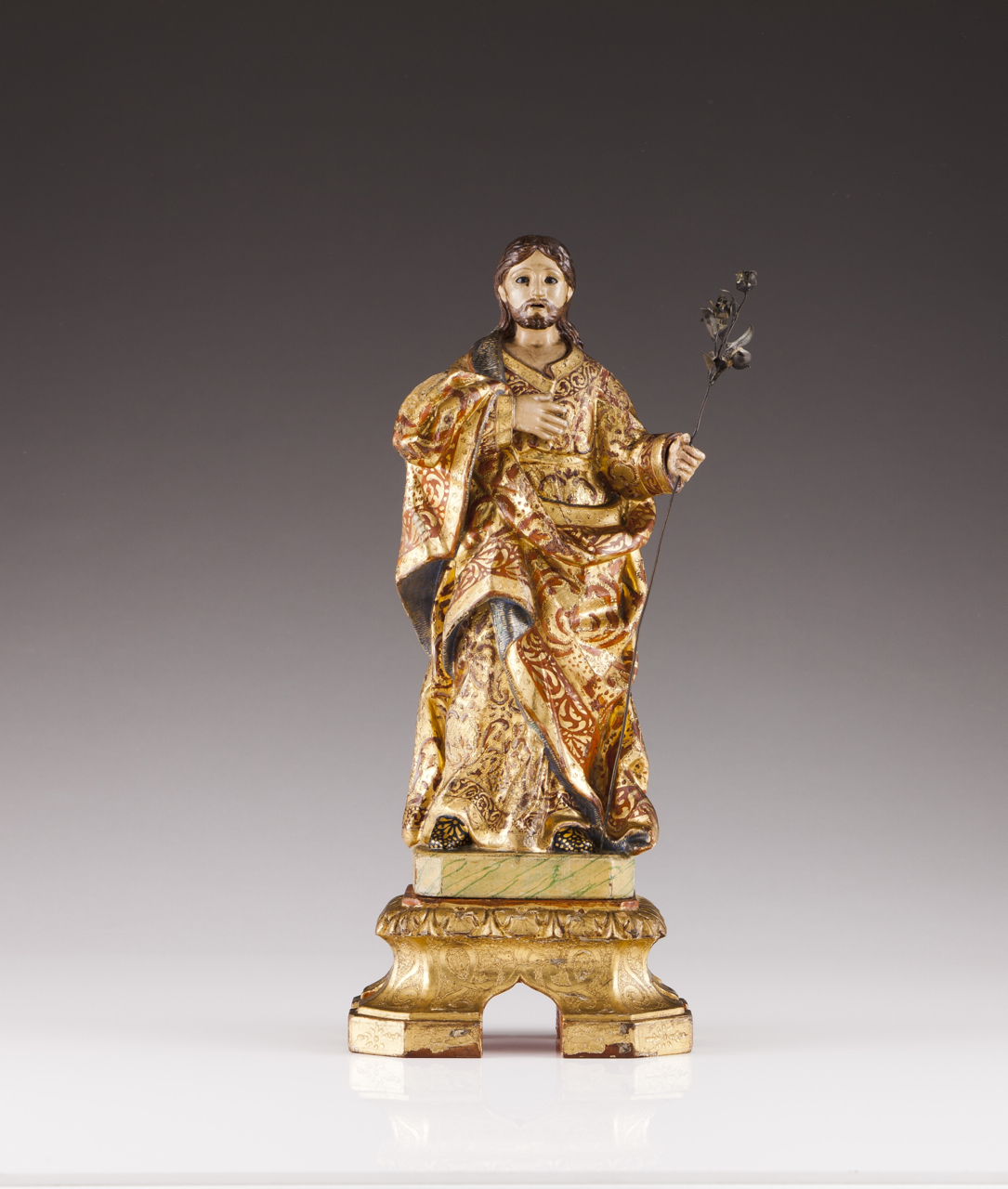 Escultura em madeira policromada e dourada com açucena em prata