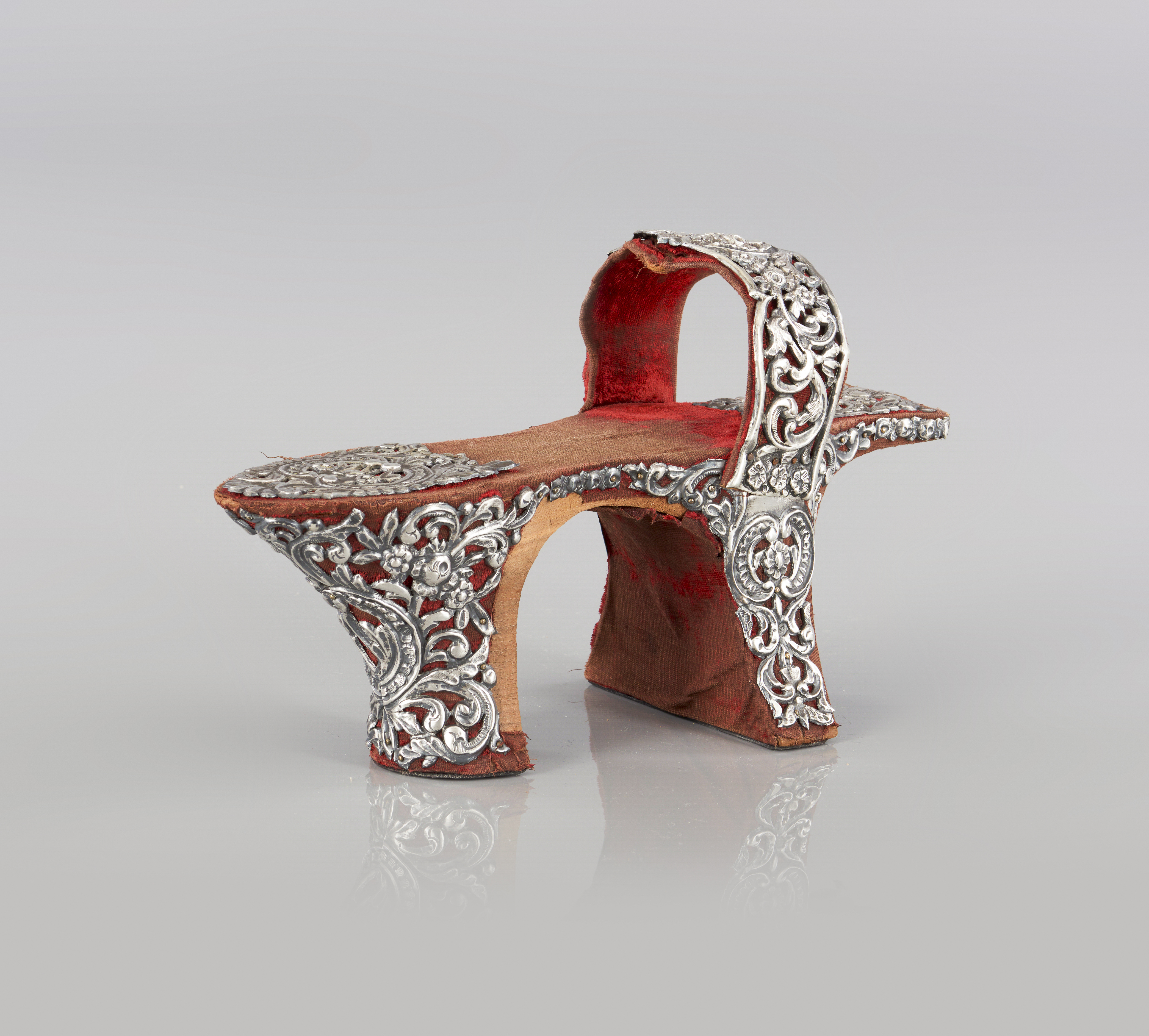 Estrutura em madeira, forrada a veludo vermelho e revestida a prata profusamente decorada com motivos vegetalistas repuxados e cinzelados.