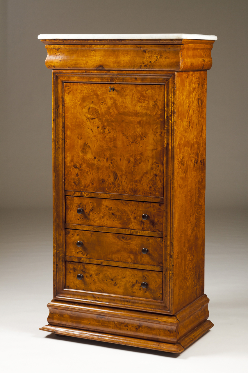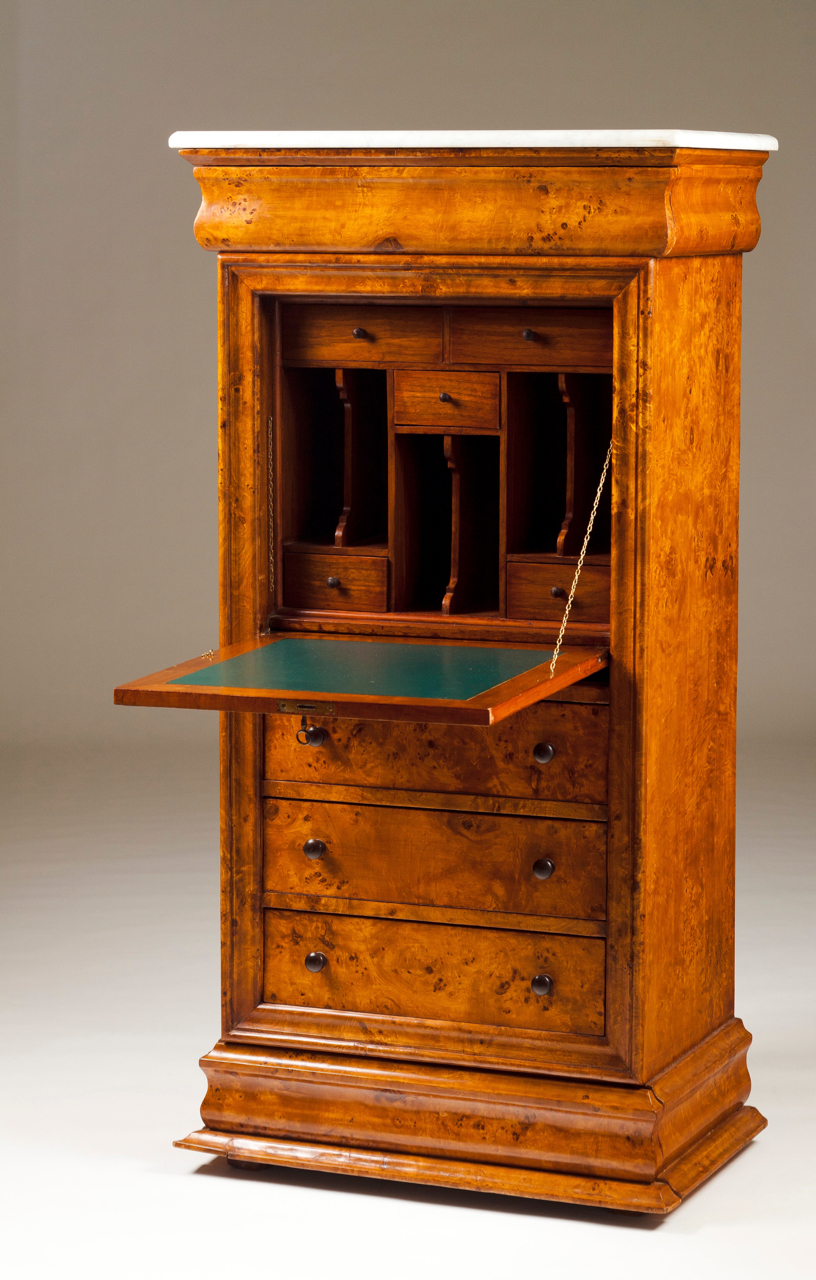 Interior com tampo de escrita forrado a pele e cinco gavetinhas e escaninhos