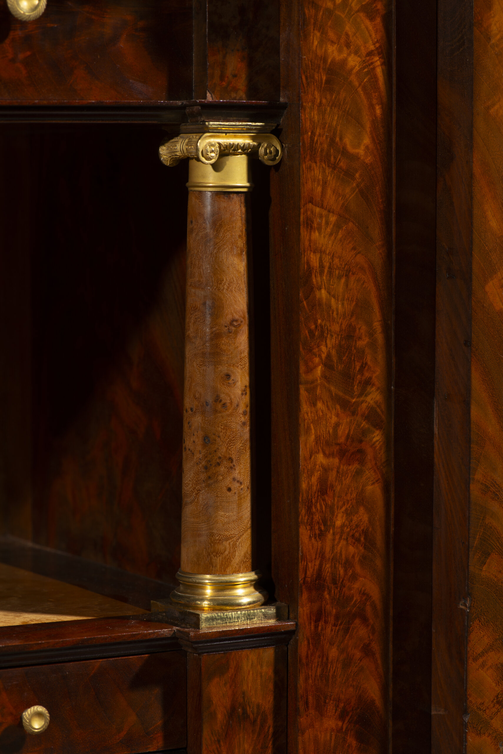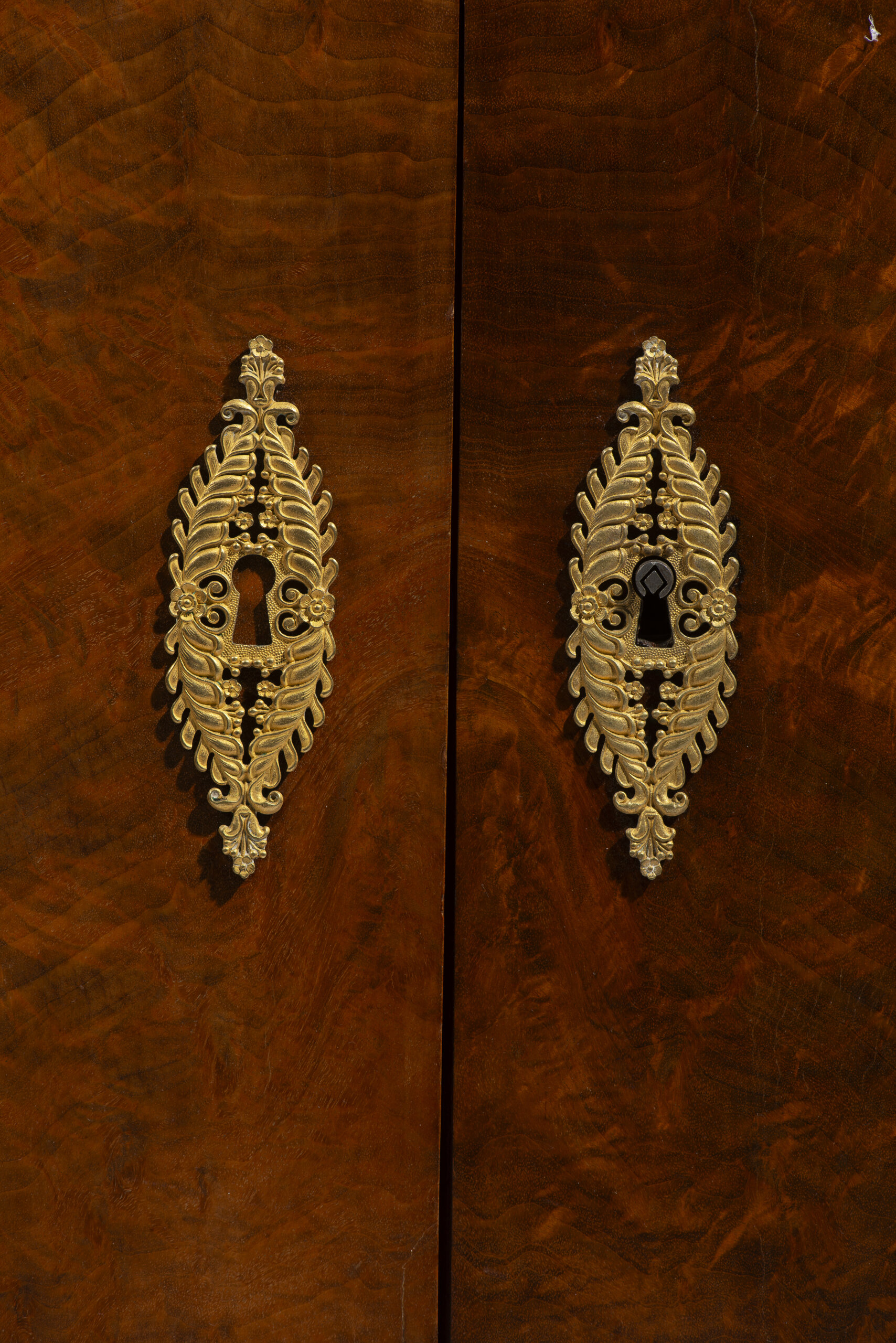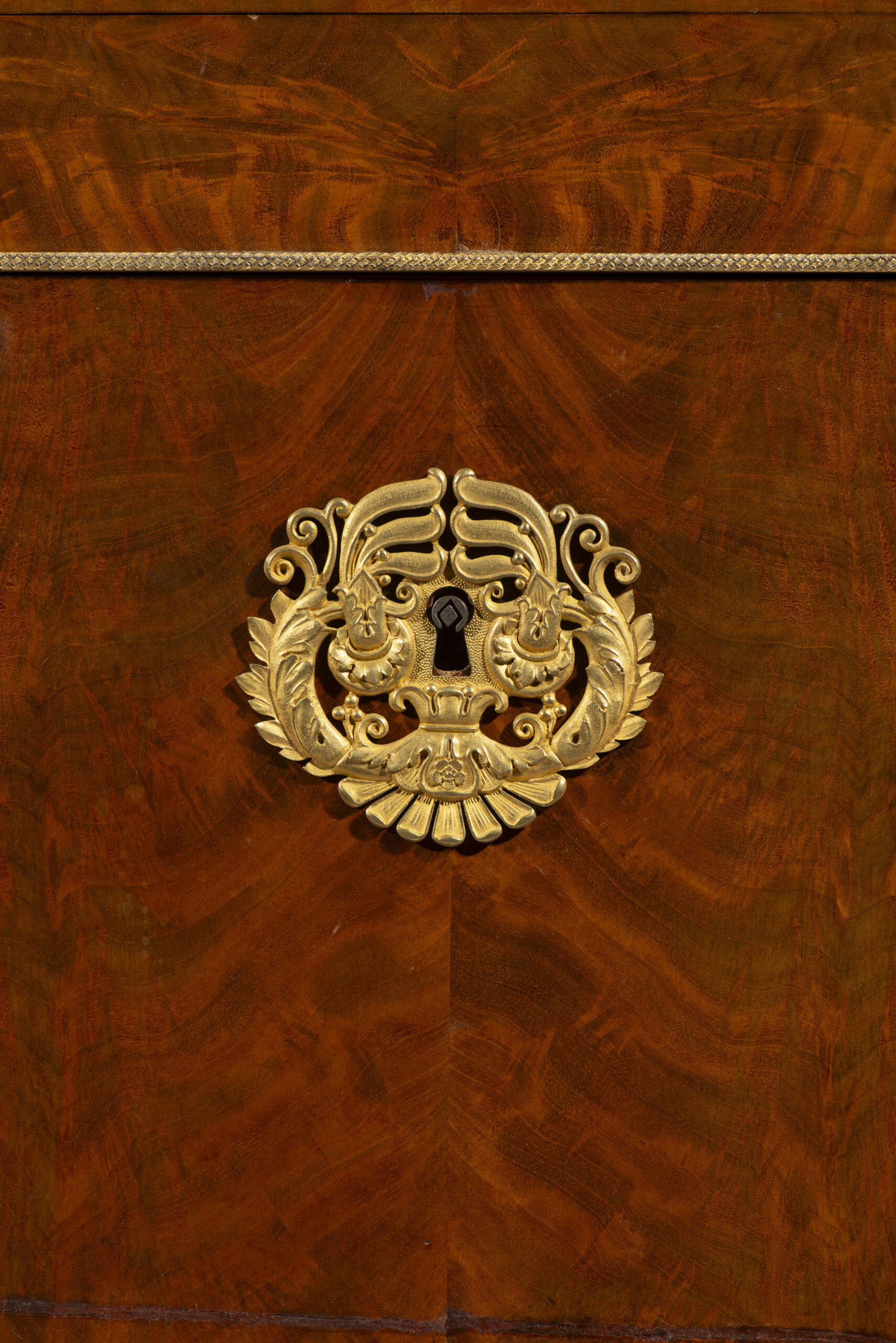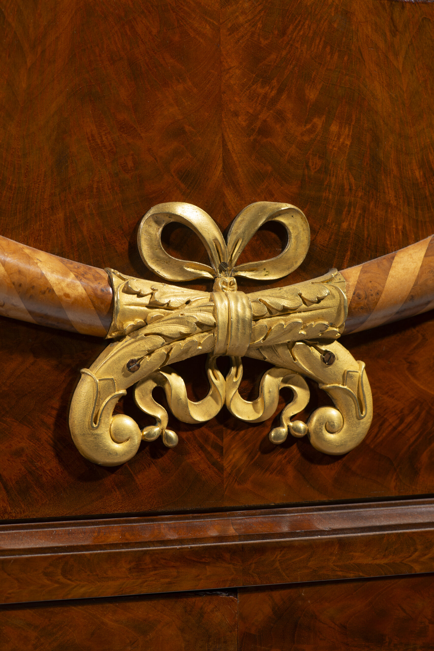 Folheada a mogno de veio flamejado, com aplicações em bronze dourado (ormolu) e elementos folheados a raiz de narra e ácer