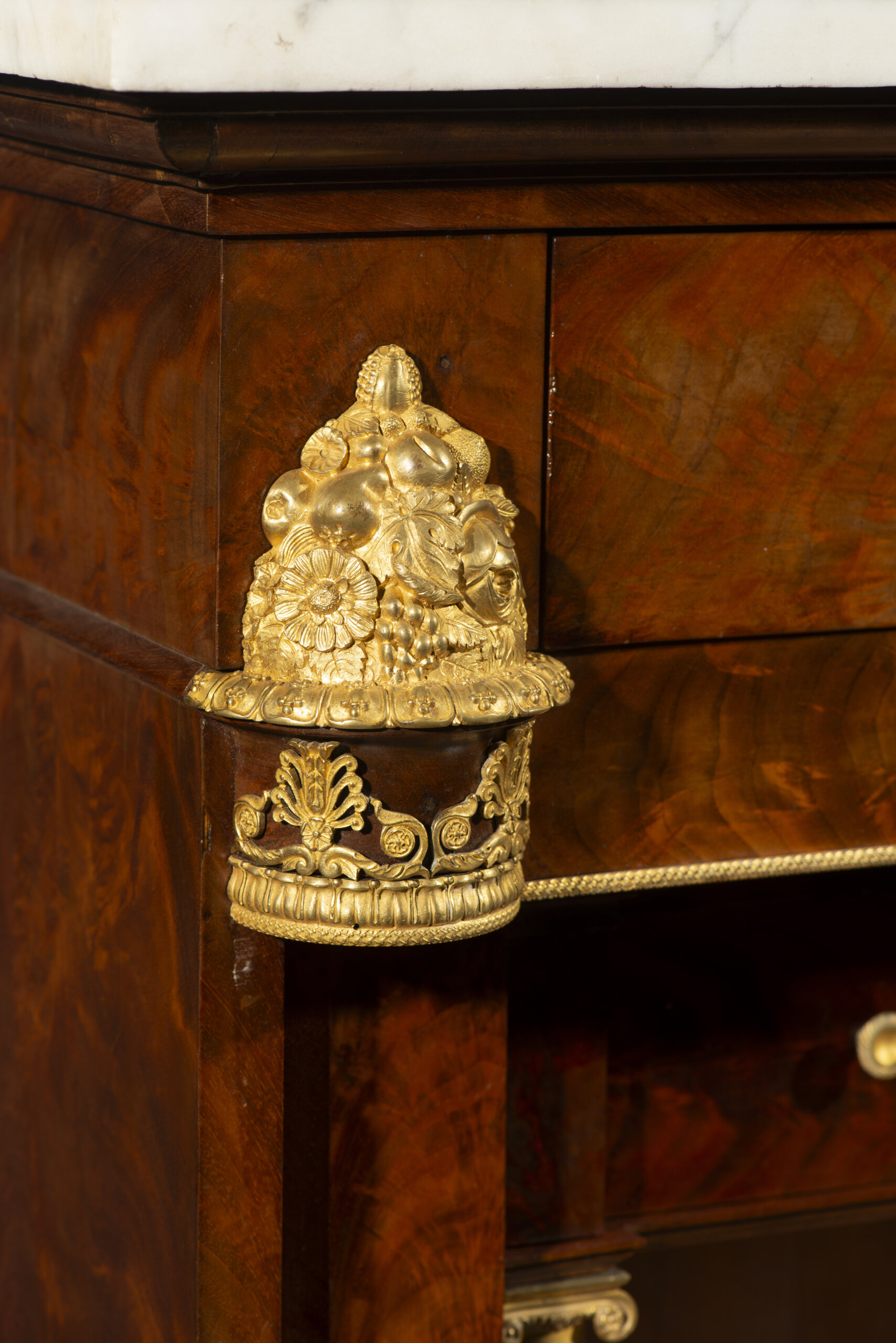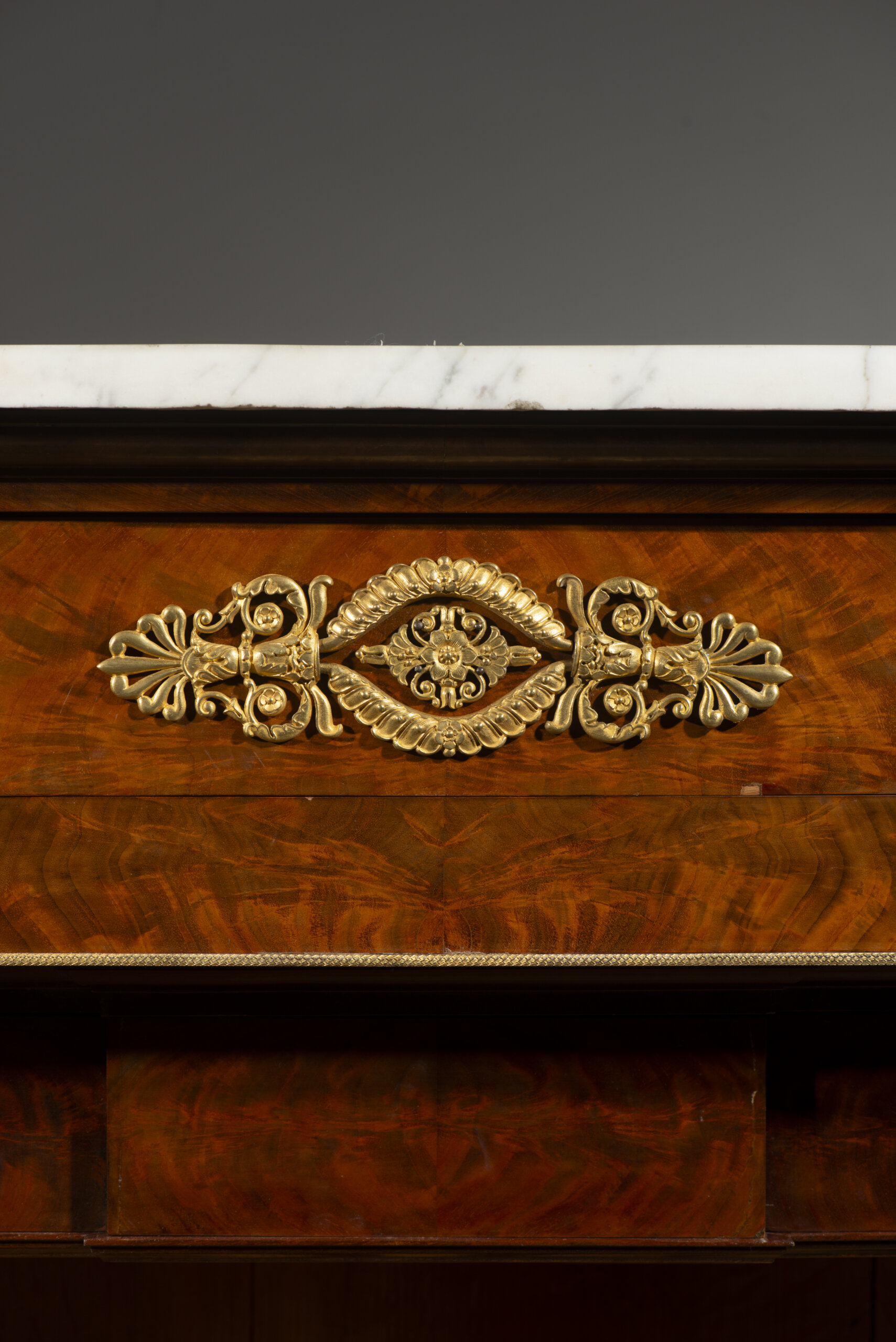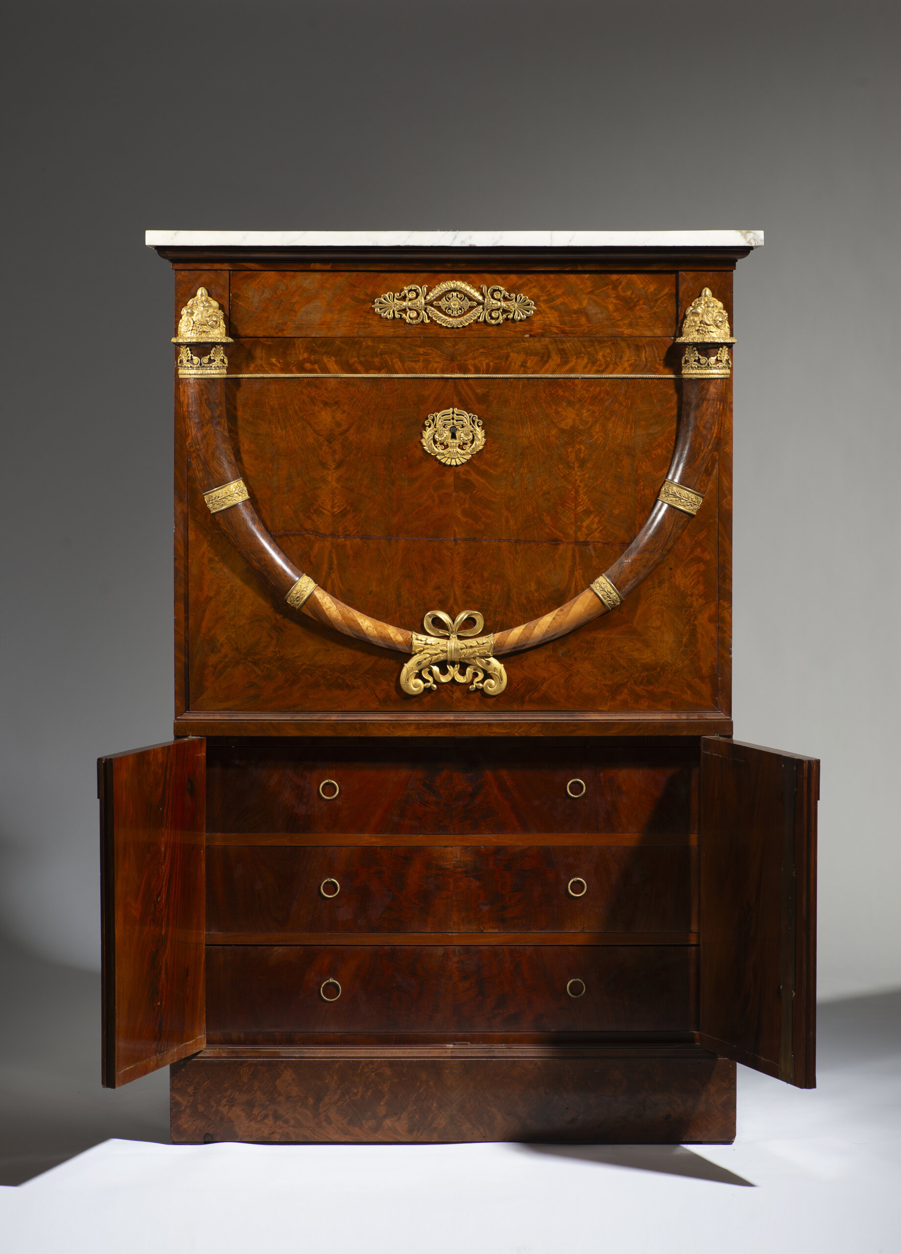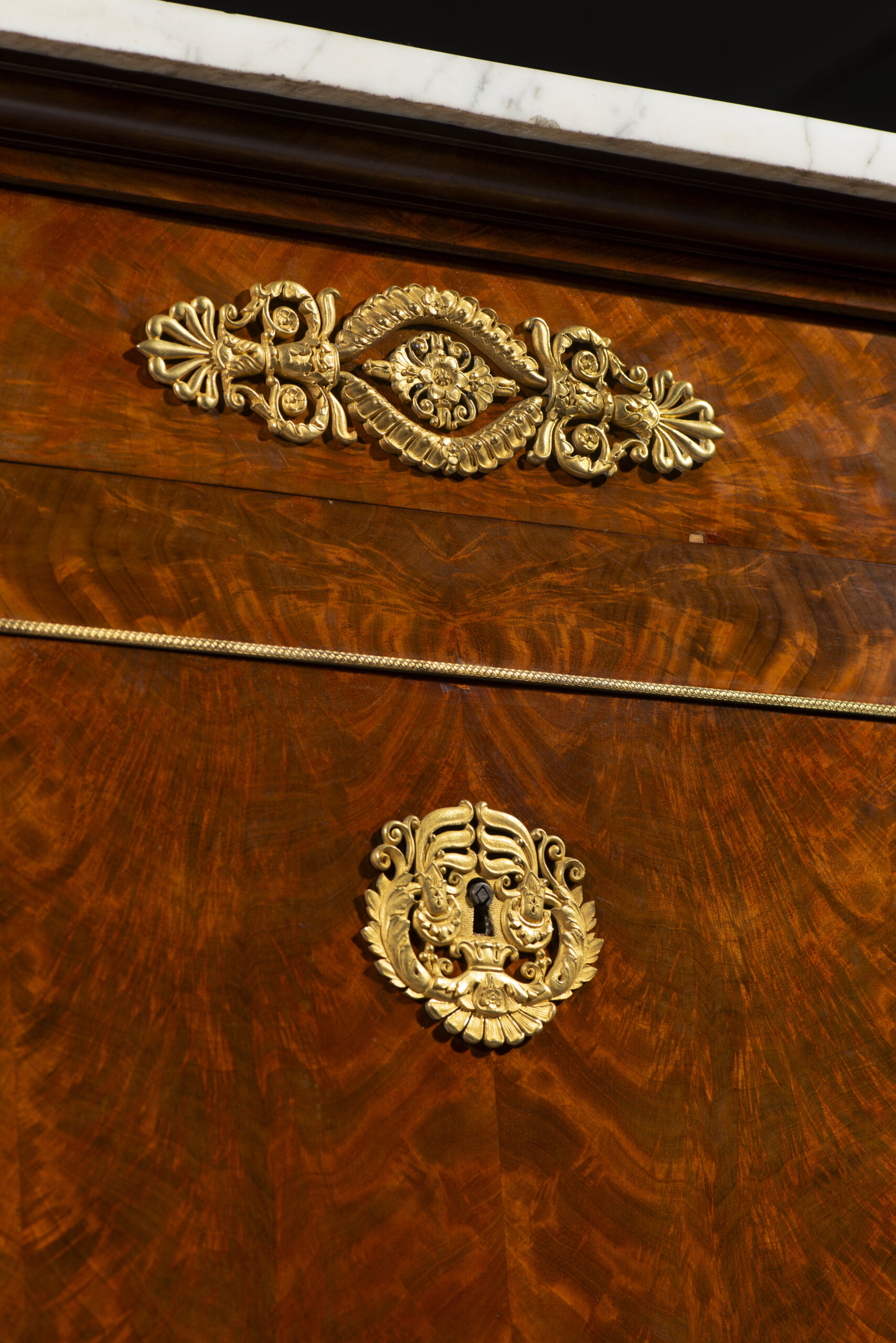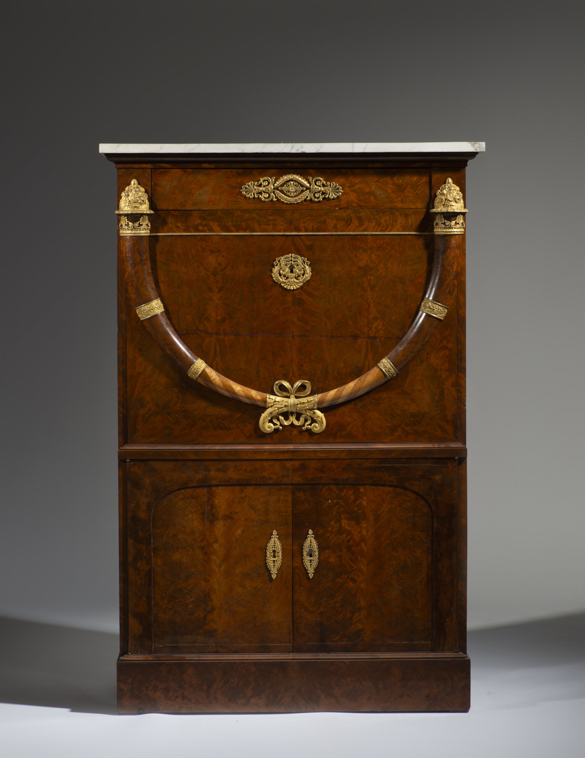 Folheada a mogno de veio flamejado, com aplicações em bronze dourado (ormolu) e elementos folheados a raiz de narra e ácer