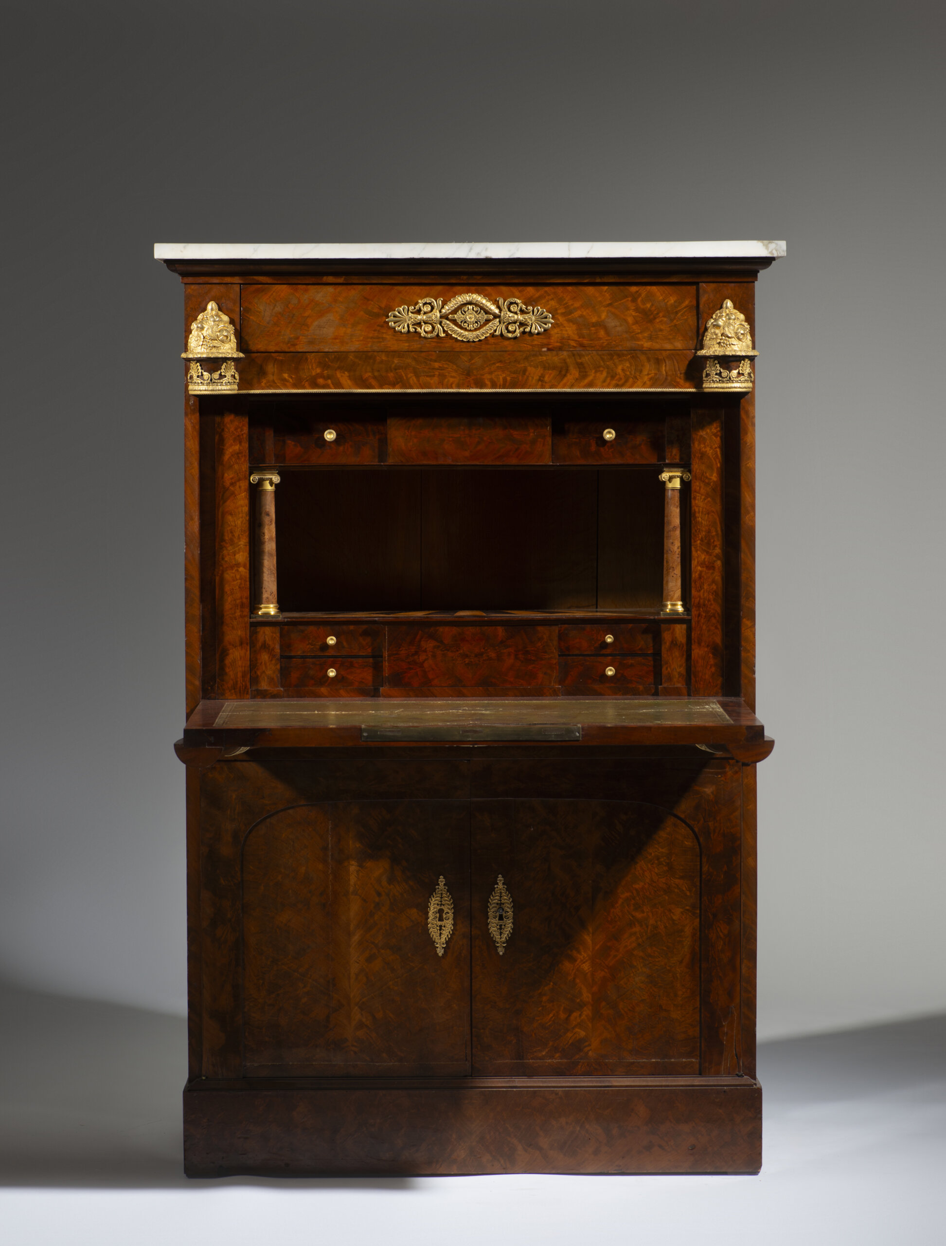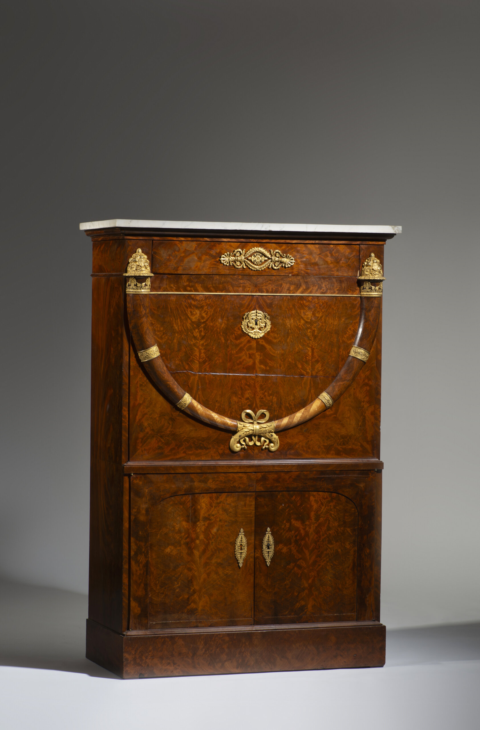 Estrutura de dois corpos, composta por corpo superior com uma gaveta decorada ao centro com aplique de volutas e palmetas em bronze dourado e tampo de abater guarnecido na frente com um par de cornucópias aplicadas, com fustes em torção helicoidal folheados a raiz de narra e ácer, unidas ao centro por fecho de bronze dourado em forma de laço, rematadas por folhas de acanto e coroadas por pináculos de bronze dourado representando corbelhas de frutos e flores
