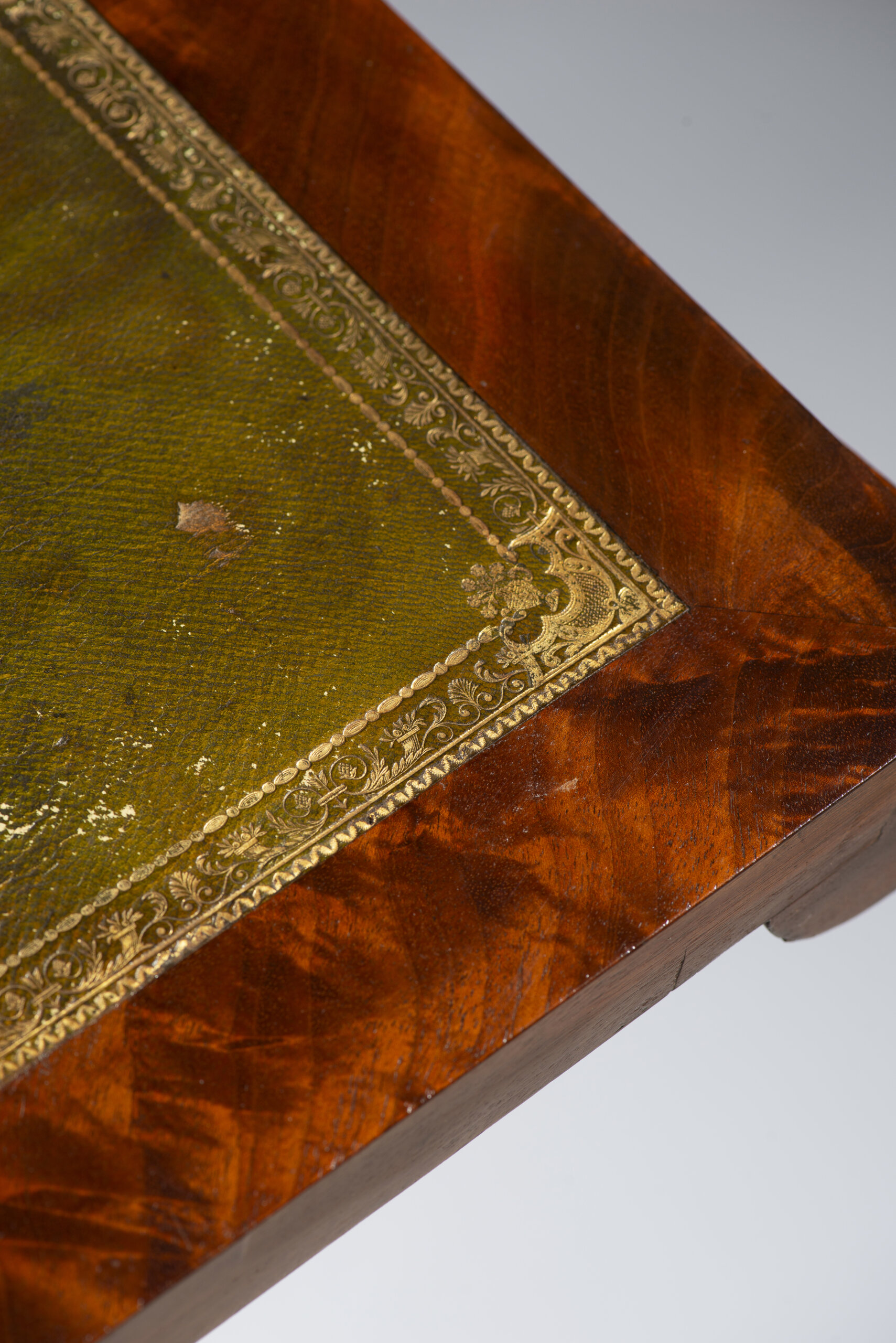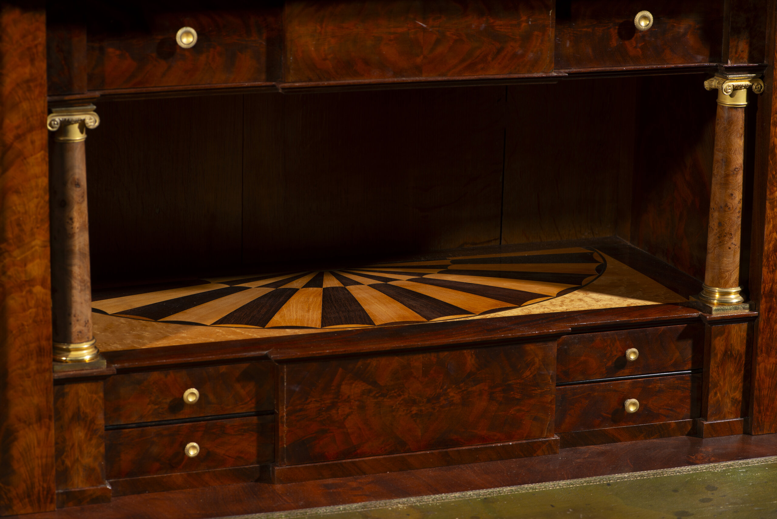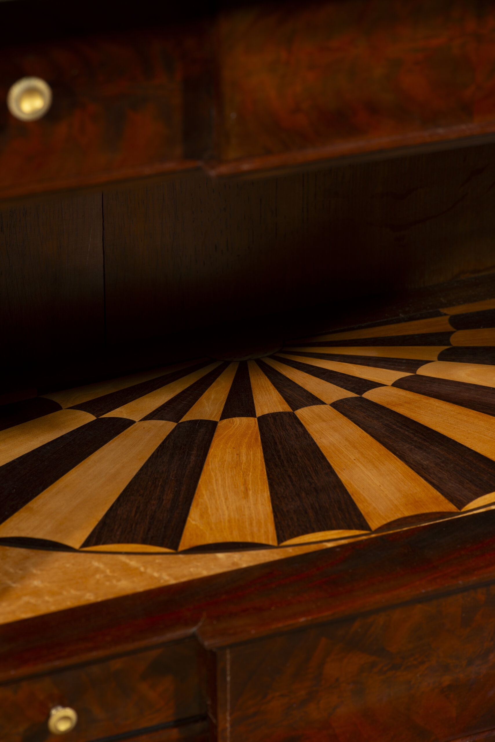 Interior do corpo superior com tampo de escrita forrado a couro verde com friso gravado a dourado, oito gavetinhas (seis com pequenos puxadores em bronze dourado), e nicho central ladeado por colunas clássicas, com tampo interior decorado com trabalho de marchetaria formando padrão radial em leque