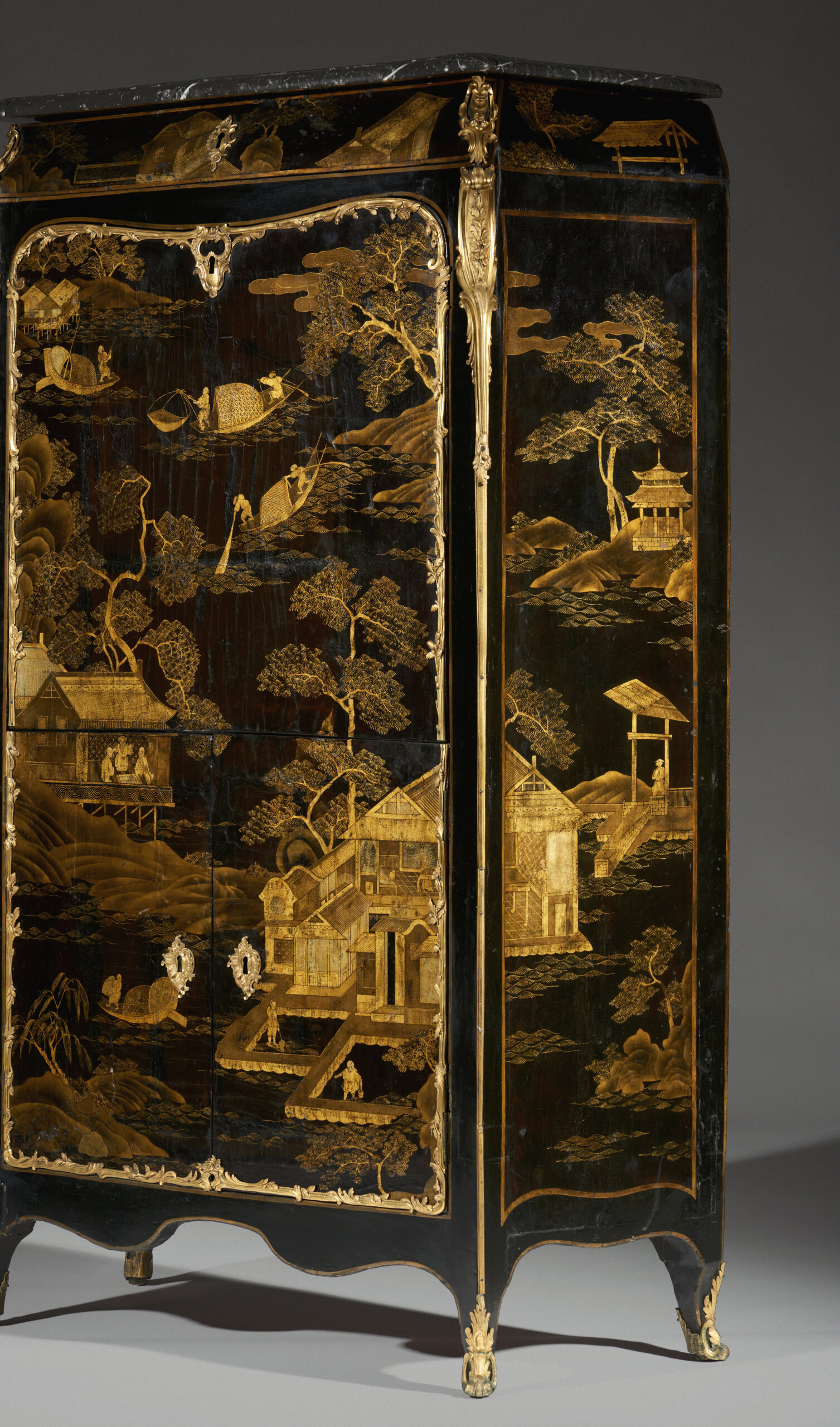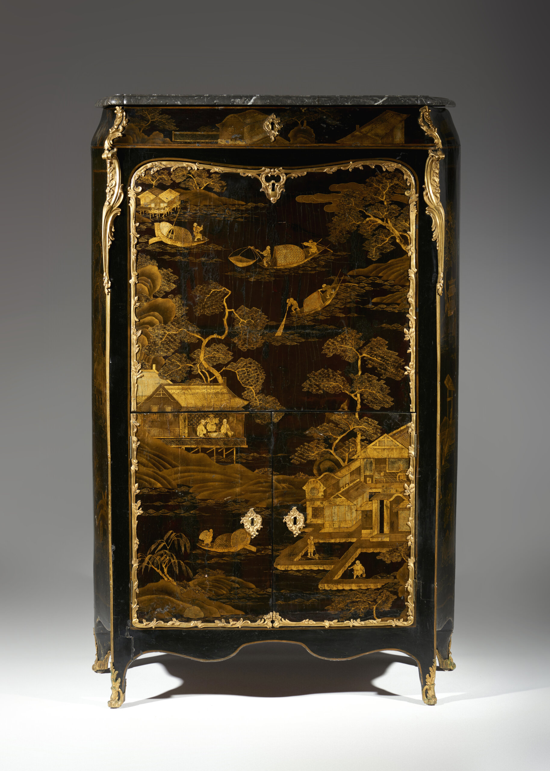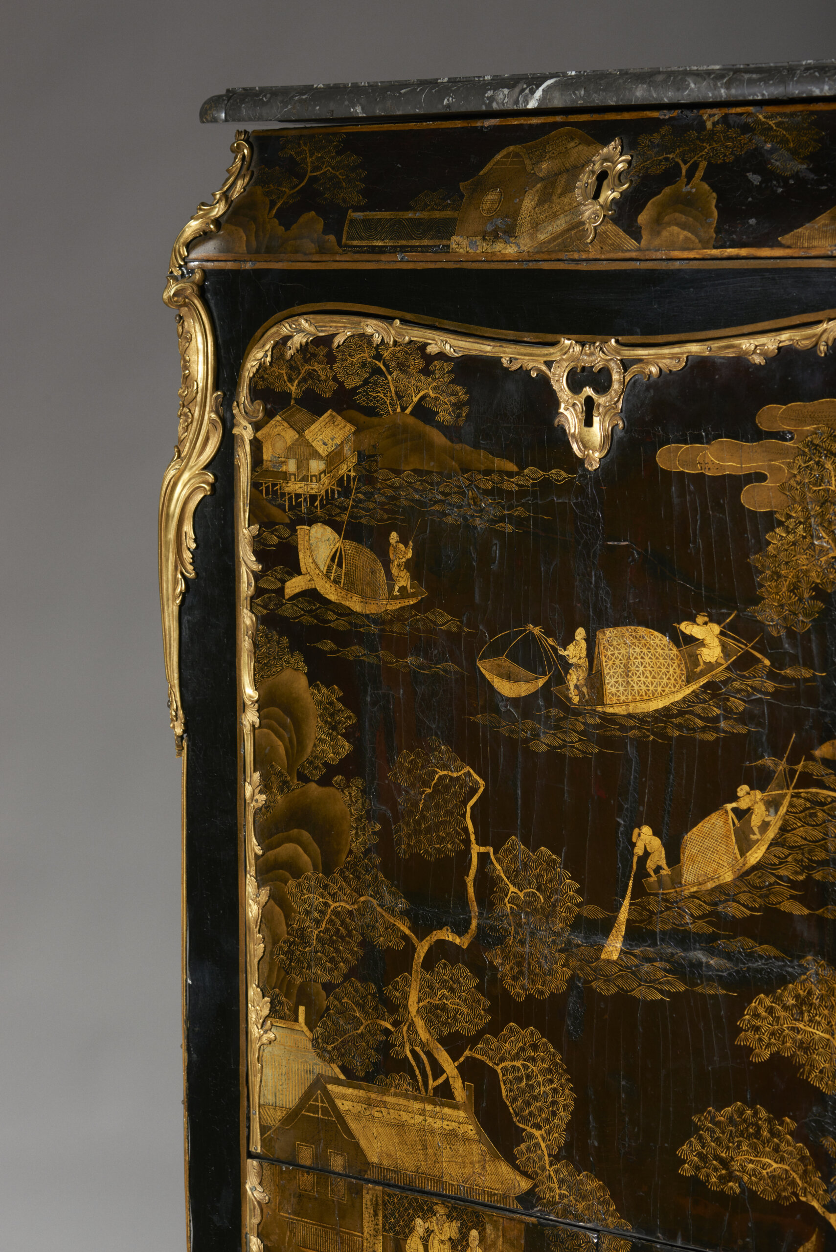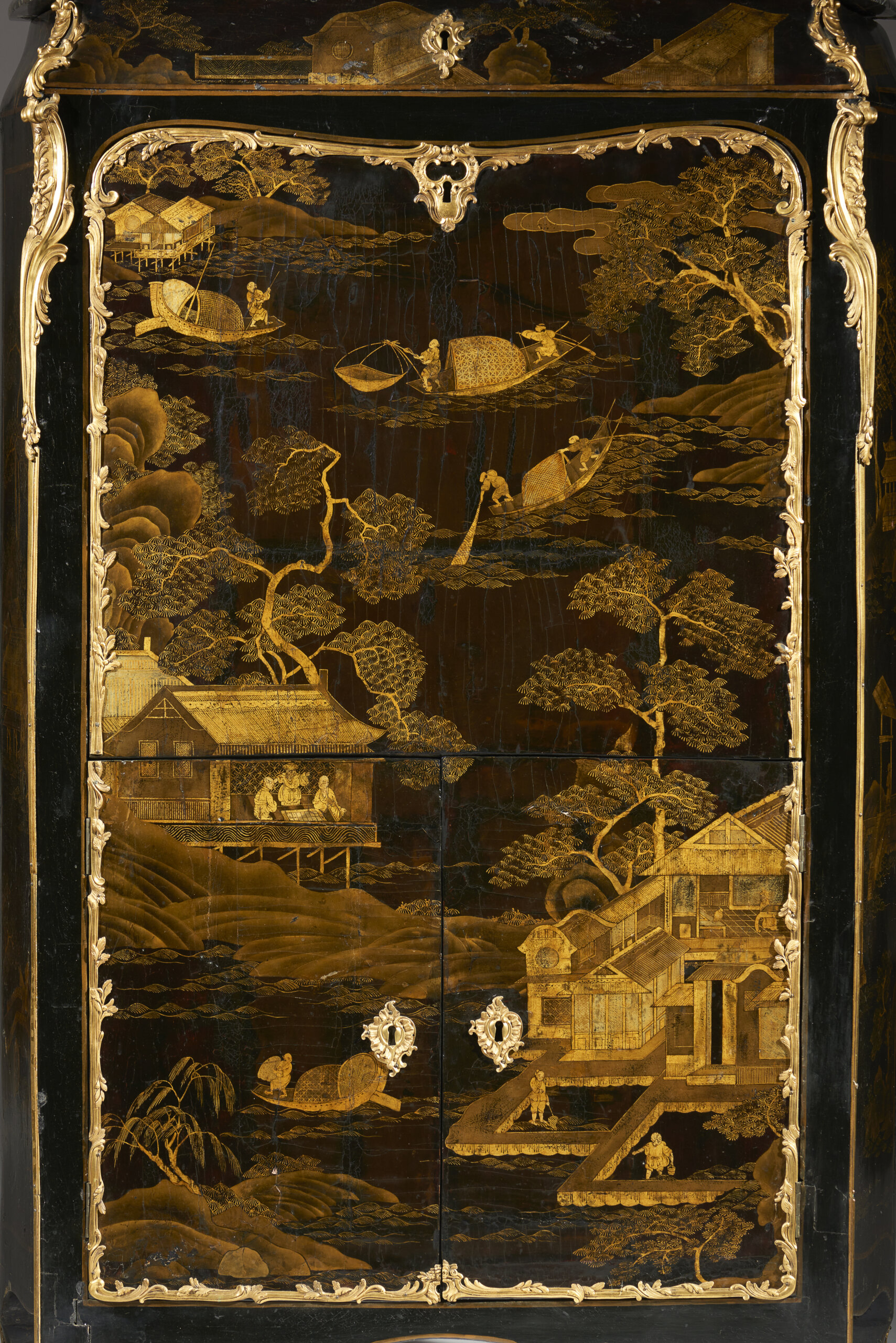 Em laca da China e vernis Martin, com decoração a ouro representando paisagens lacustres animadas com pavilhões, pontes, embarcações e figuras