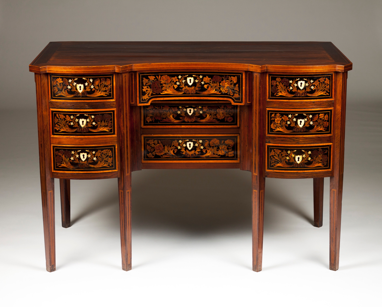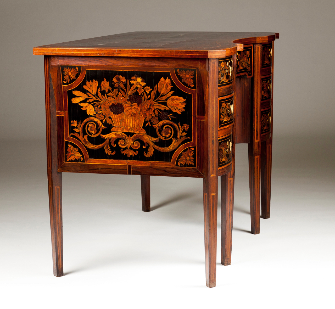 Com profuso trabalho de marchetaria em pau-cetim, ébano, pau-santo e marfim representando jarras de flores, motivos florais e enrolamentos