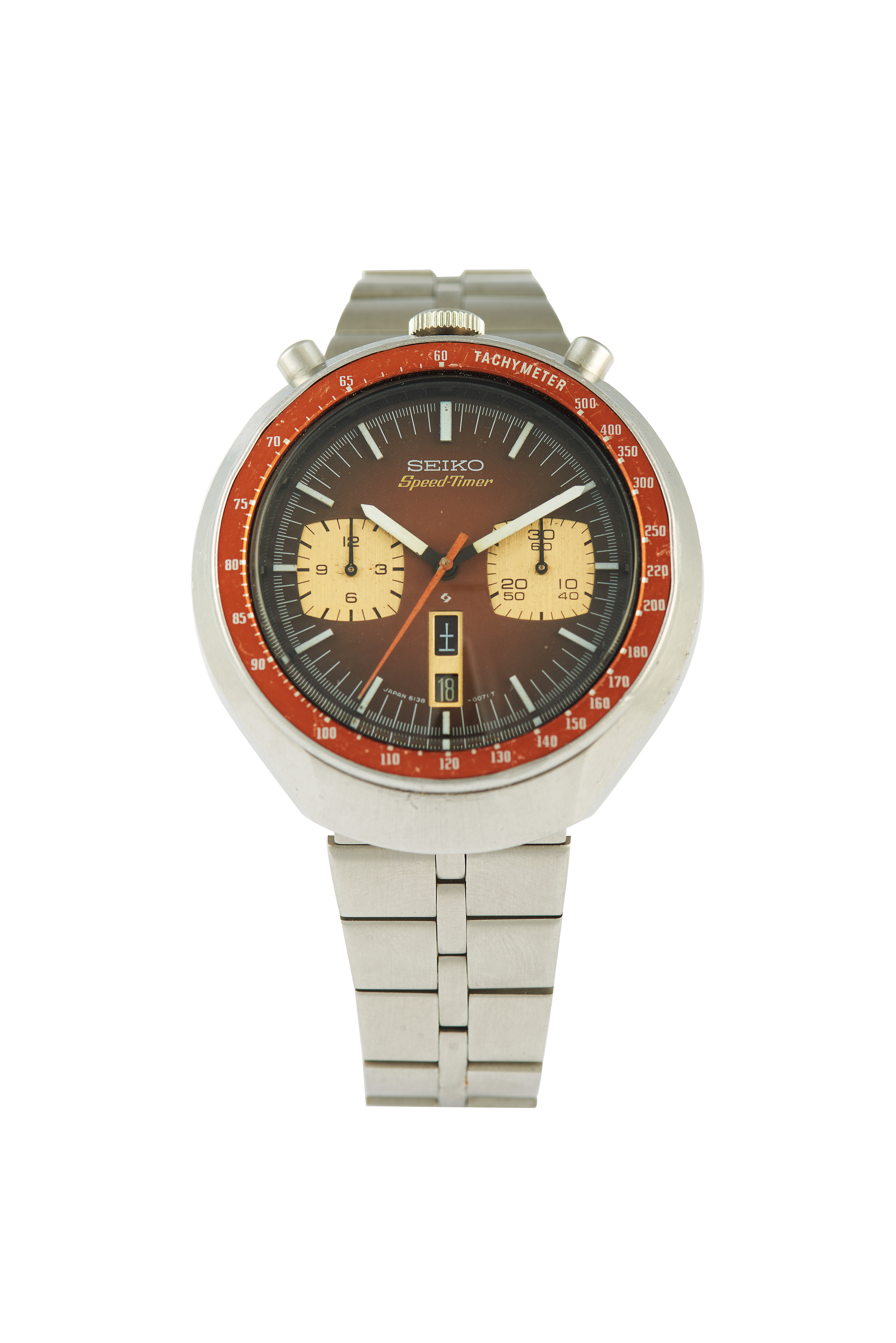 Modelo Speedtimer "Bullhead"com a ref. nº6138-0071. Movimento mecânico automático (Cal. 6138B) com função cronógrafo, data e dia da semana às 18h. Caixa e bracelete em aço com a ref. nº 743480. Em muito bom estado de conservação.