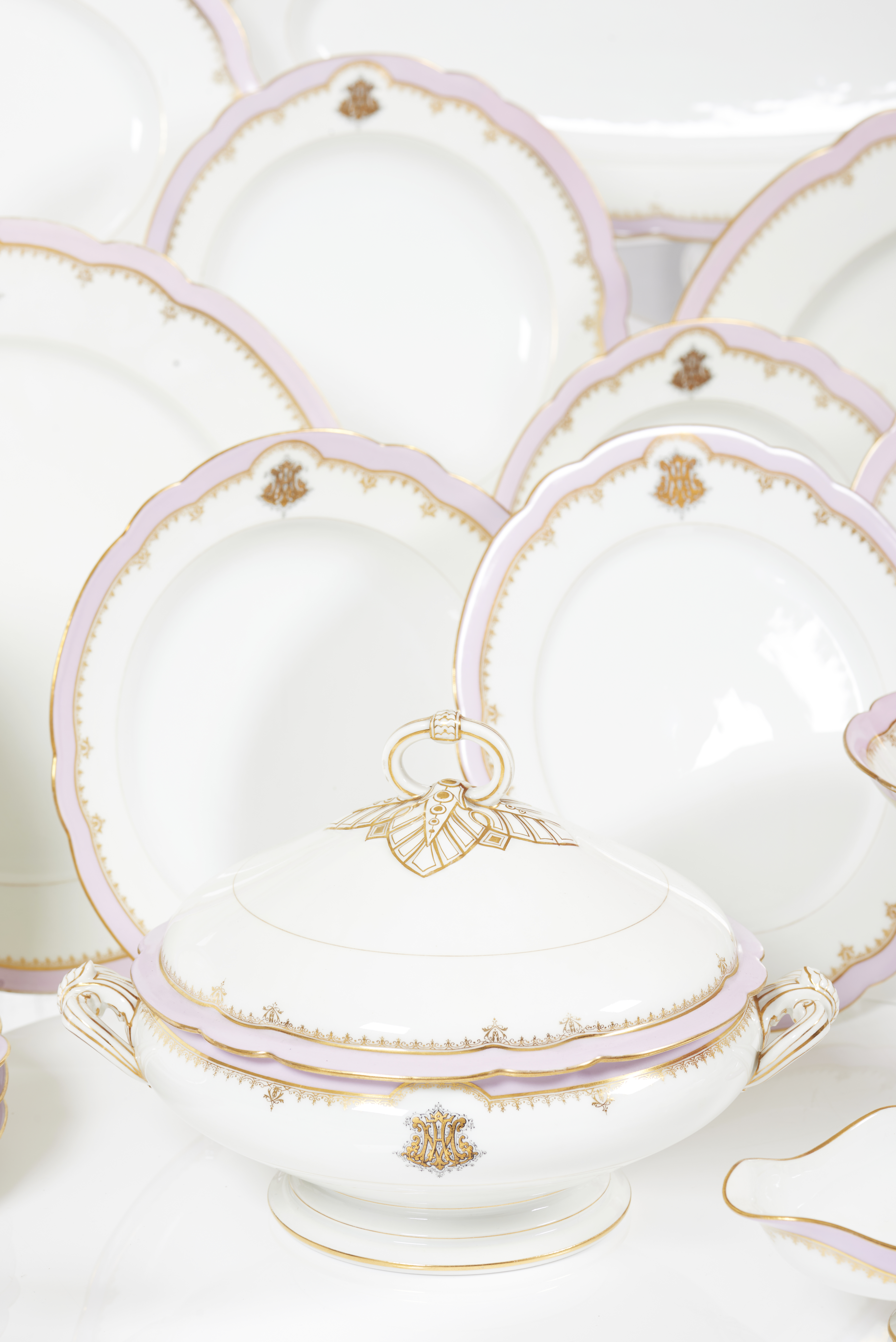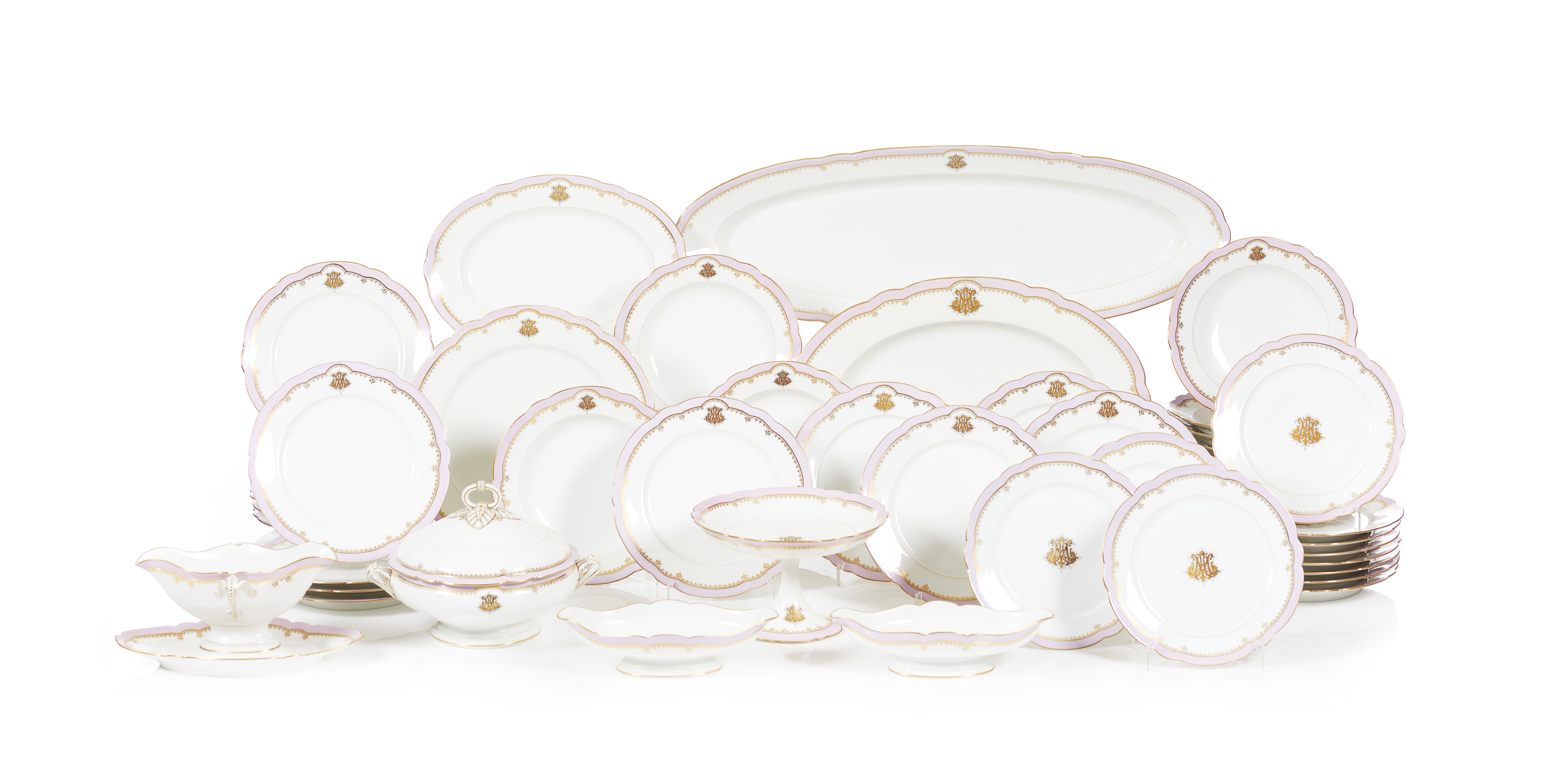 Composto por: 18 pratos rasos, 14 pratos de sopa, 11 pratos de sobremesa, 1 prato de arroz, 1 travessa peixeira, 1 molheira, 1 fruteiro de pé, 1 terrina com tampa, 2 azeitoneiras, 3 travessas de diferentes tamanhos
