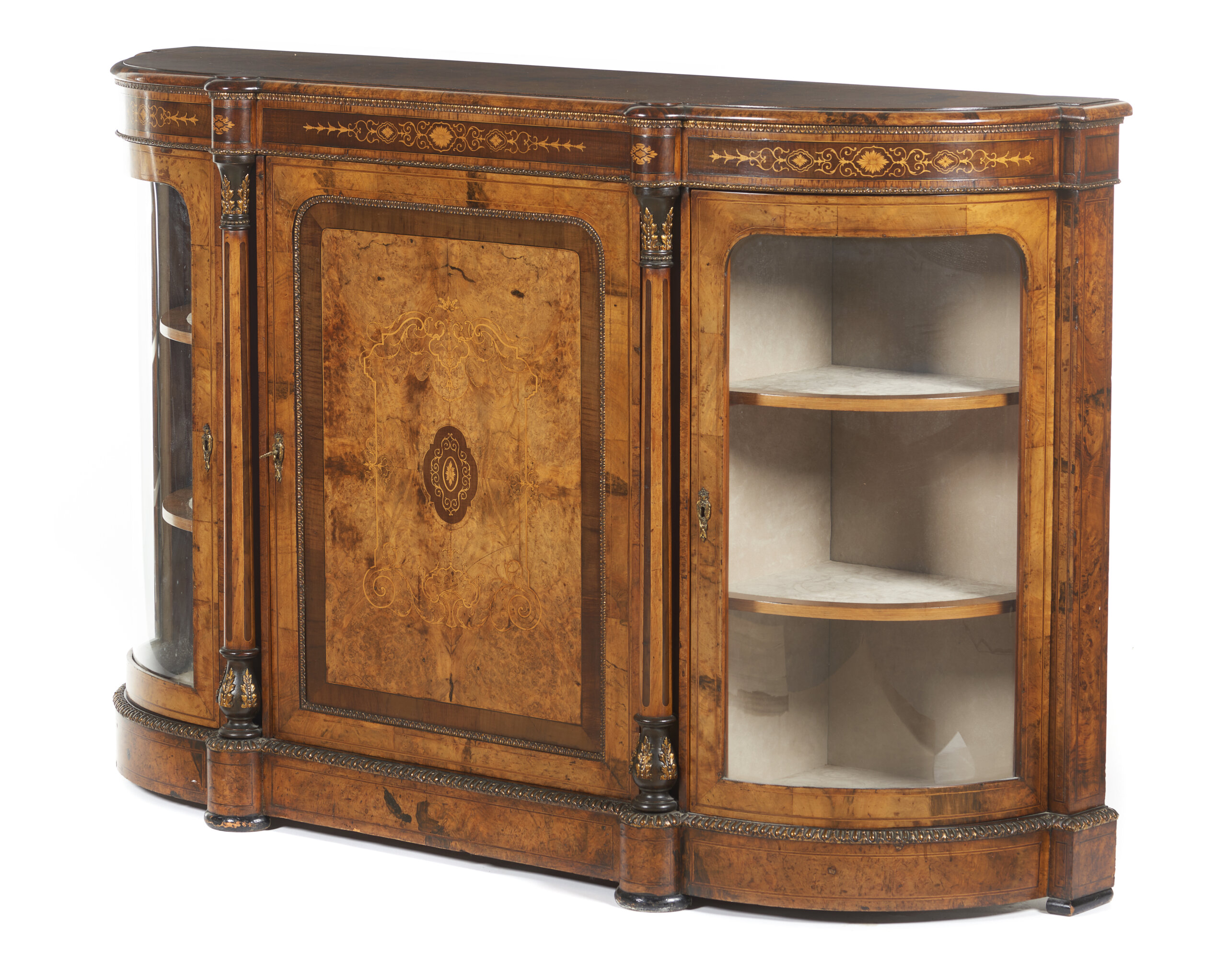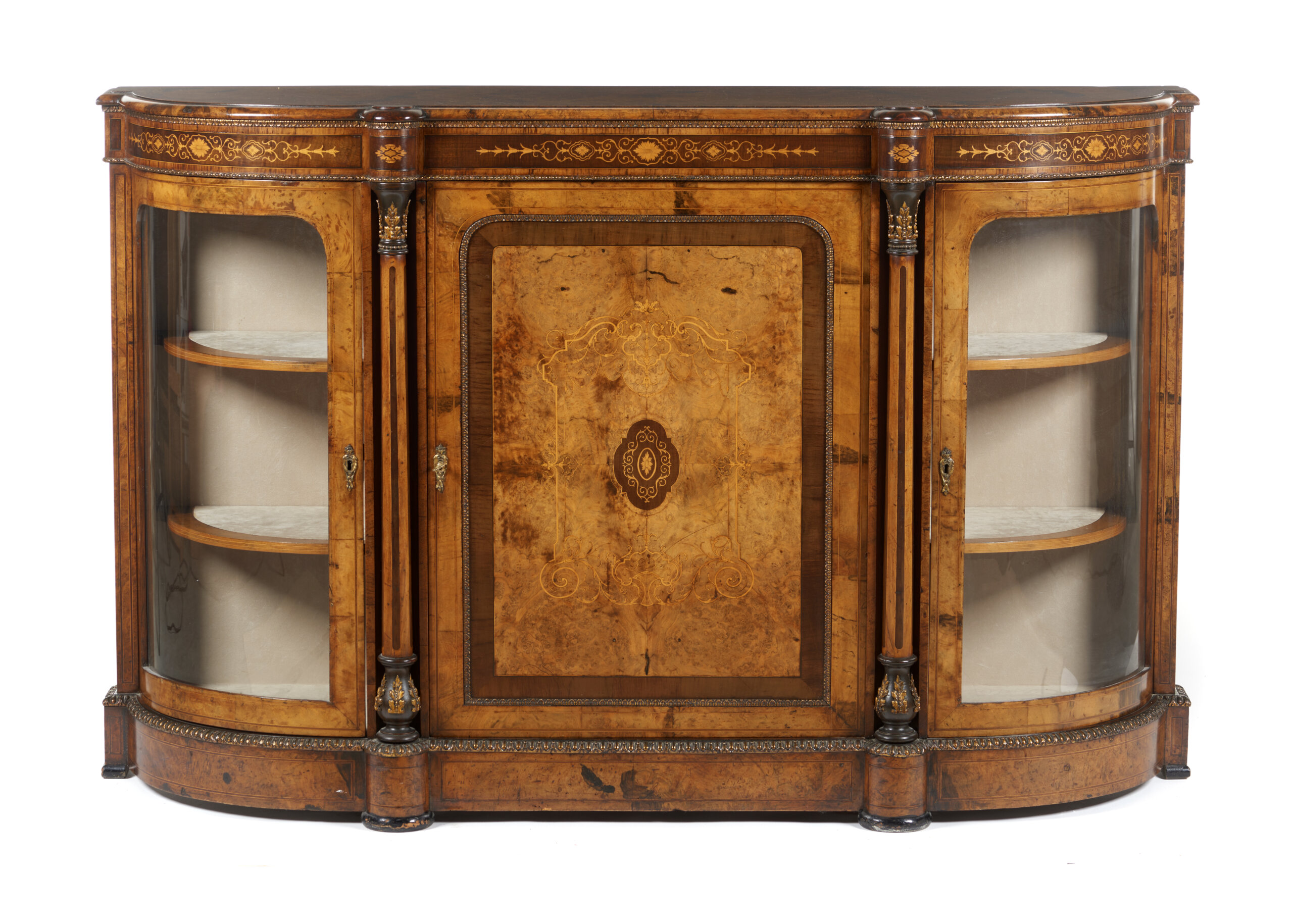 Em madeira faixeada a raiz de nogueira com trabalho de marchetaria em pau-santo, buxo e outras madeiras