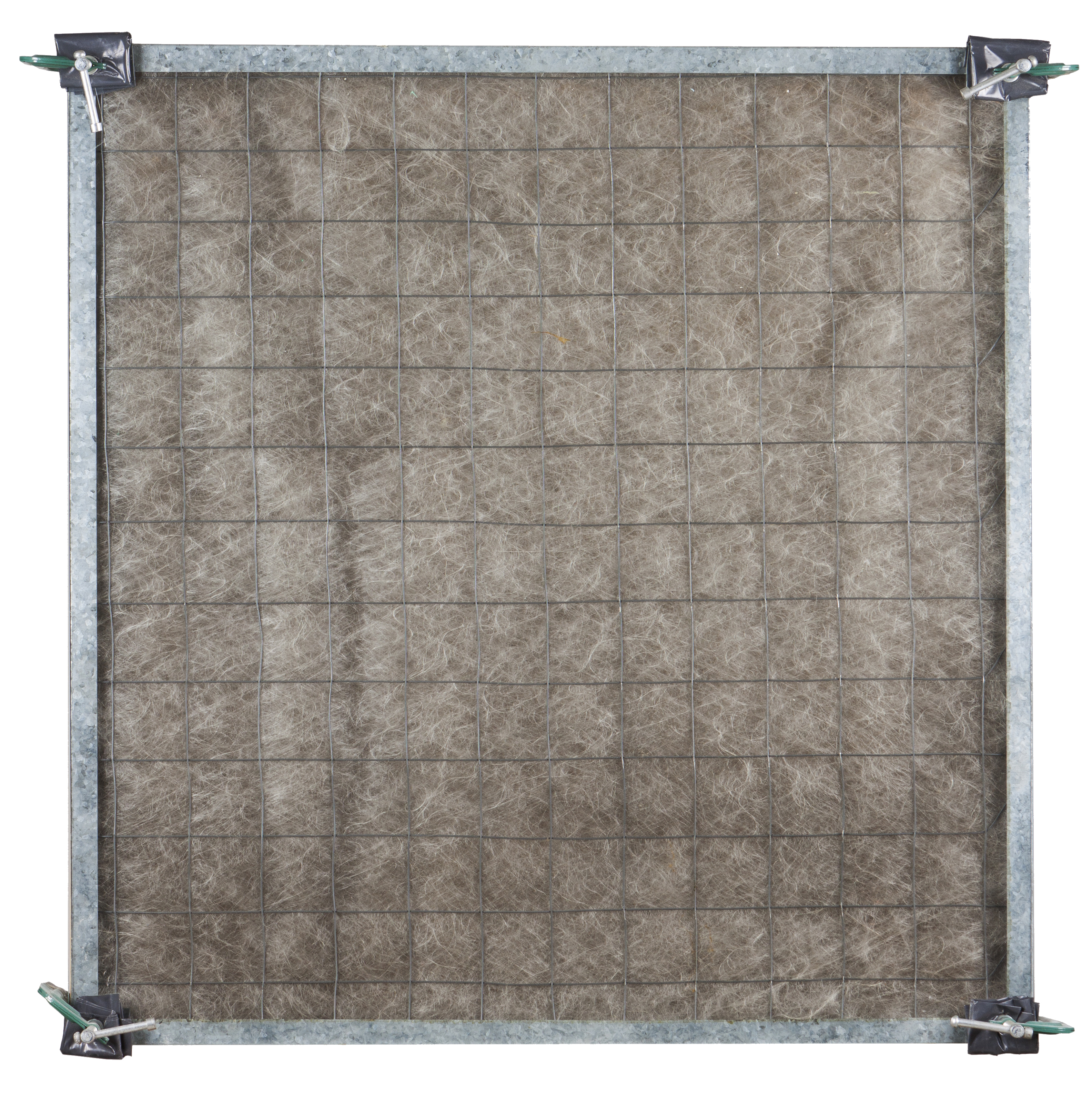 Filtro de ar condicionado, vidro, contraplacado, plástico e grampos metálicos