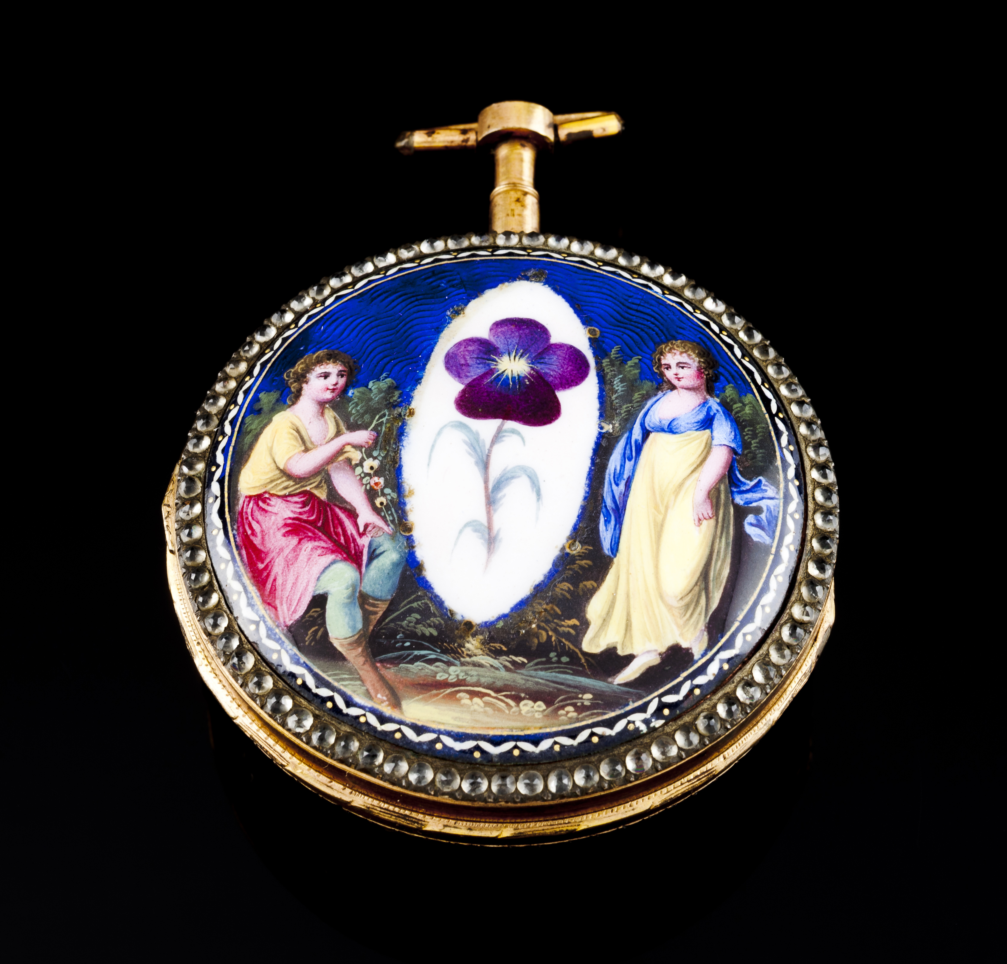 Mostrador em esmalte branco com numeração árabe e vizel cravejado com pedras incolores