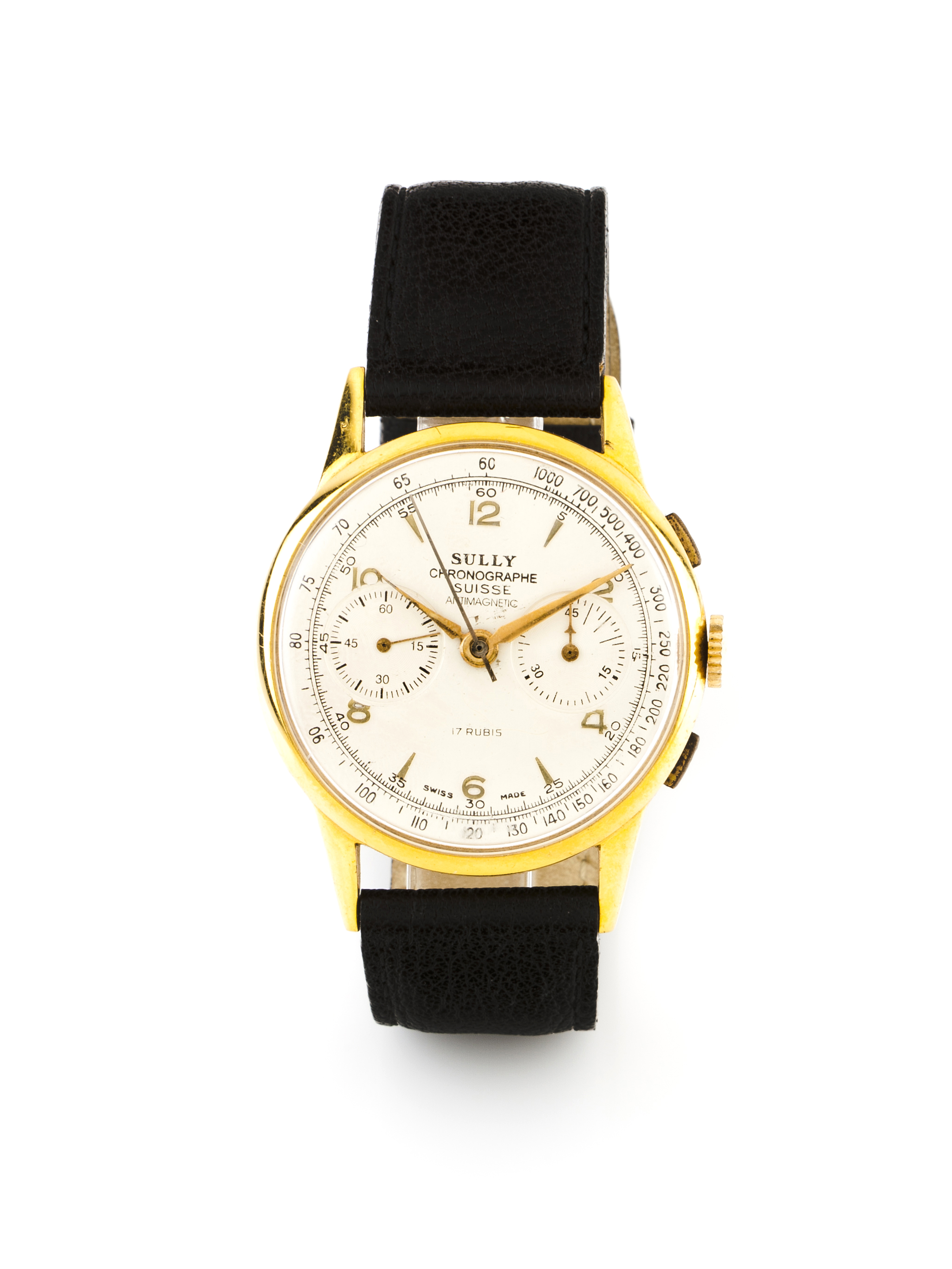 Movimento mecânico de corda manual com função cronógrafo. Caixa em plaquet com tampa em aço. Com marcas de uso.
