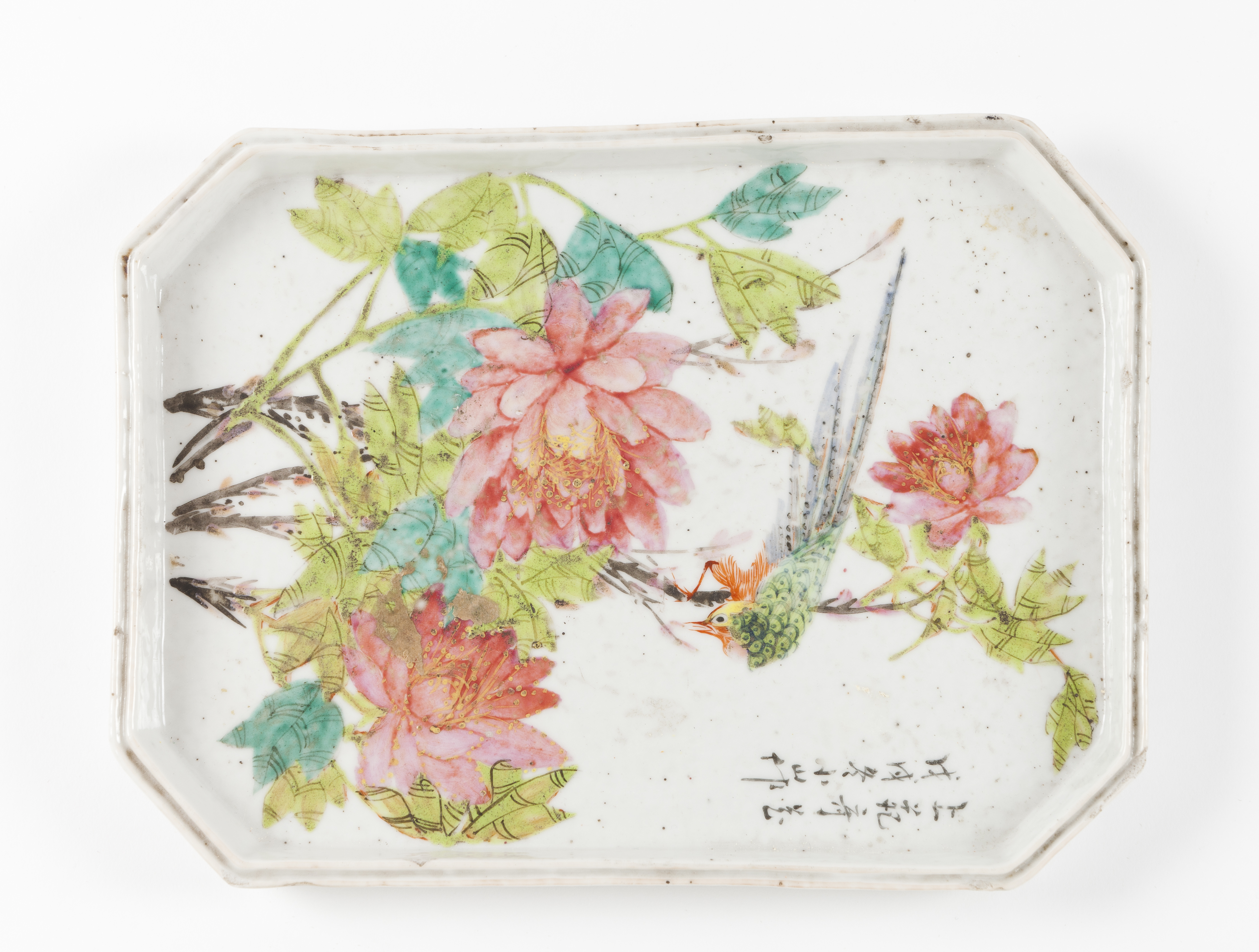 Decorado ao estilo 'qianjiang' , representando pássaro sobre flores e com incrição caligráfica