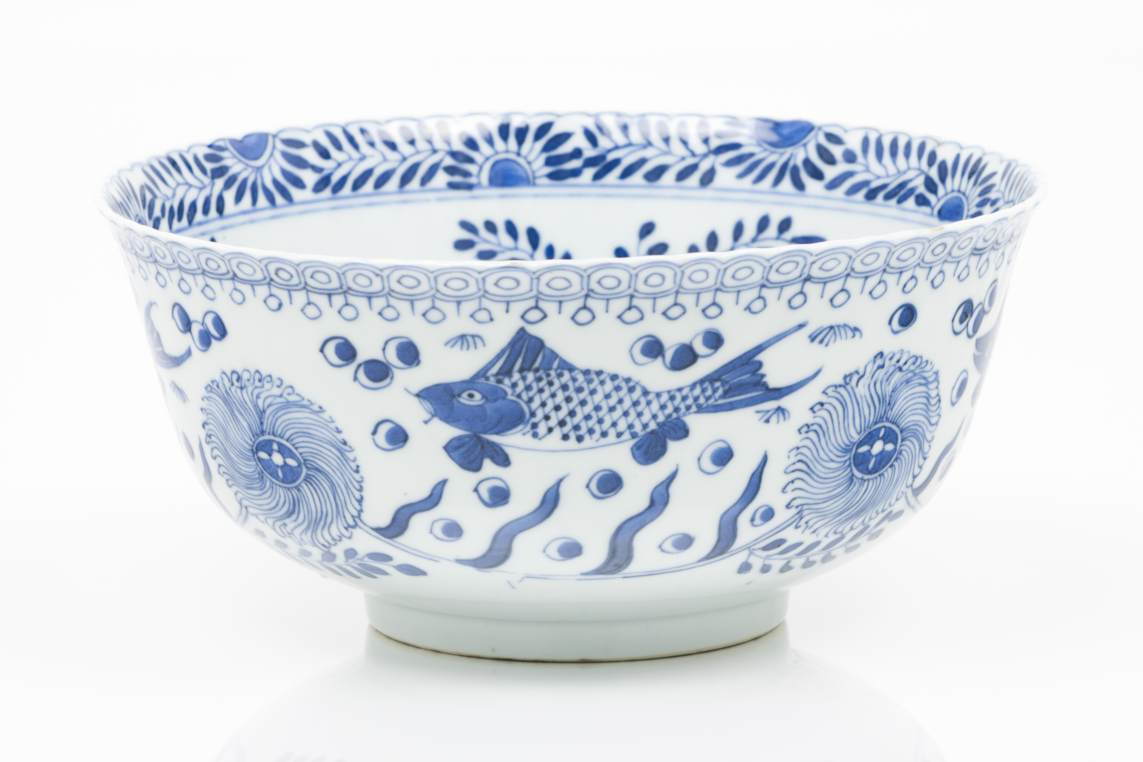Decoração a azul sob vidrado representando peixes e flores