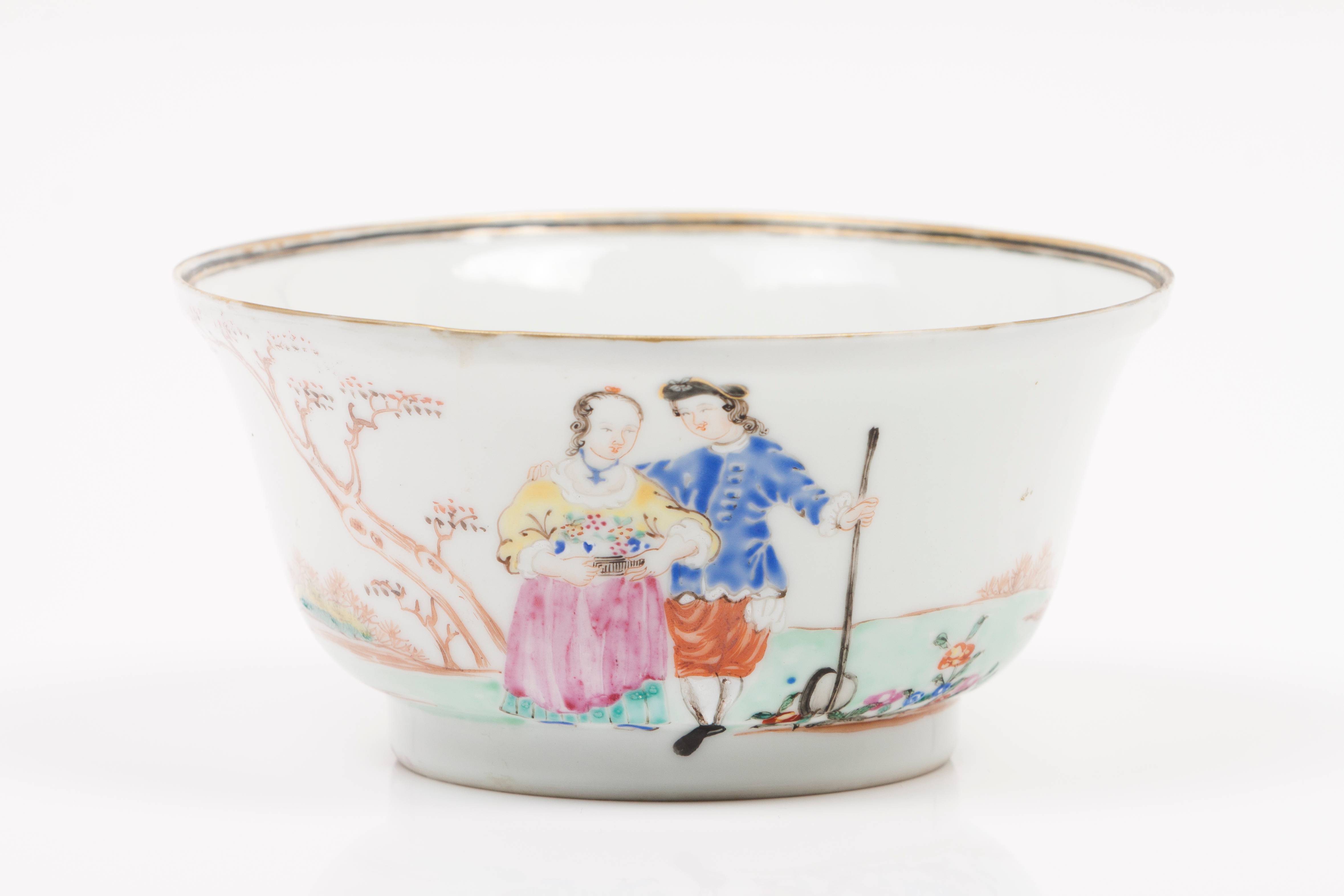 Decoração policromada com esmaltes da Família Rosa representando figuras ocidentais