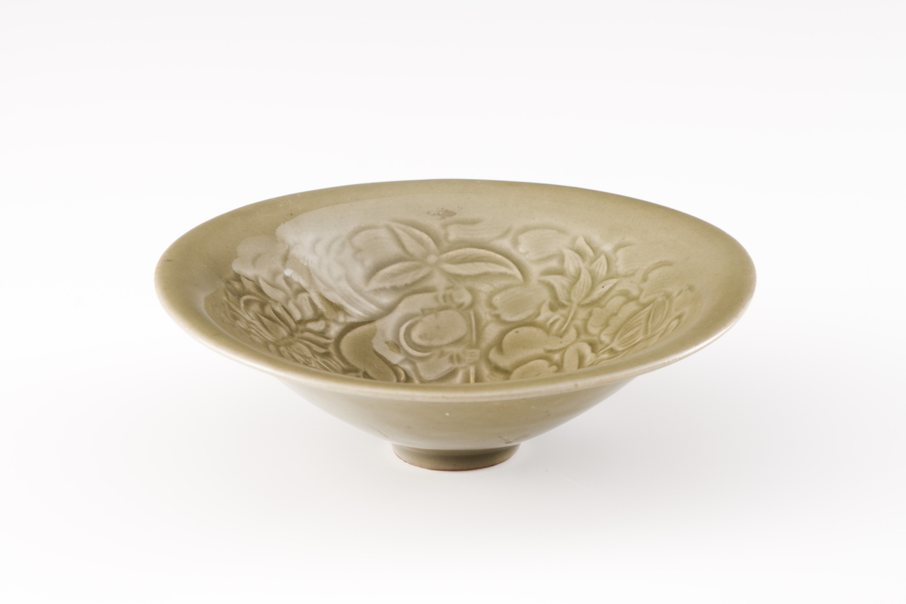 Decoração incisa sob vidrado celadon representando figuras e motivos vegetalistas