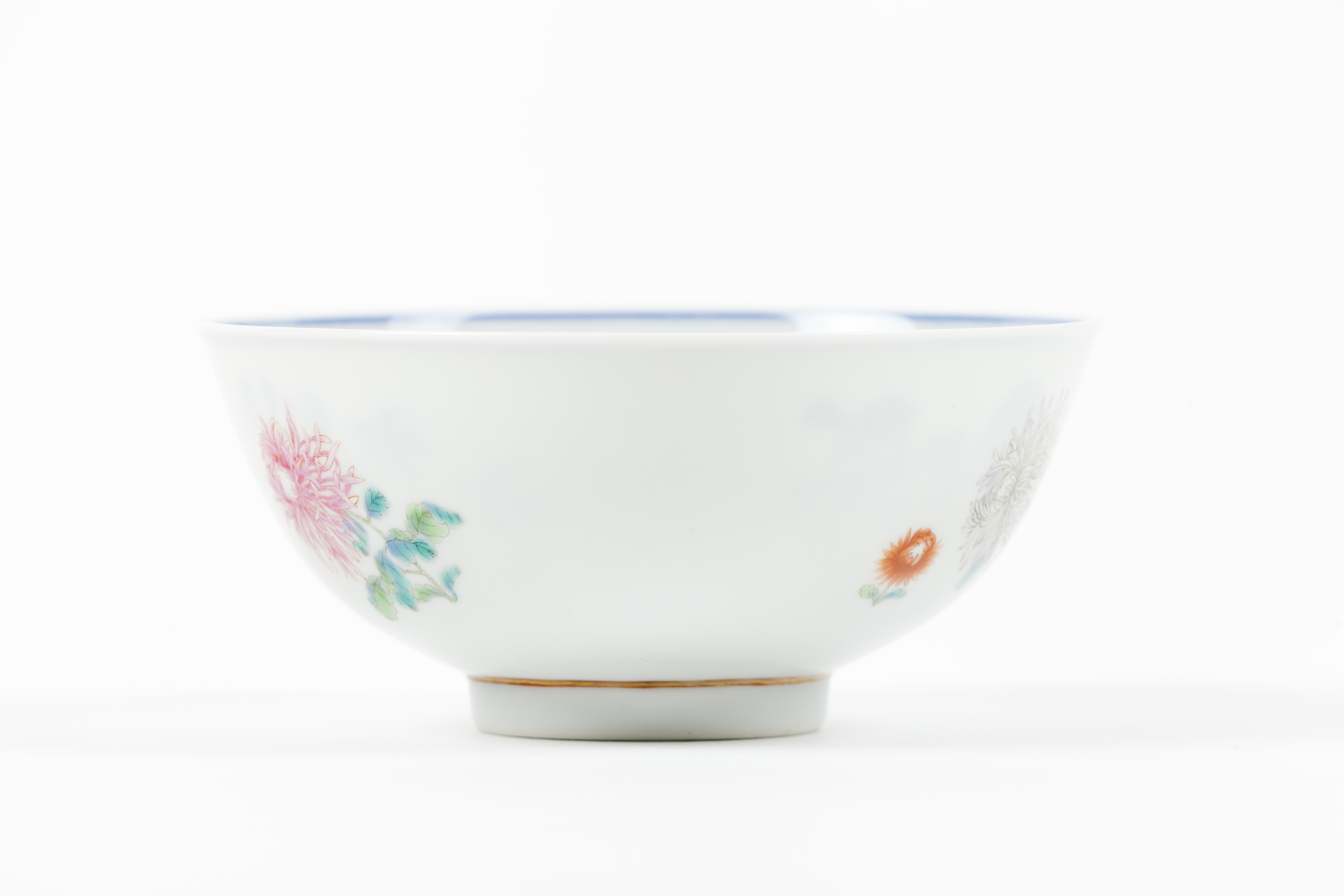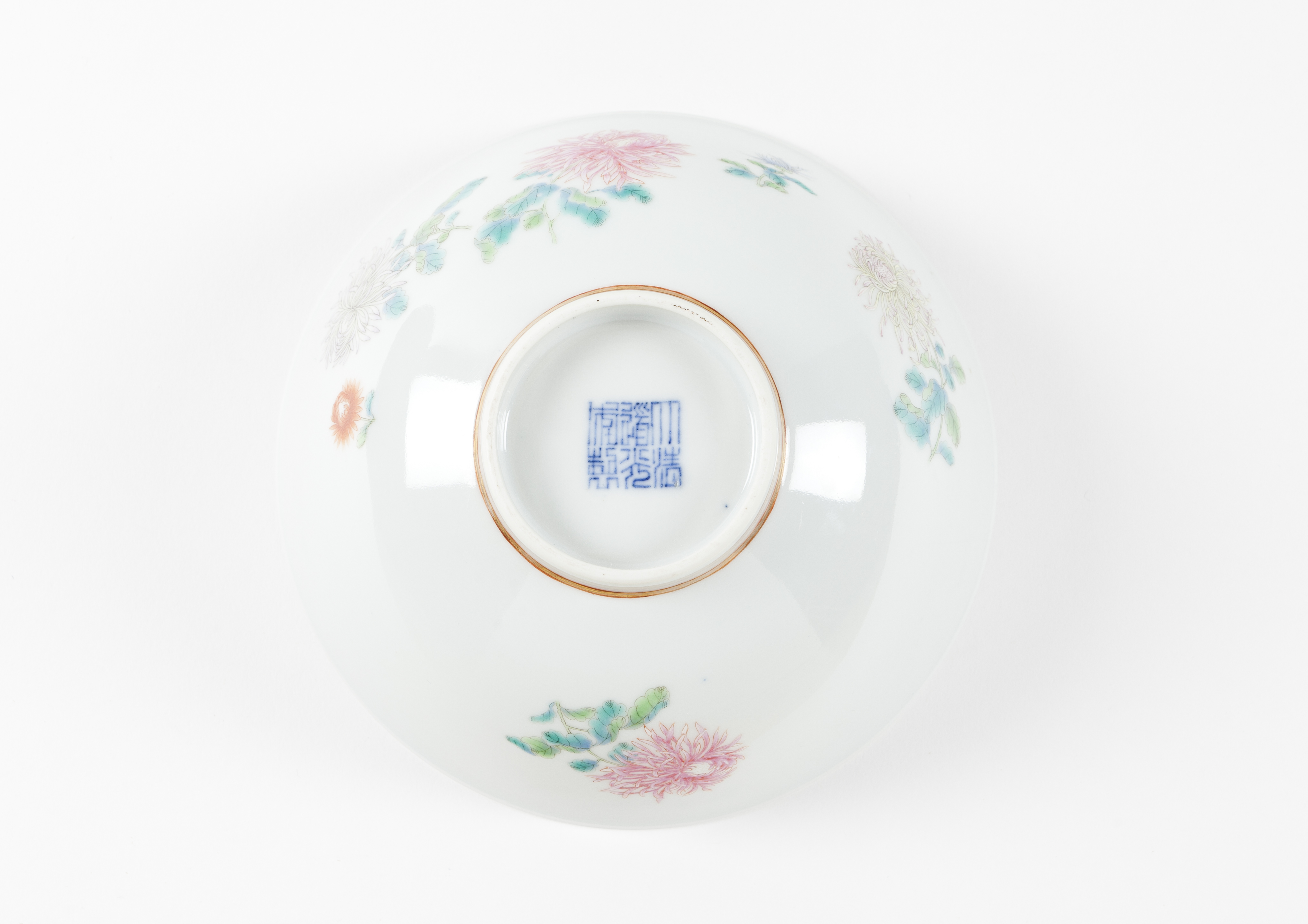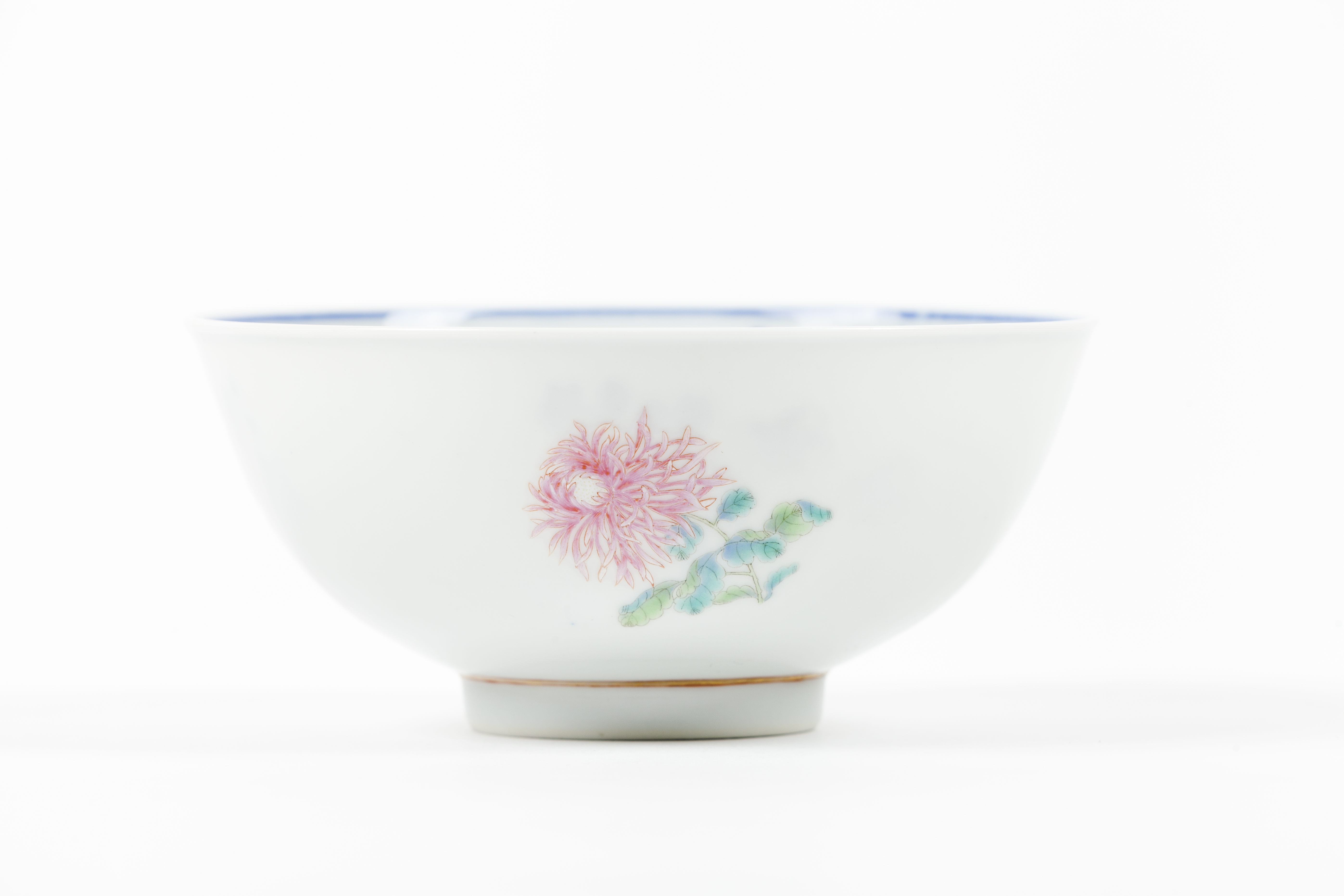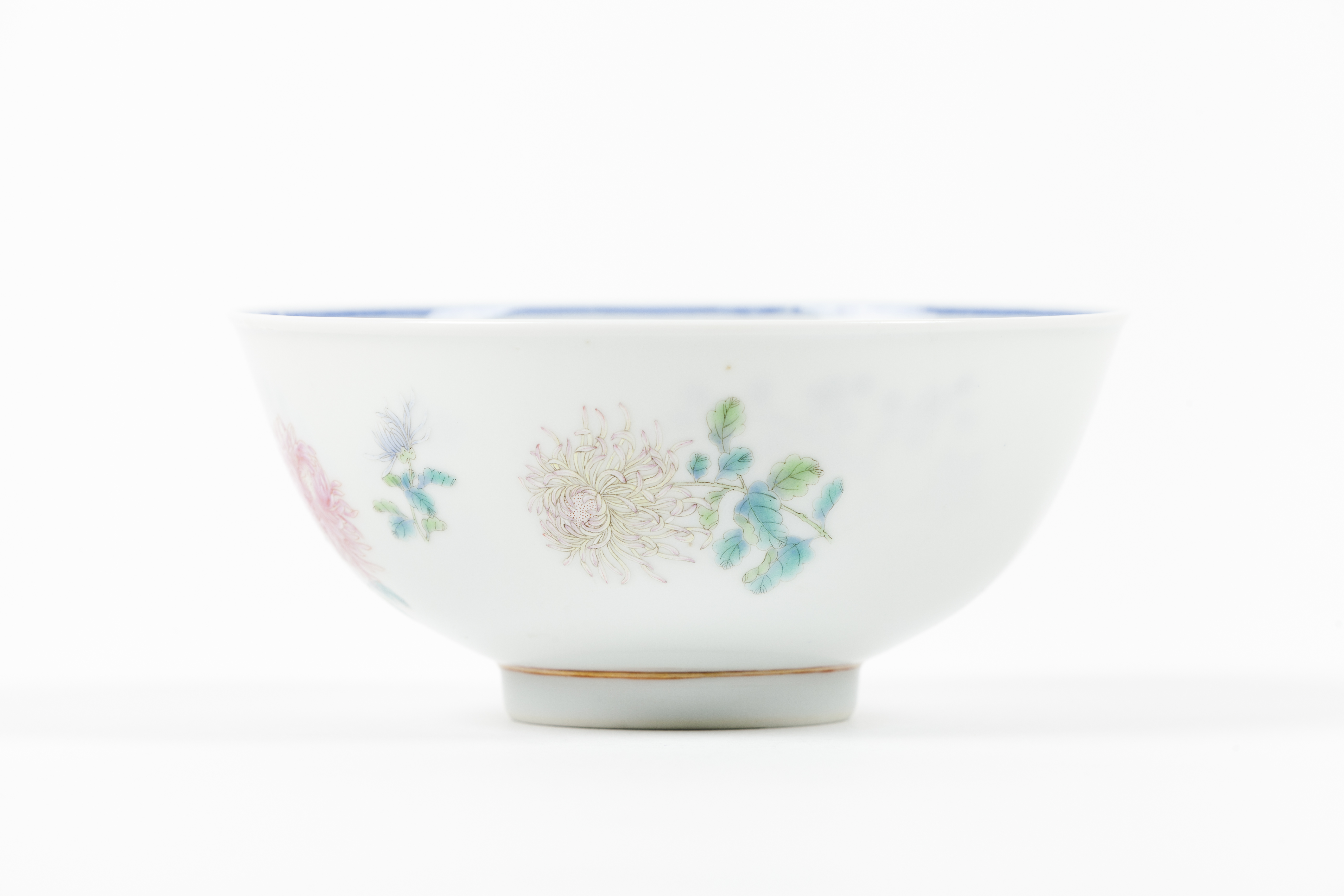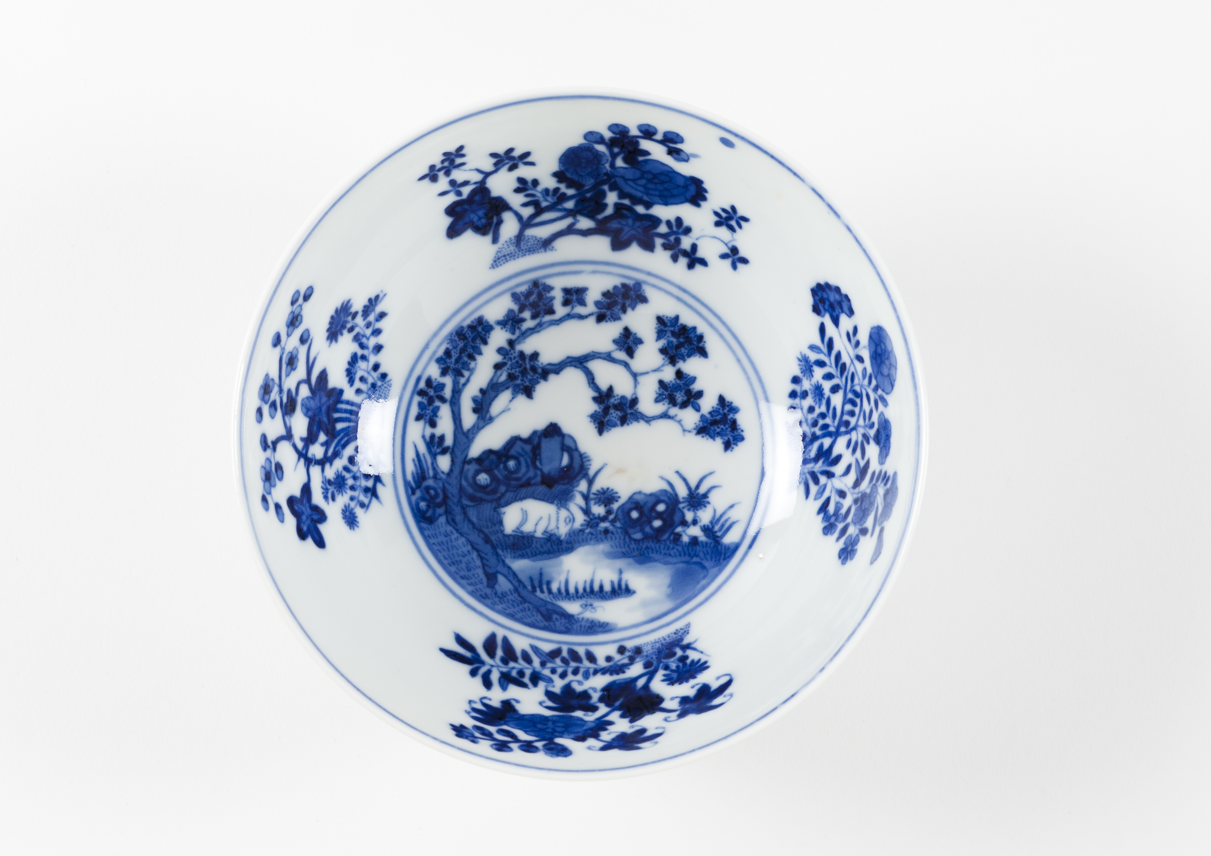 Pintada no exterior com crisântemos e decorada no interior a azul sob vidrado representando flores e medalhão central com paisagem