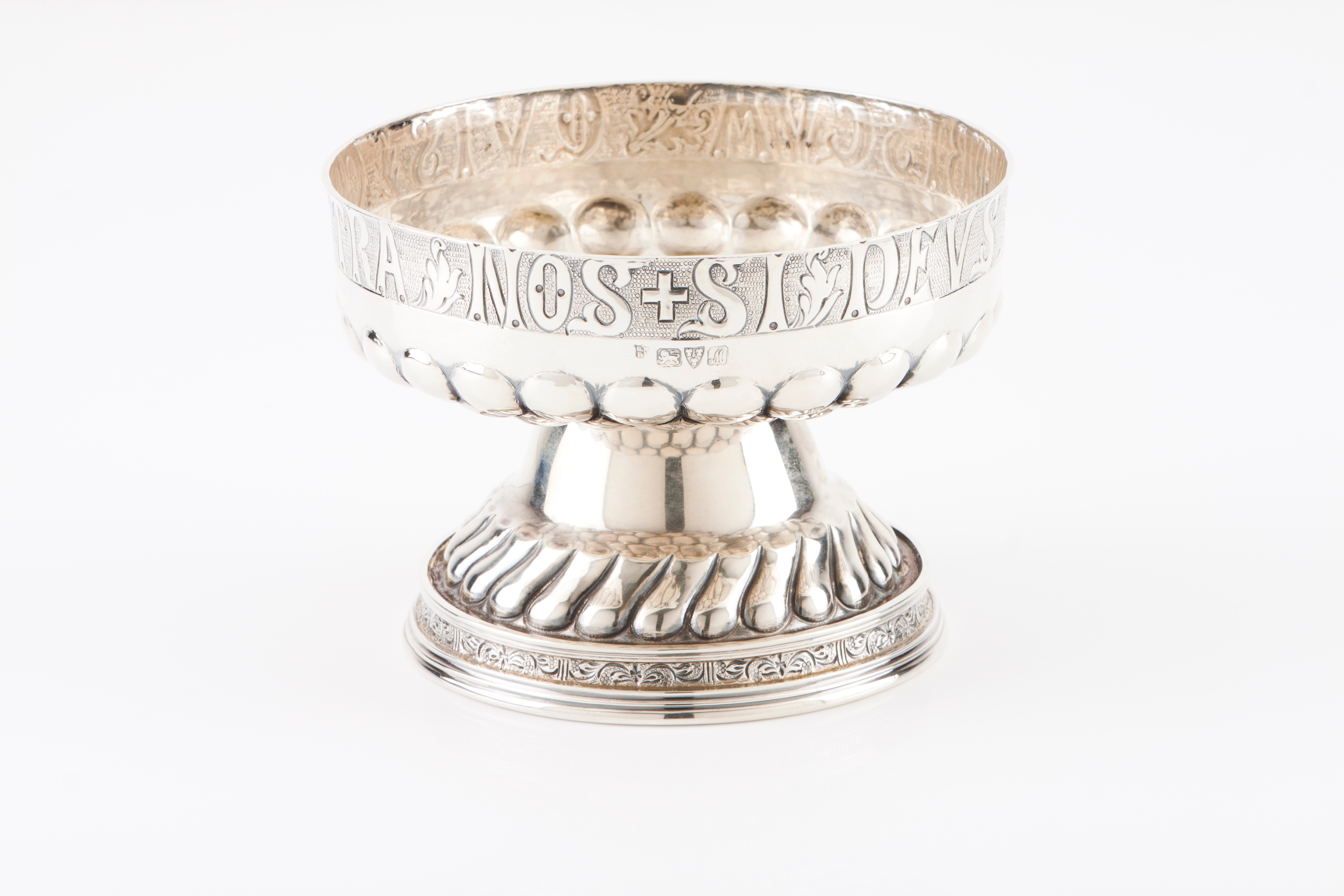 Decoração relevada e gravada Arts & Crafts, bordo com inscrição "SI DEVS NOBISCVM QUIS CONTRA NOS"