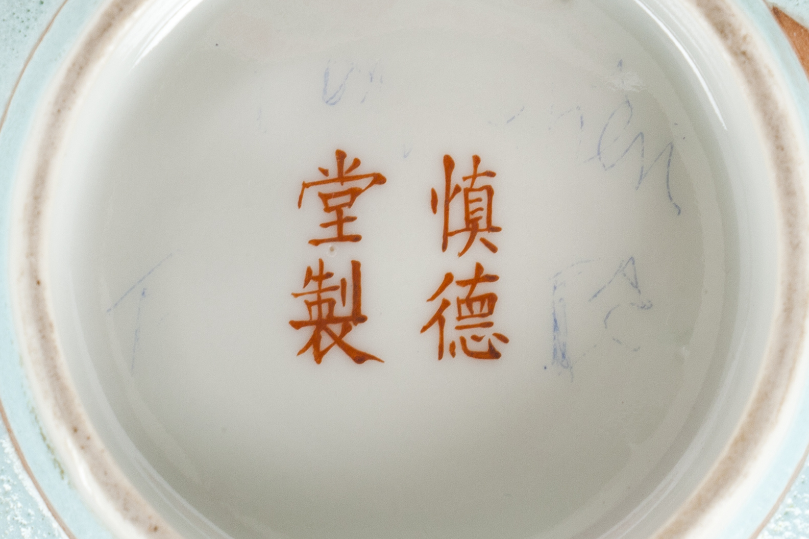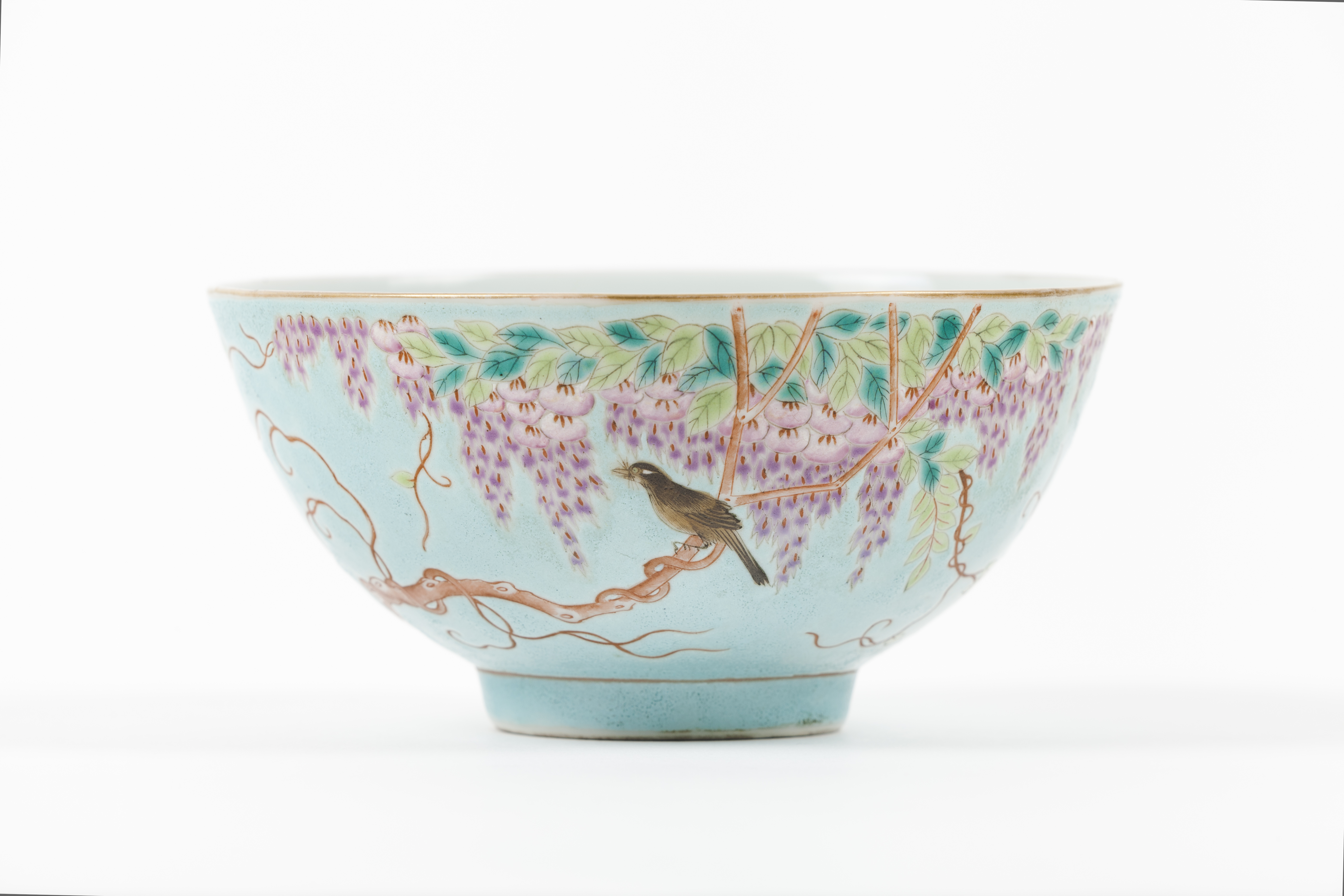 Em porcelana decorada com esmaltes da Família Rosa representando passaro poisada em ramos de glicínia e peónias sobre fundo turquesa