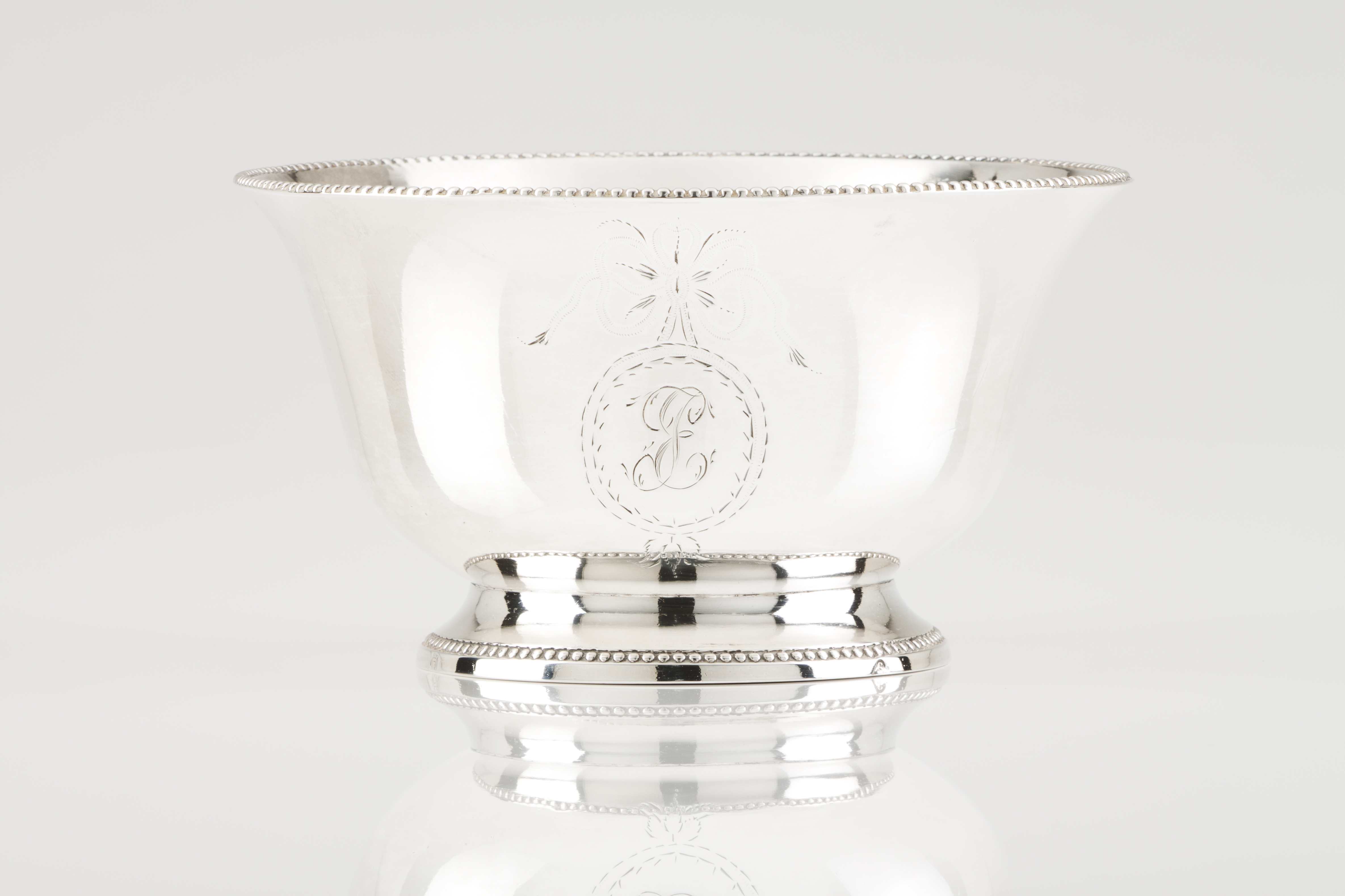 Corpo liso cinzelado com reserva monogramada encimada por laço com fitas