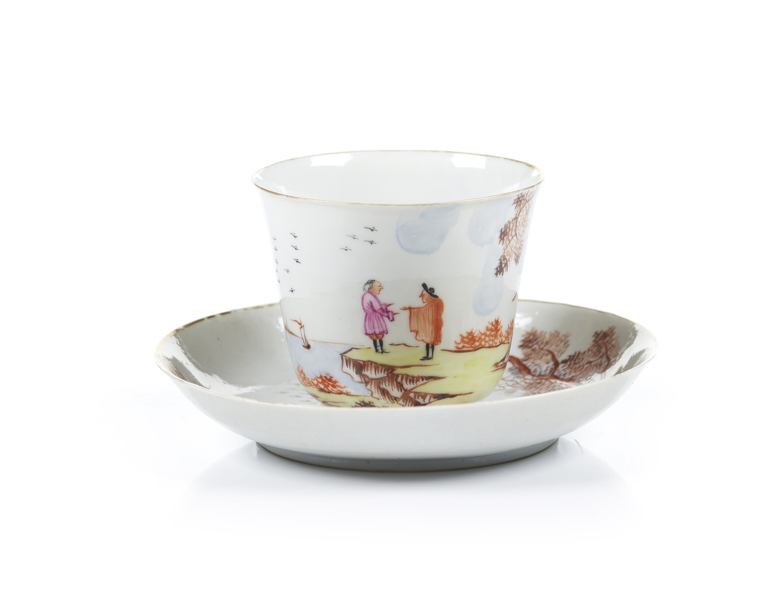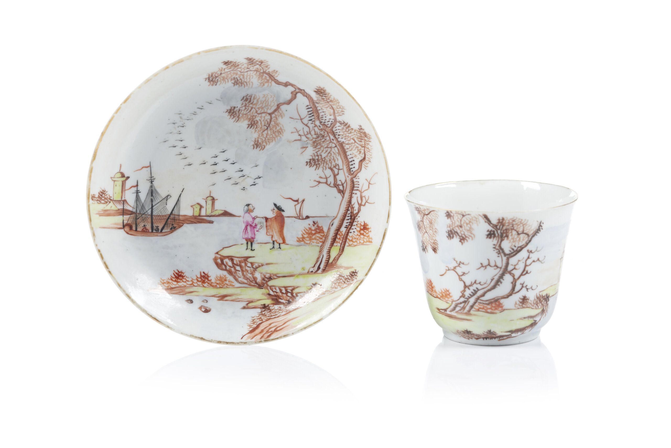 Com decoração policromada representado uma vista de porto europeu com figuras e embarcações