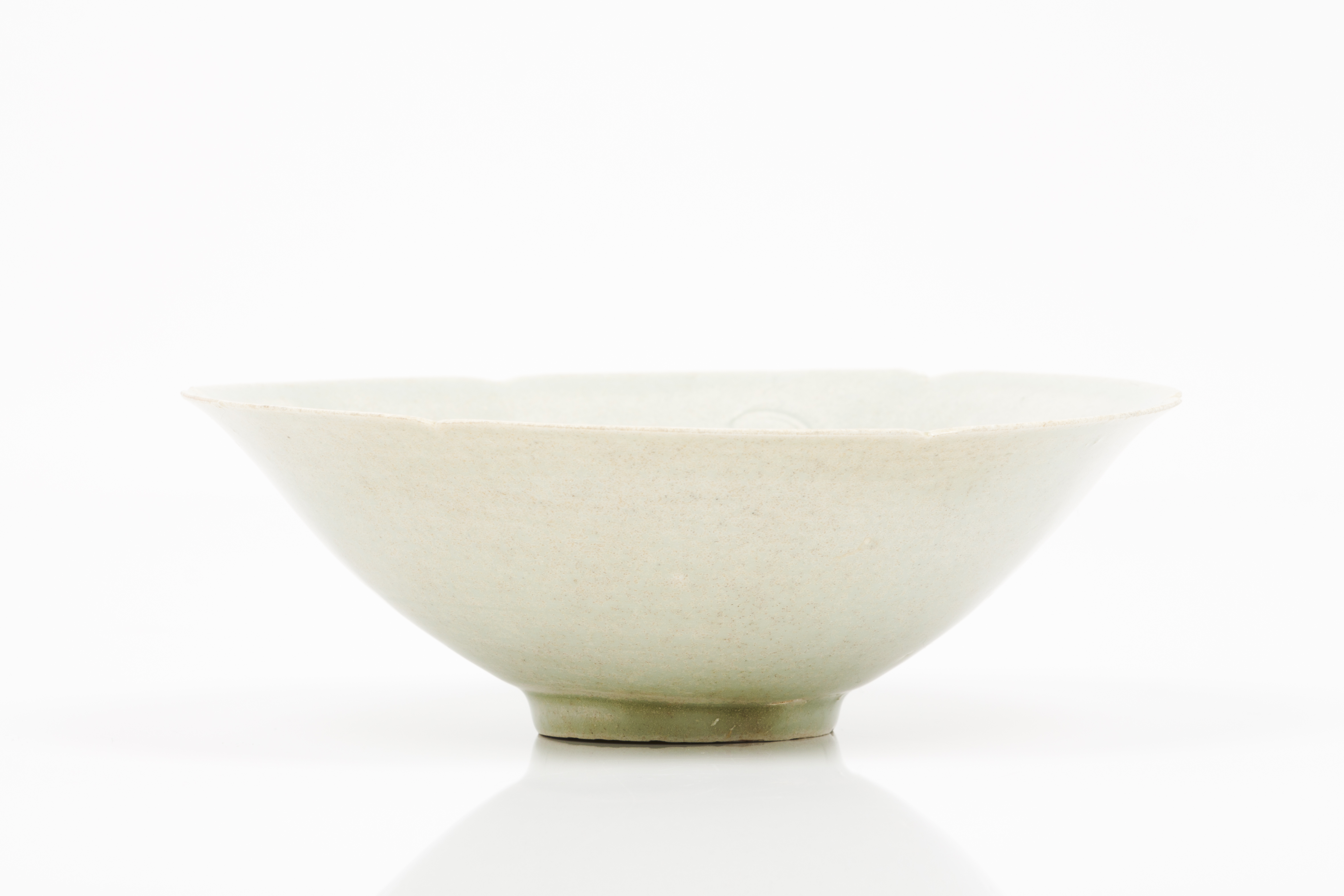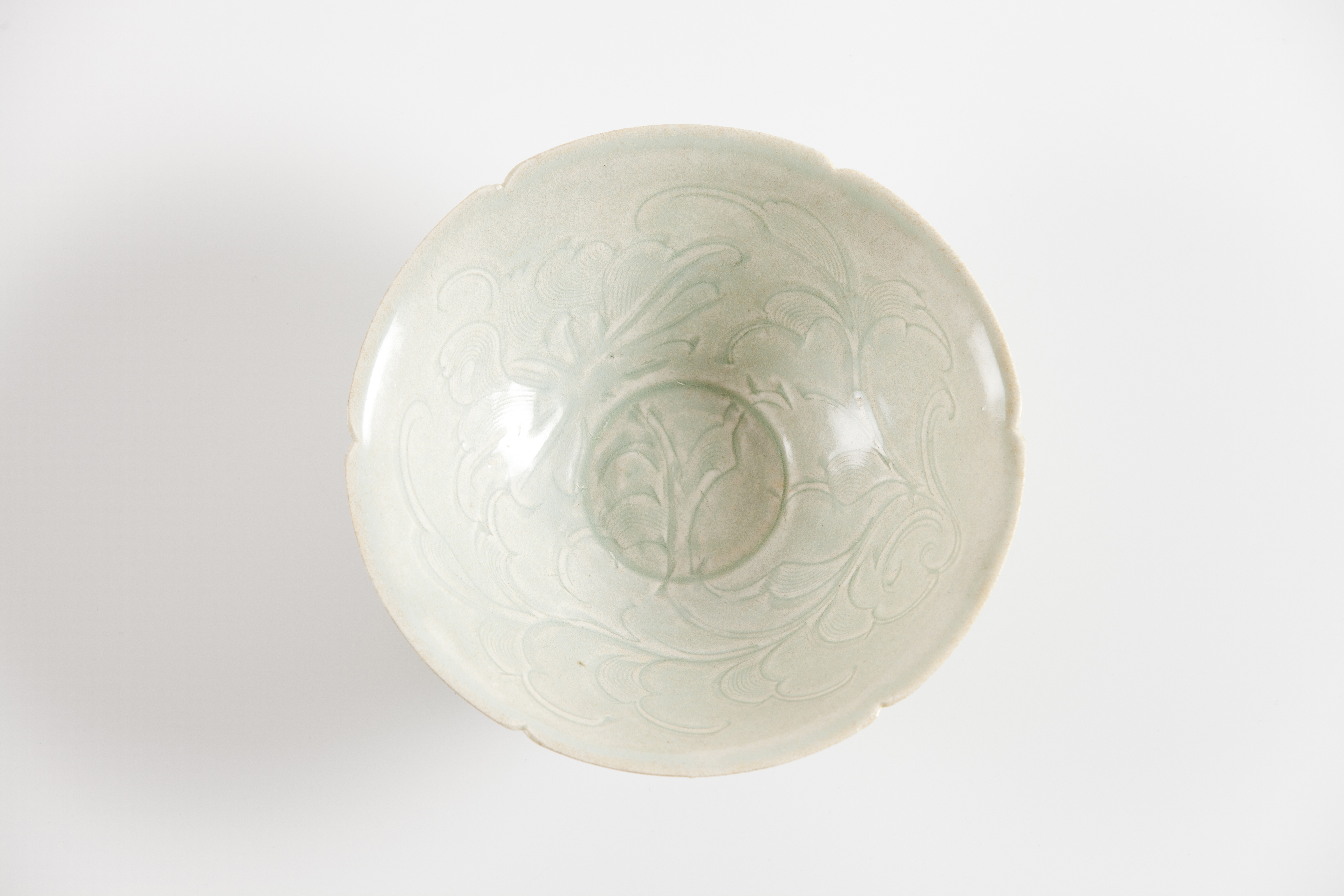 Com vidrado Qingbai, bordo recortado e decoração incisa no interior representando motivos florais