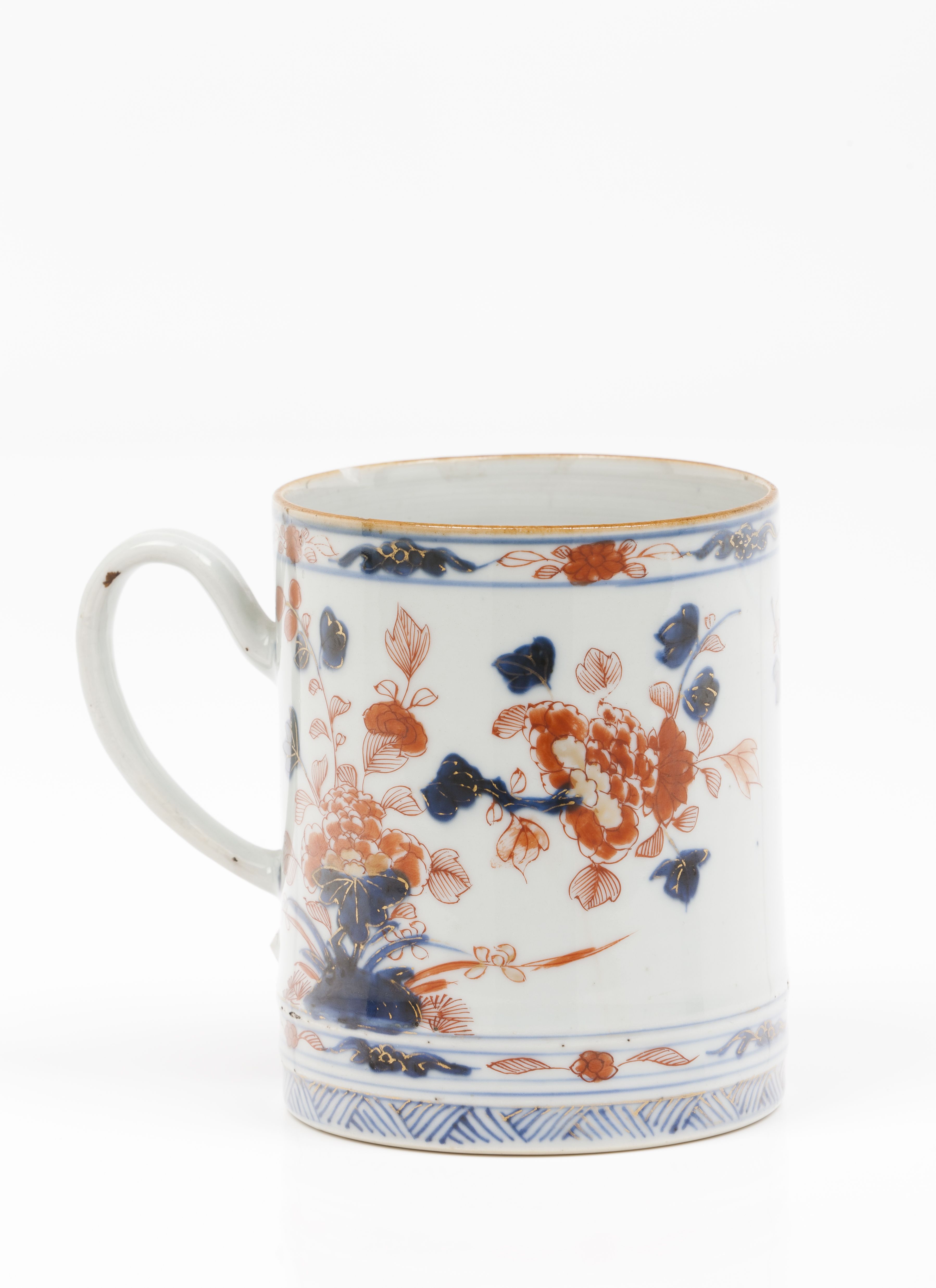 Com decoração Imari em azul, rouge-de-fer e dourado representando arbusto com flores