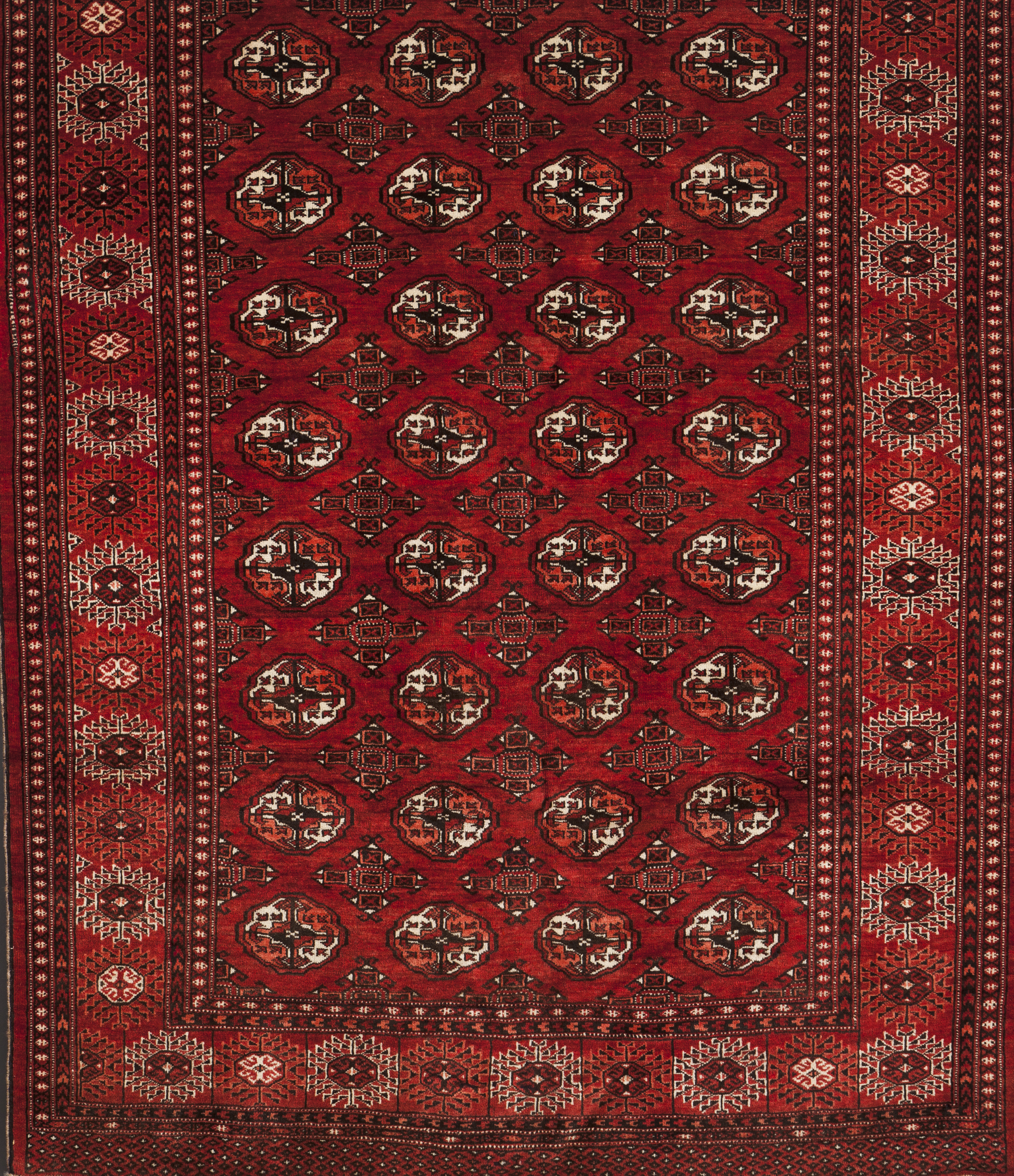 Em lã e algodão com desenho geométrico em tons de bordeaux e bege