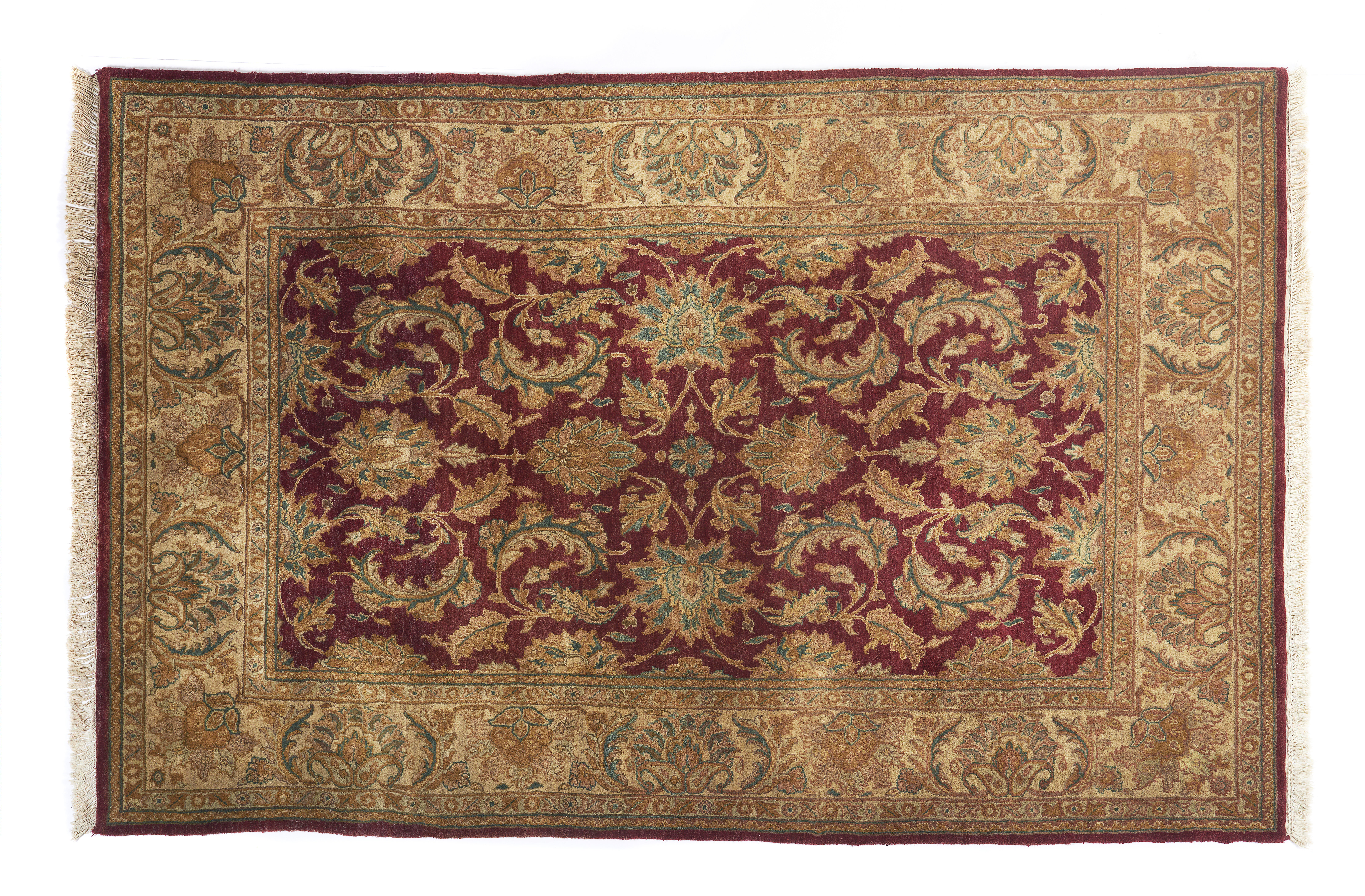 Desenho geométrico e floral em tons de bege, bordeaux e castanho