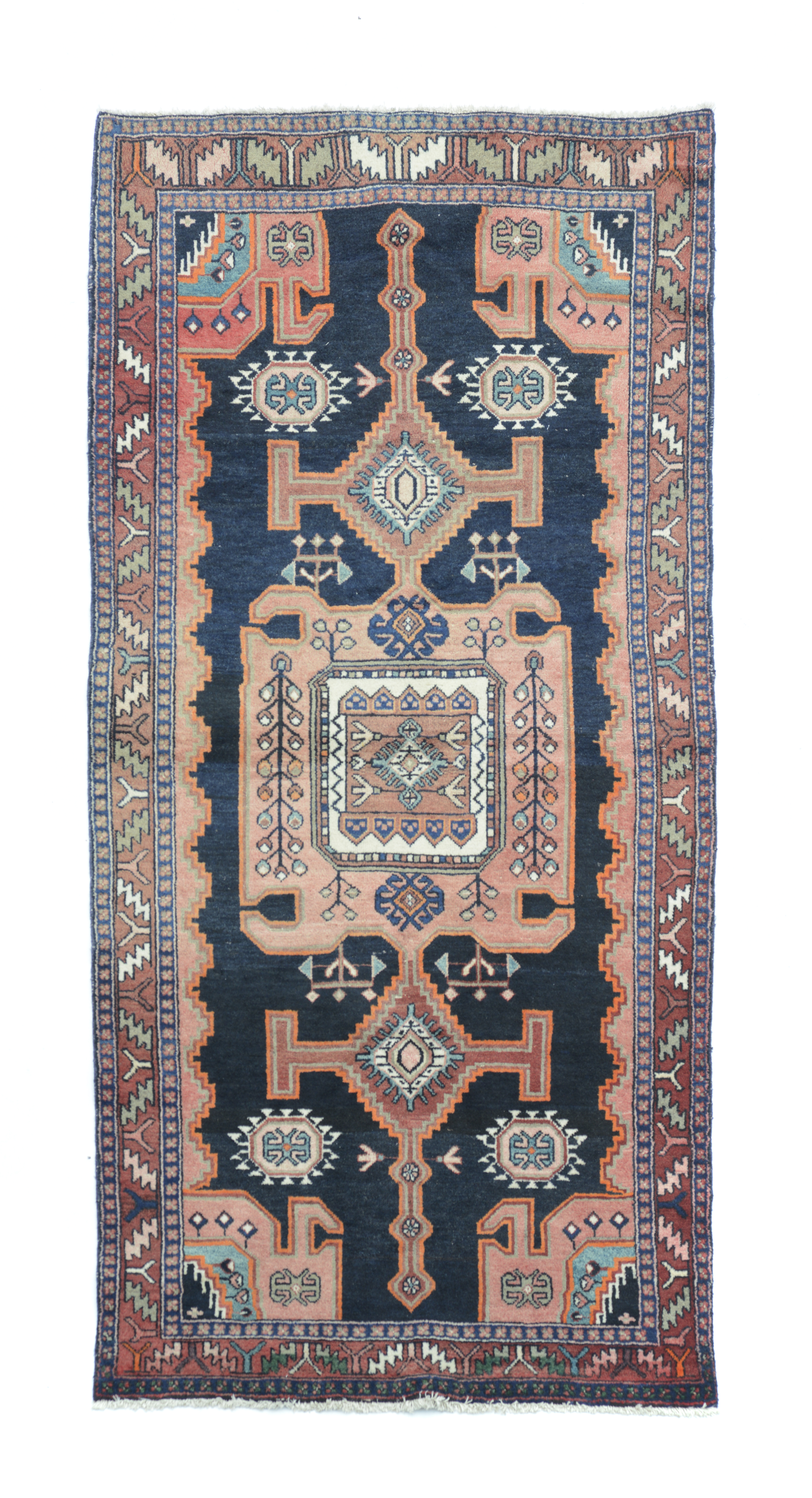 Em lã e algodão de desenho geométrico em tons de salmão, azul e bege
