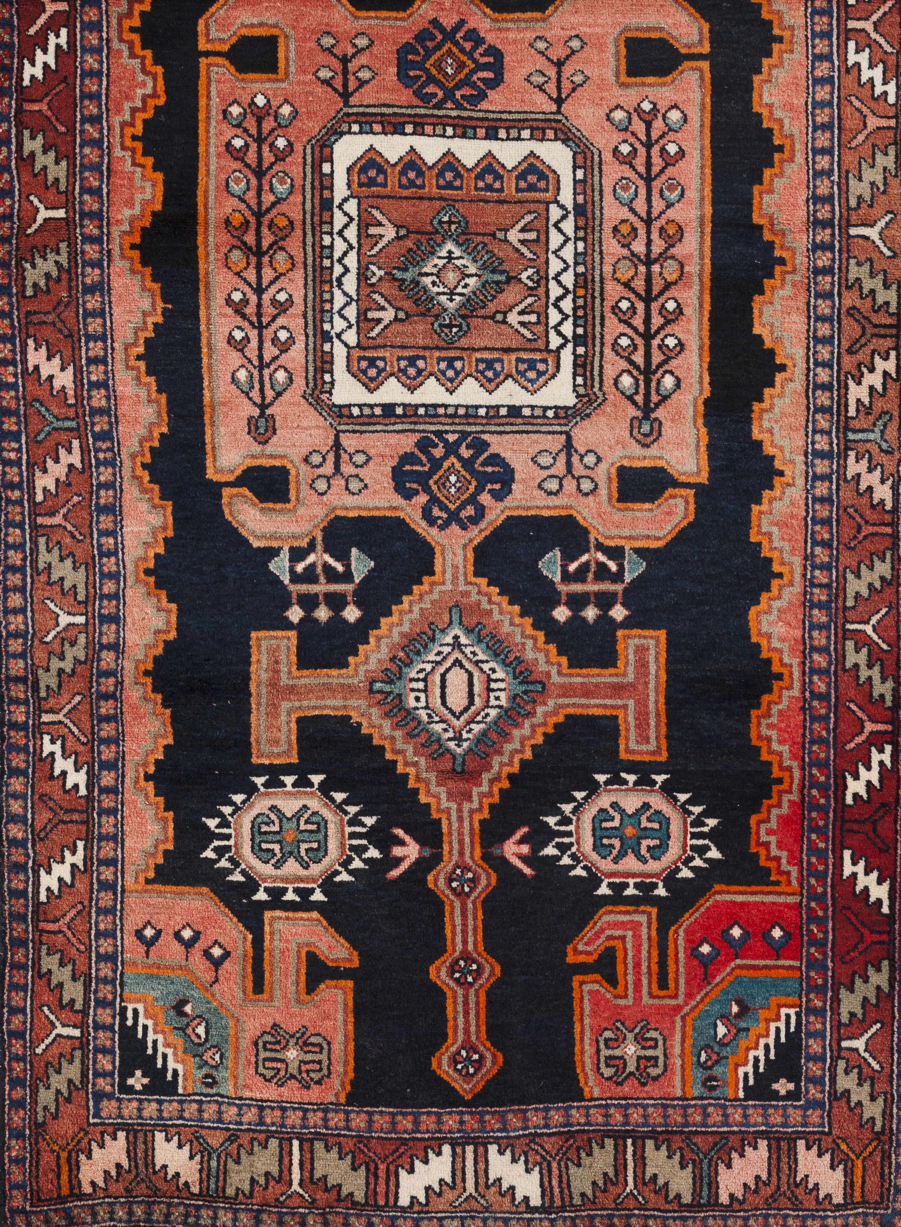 Em lã e algodão de desenho geométrico em tons de salmão, azul e verde