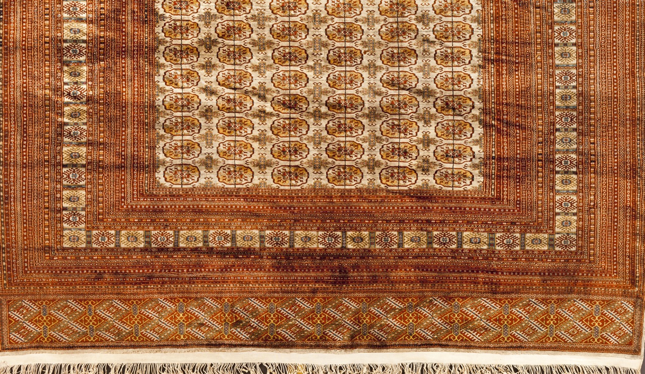 Em seda e algodão de desenho geométrico em tons de bordeaux, azul, amarelo e verde