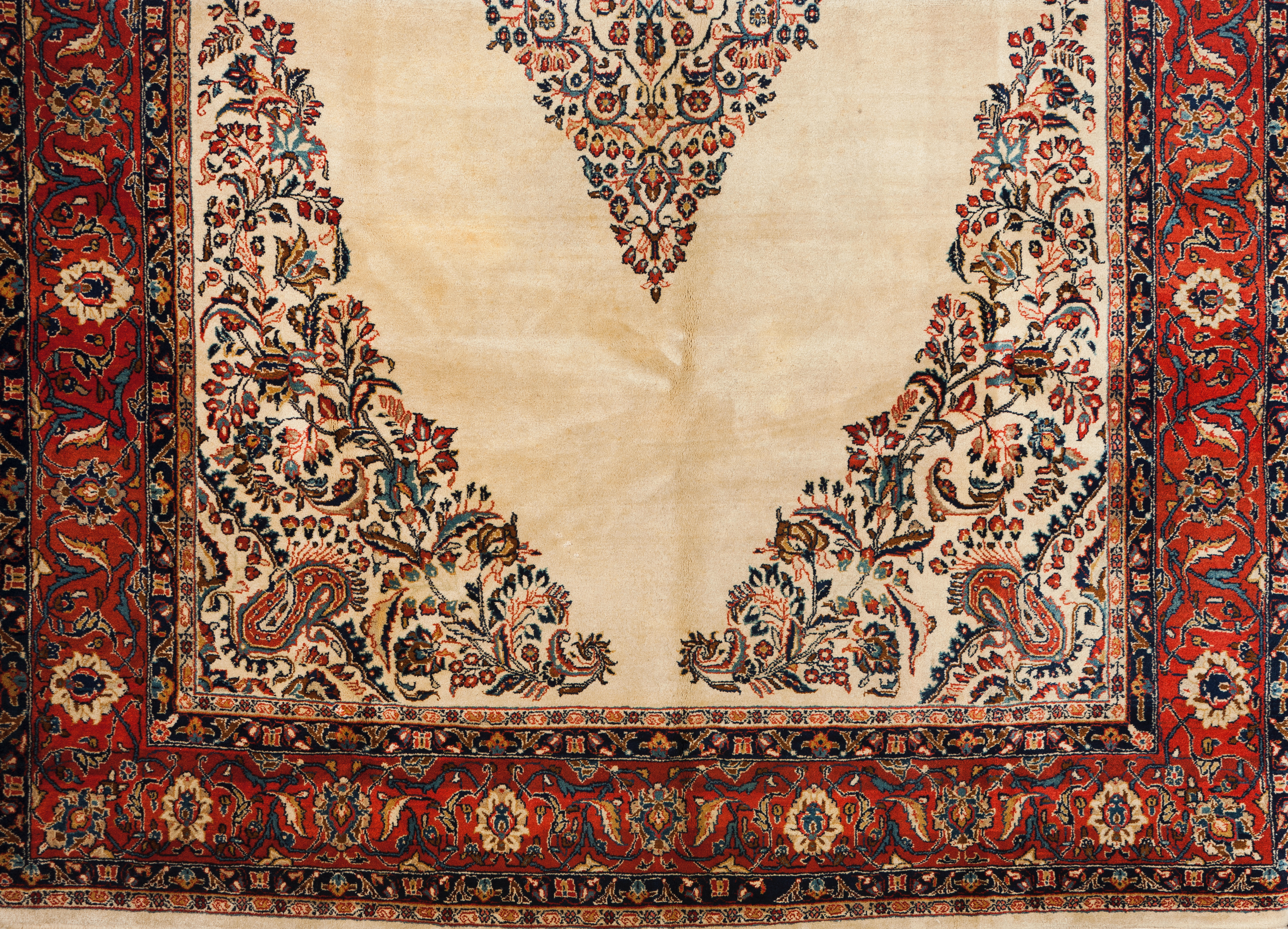 Em lã e algodão com desenho geométrico e floral em tons de bordeaux. bege e azul