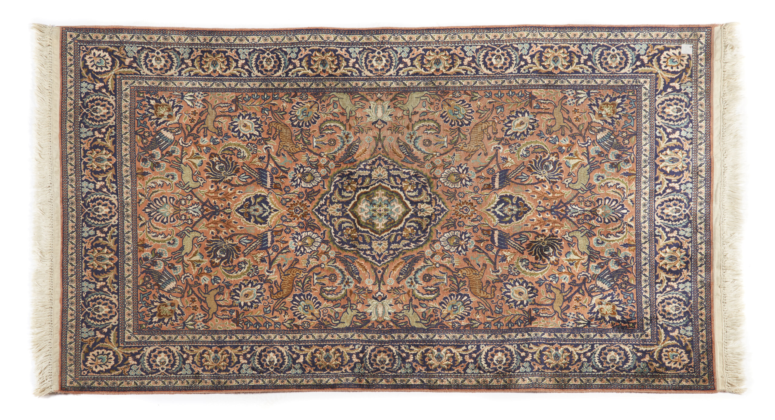 Decoração em tons de salmão, verde, azul e amarelo, representando motivos vegetalistas e animais