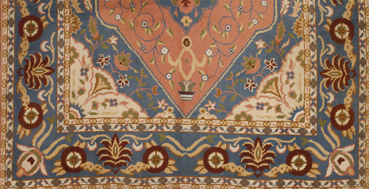 Em lã e algodão de desenho floral com medalhão ao centro, em tons azuis, rosa e bege