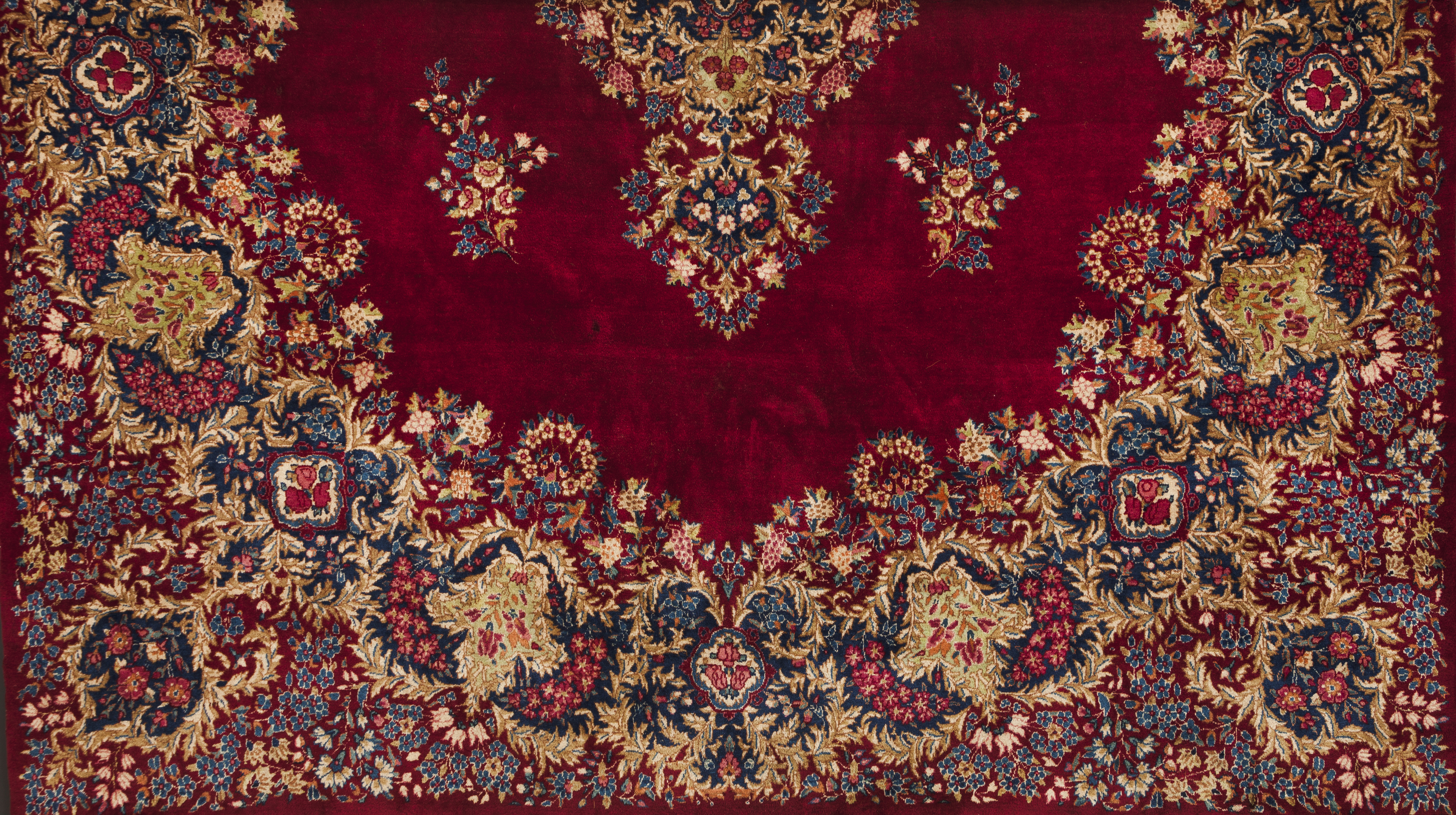 Em lã e algodão com desenho floral em tons de bege, azul e bordeaux
