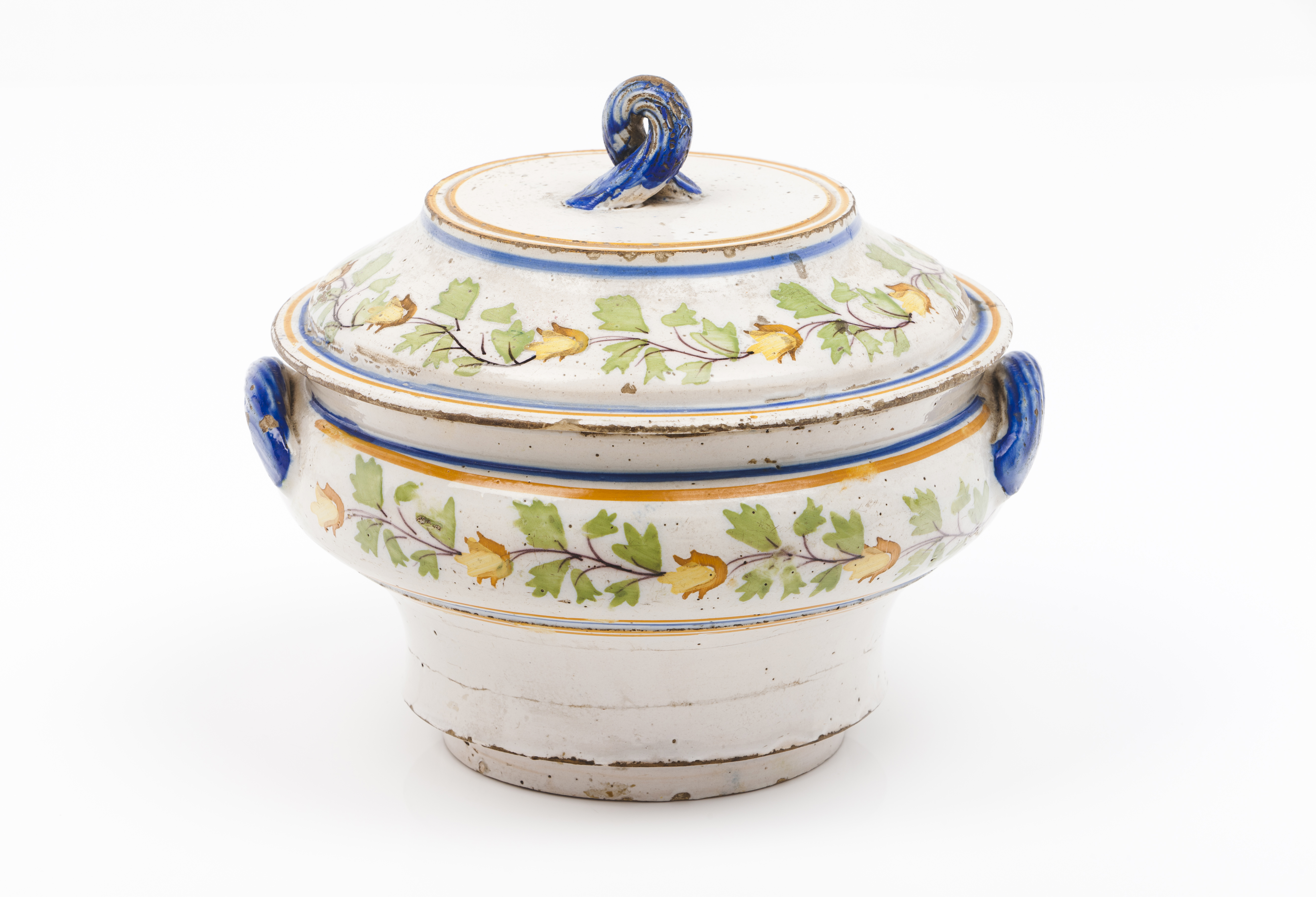 Decoração policromada em tons de verde, amarelo, azul e vinoso