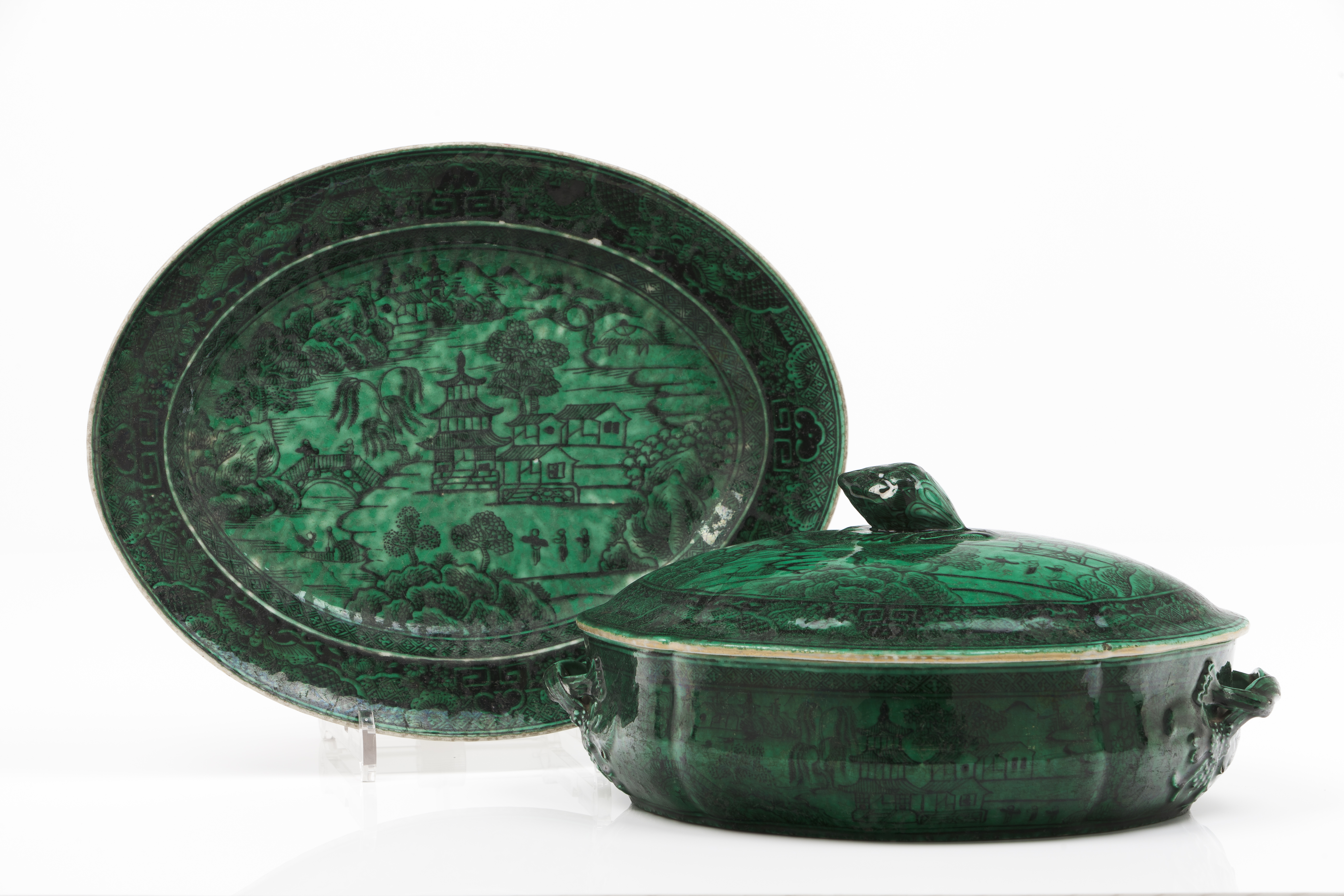 Decoração com esmaltes da Família Negra representando paisagem fluvial com figuras e pagodes