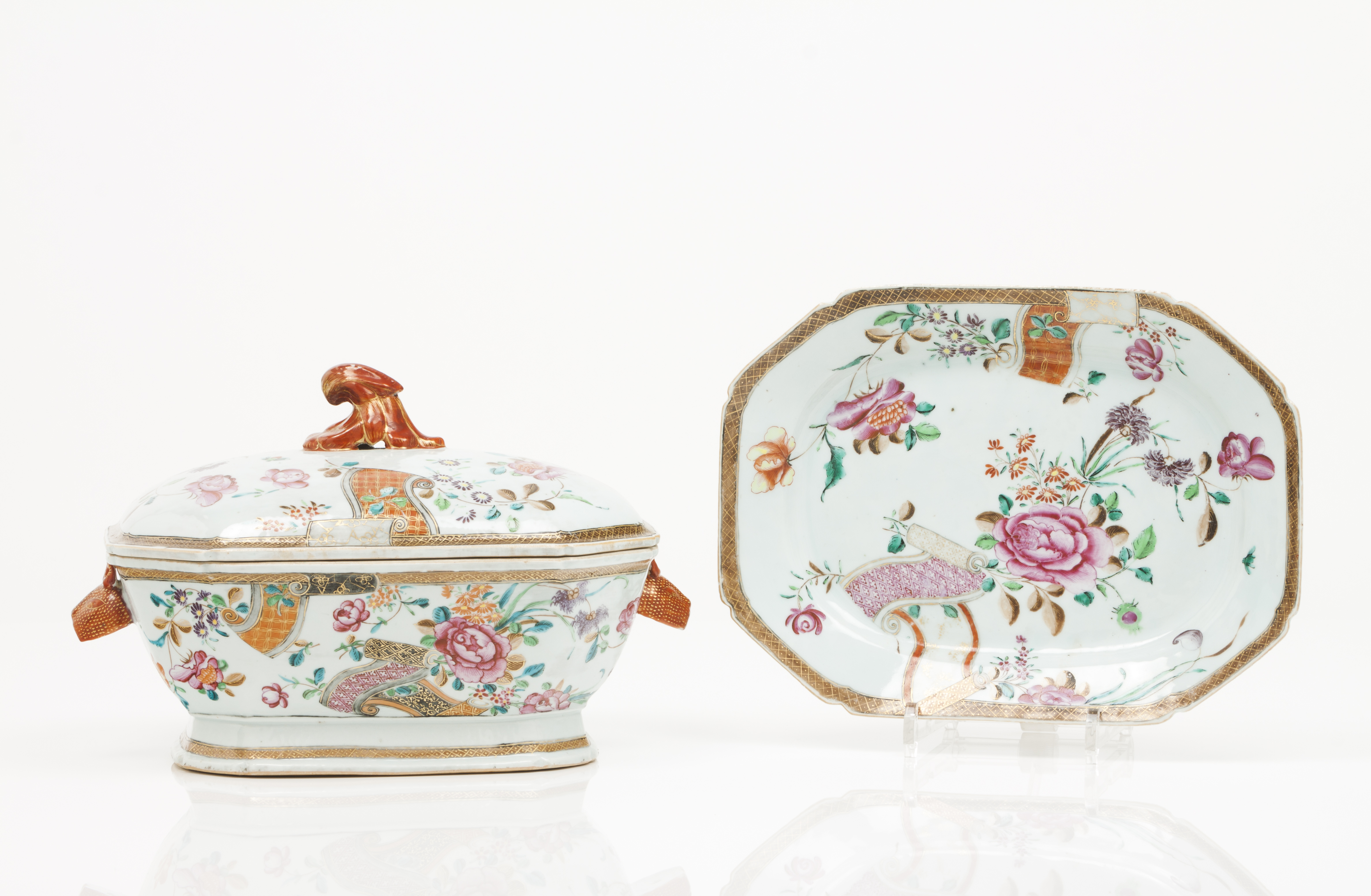 Decoração policromada com esmaltes da Família Rosa representando motivos florais e scrolls