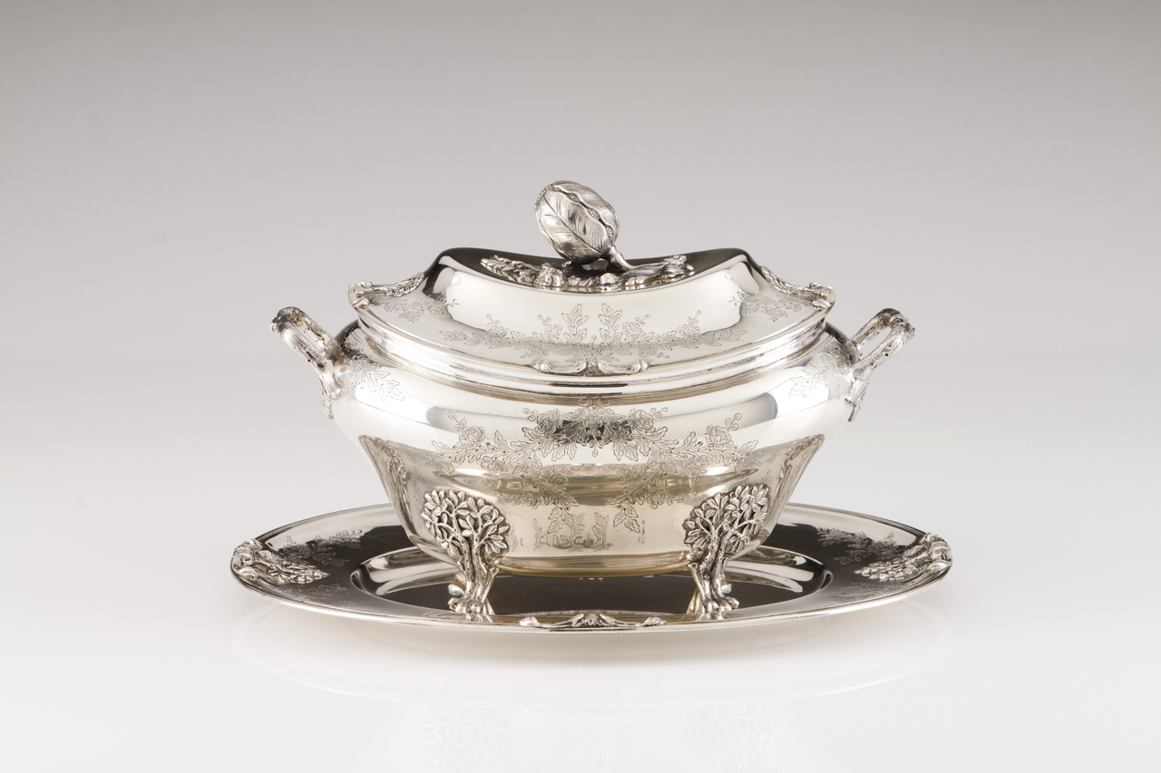 Corpo oval assente sobre 4 pés representando árvores, corpo com decoração floral gravada e pomo da tampa em forma de fruto com folhagem