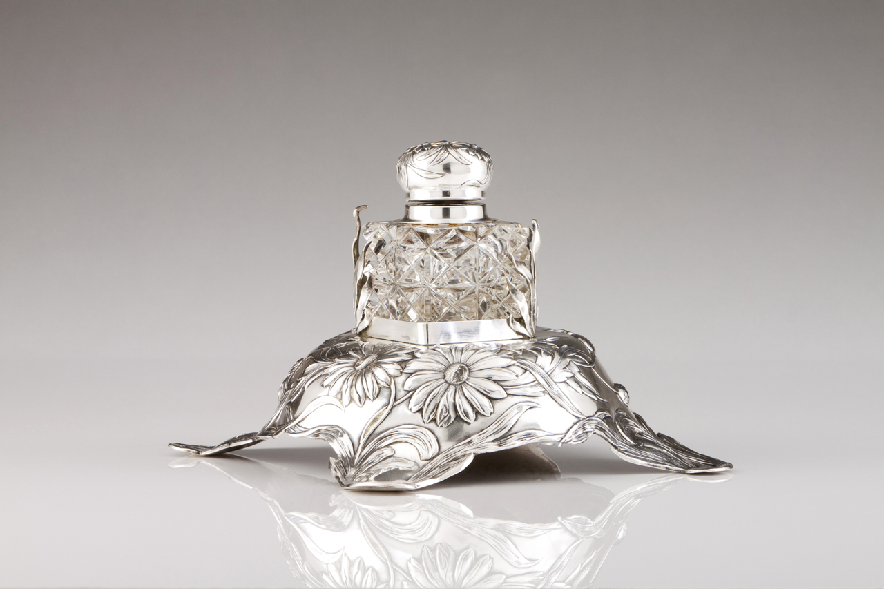 Base com decoração relevada Arte Nova com flores e elementos vegetalistas assente sobre quatro pés, recipiente em cristal lapidado