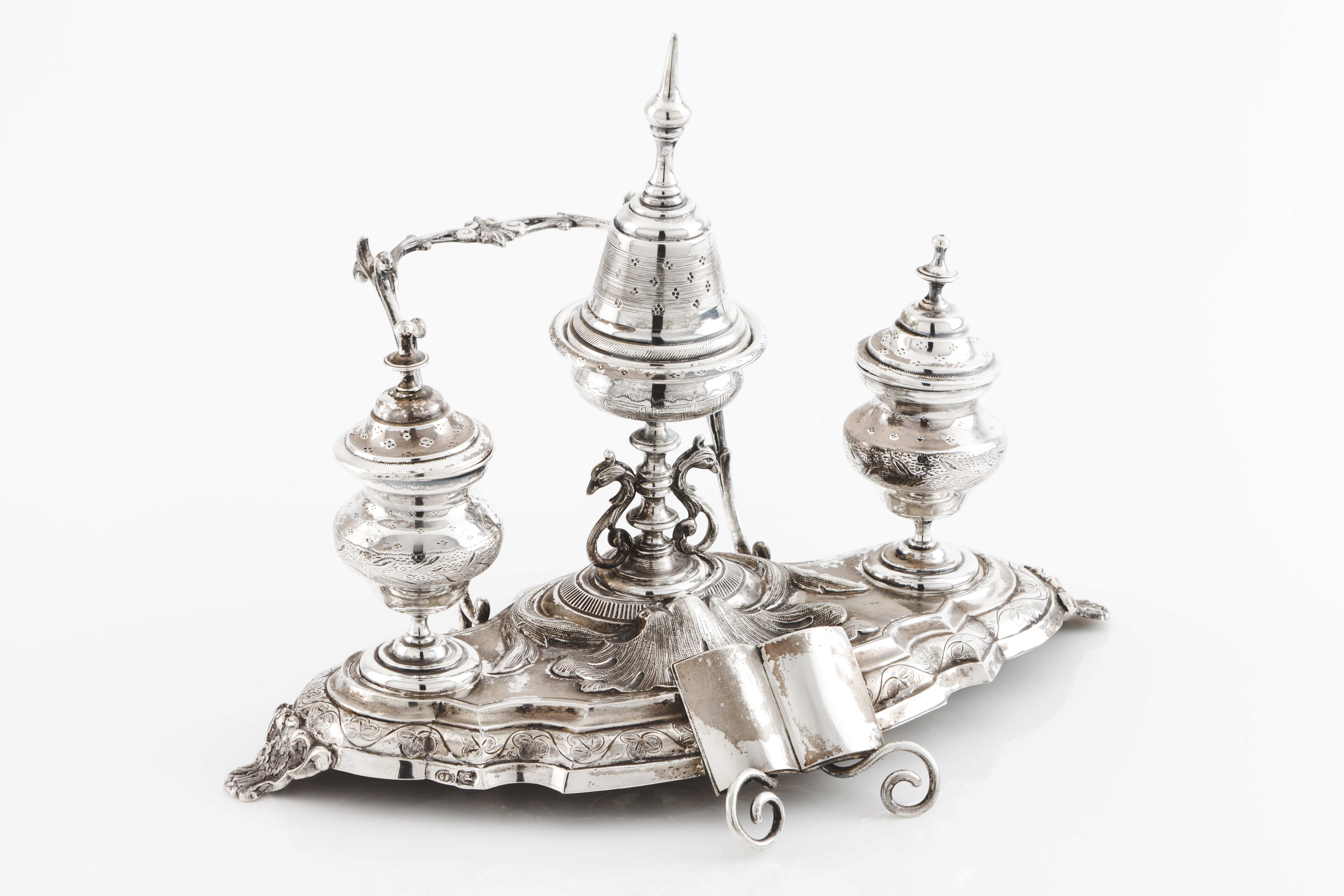 Composto por sineta sobre taça suportada por duas figuras de animais fantasiosos, areeiro e recipiente para tinta com duas almas em vidro