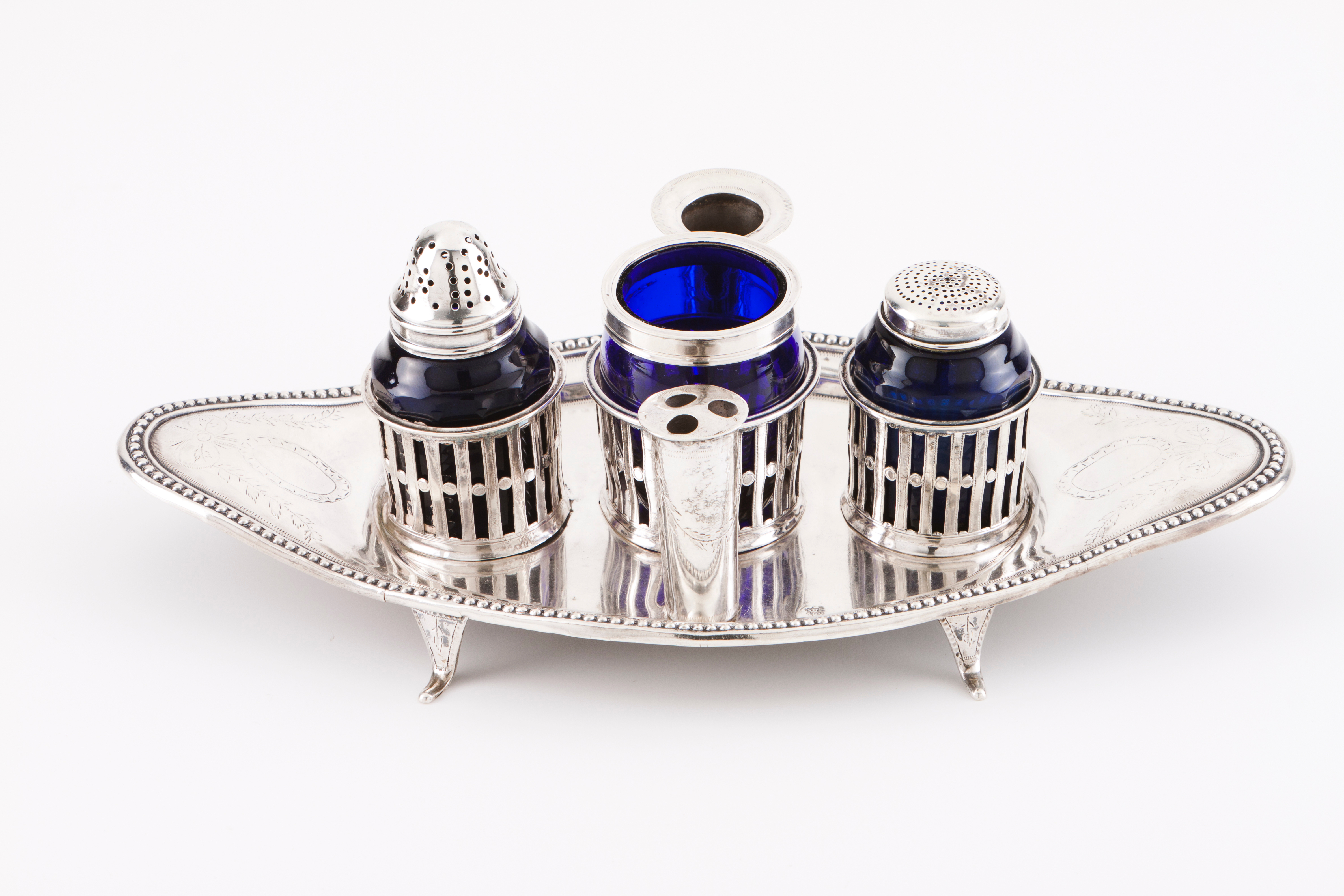 Bandeja em forma de naveta com bordo perlado, topos com medalhões gravados, assente sobre quatro pés