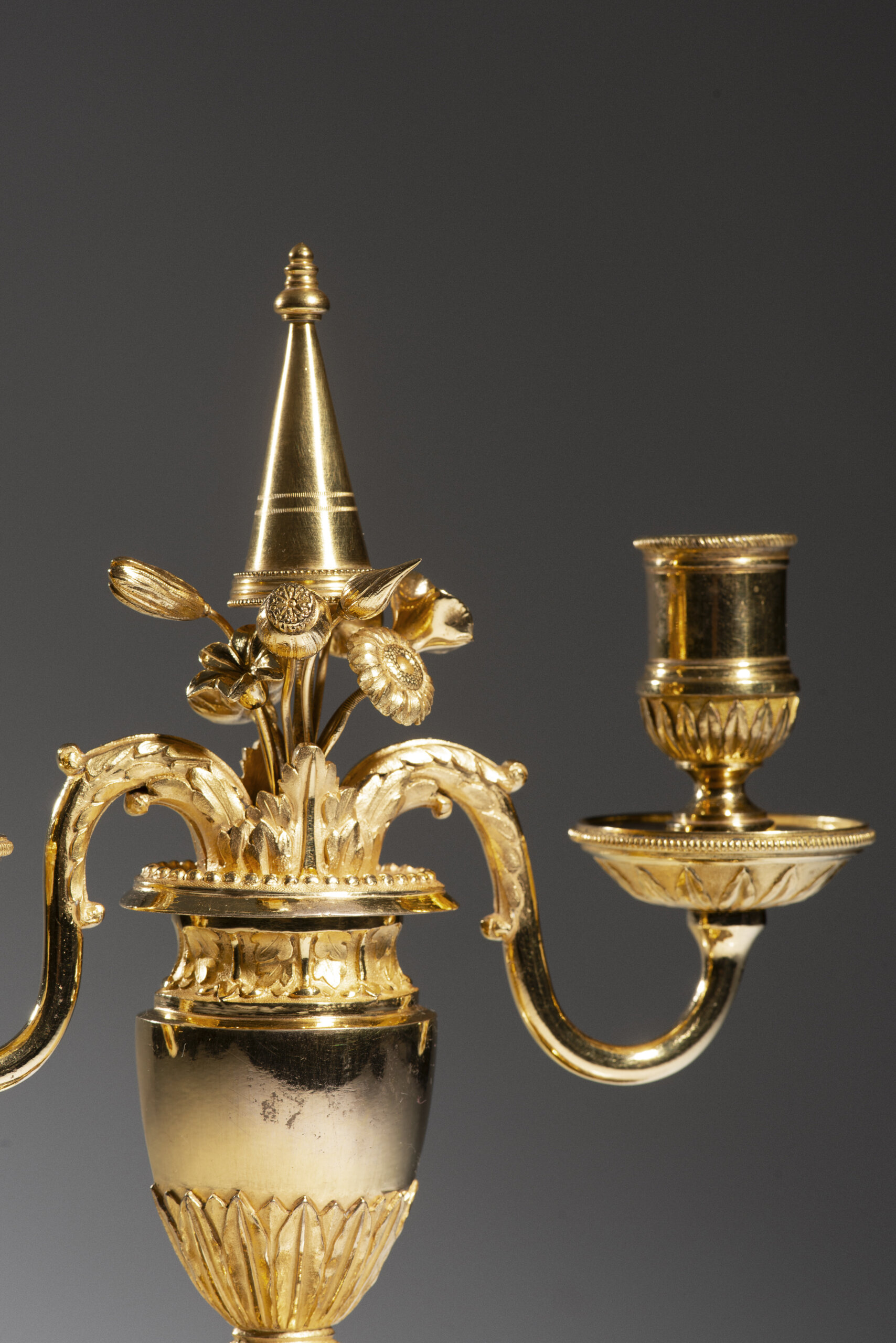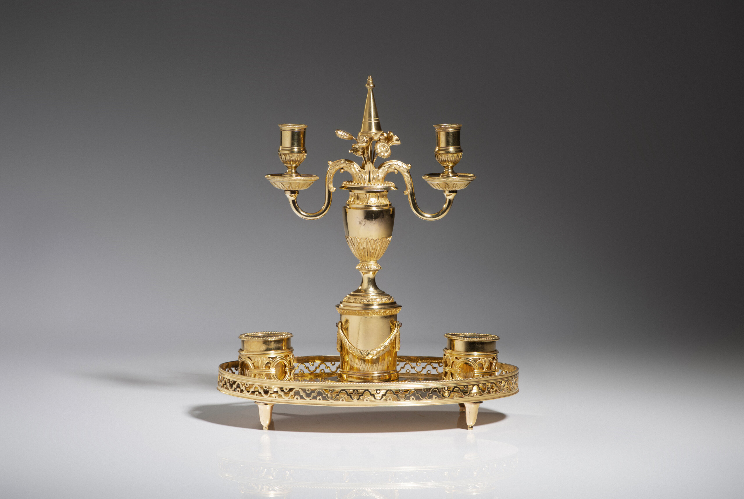 Ao centro, candelabro de dois braços em forma de cornucópias, com binets e bobèches em vidro, assente sobre vaso ático godronado com tampa em forma de pináculo, decorado com grinaldas de louro
