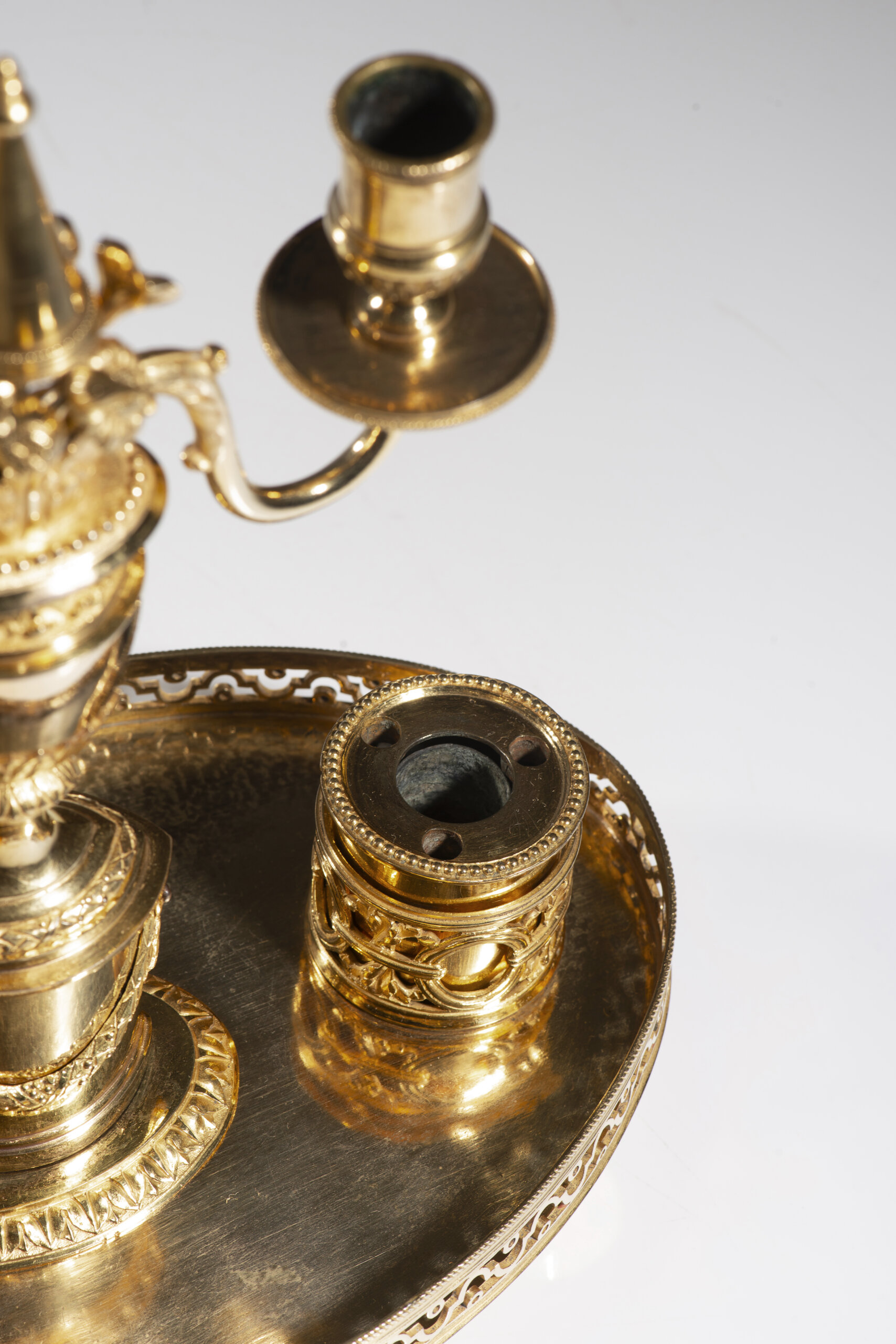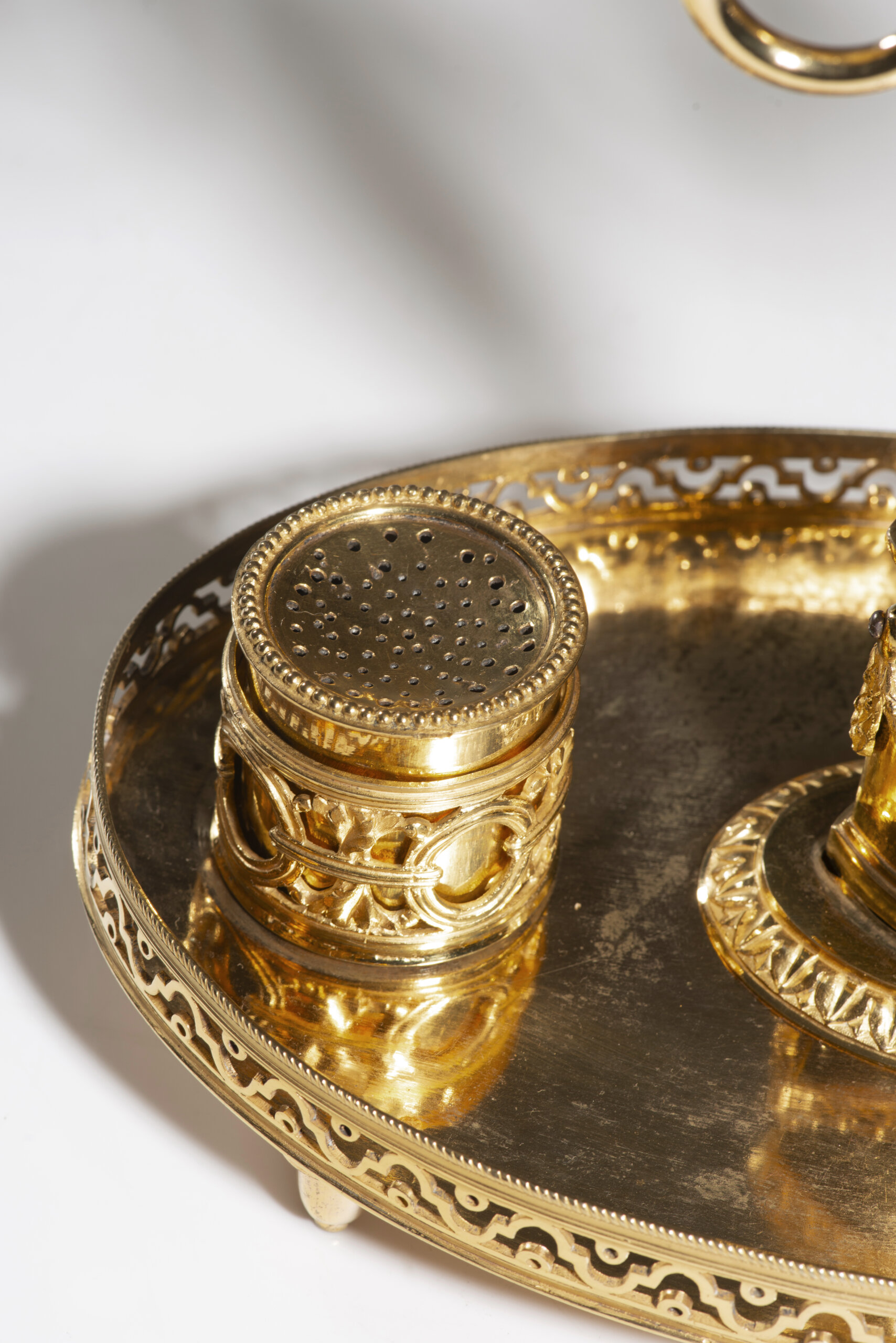 Ladeado por dois recipientes cilíndricos com tampas (um para tinta e outro para areia) ornamentados com festões e friso perlado