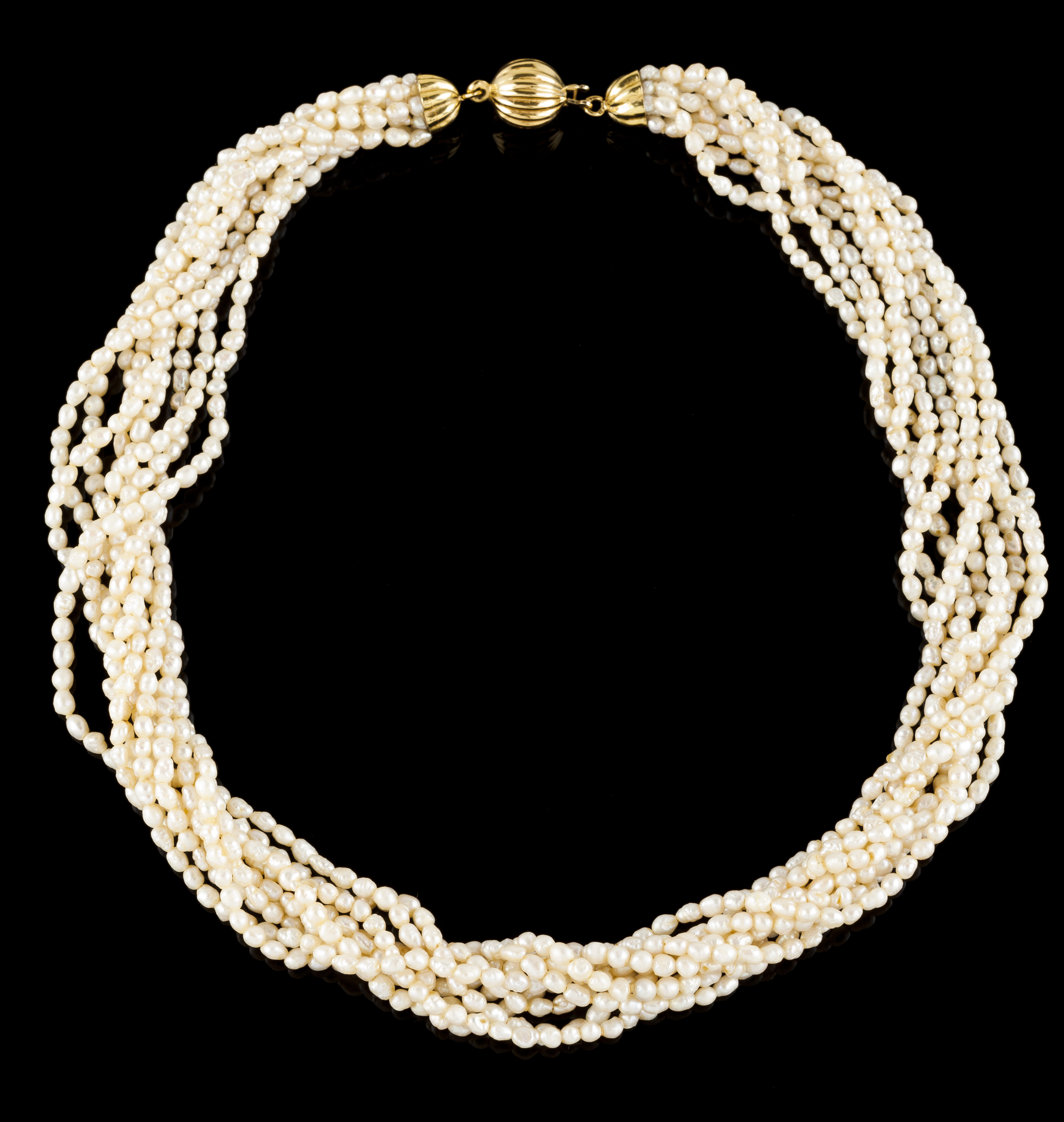 Bola estriada com duas calotes e 9 fiadas de pérolas de água doce